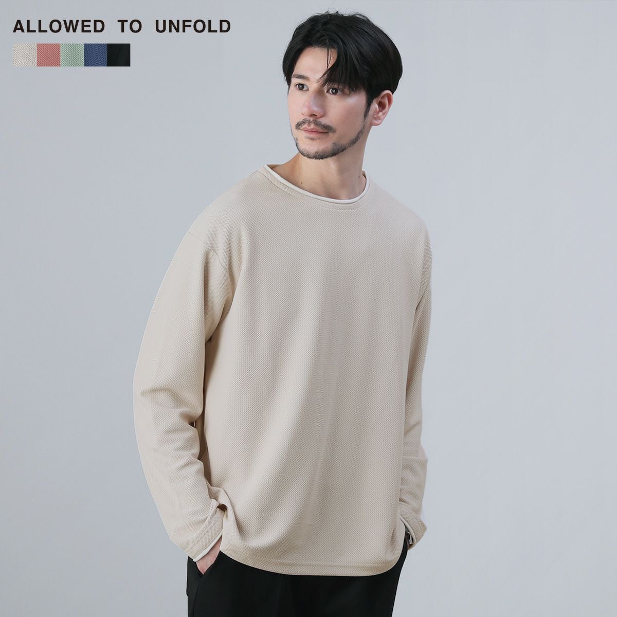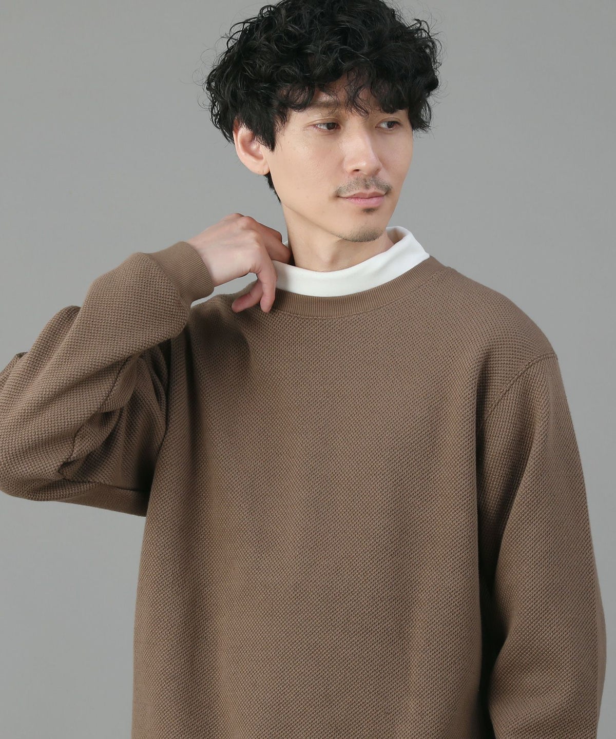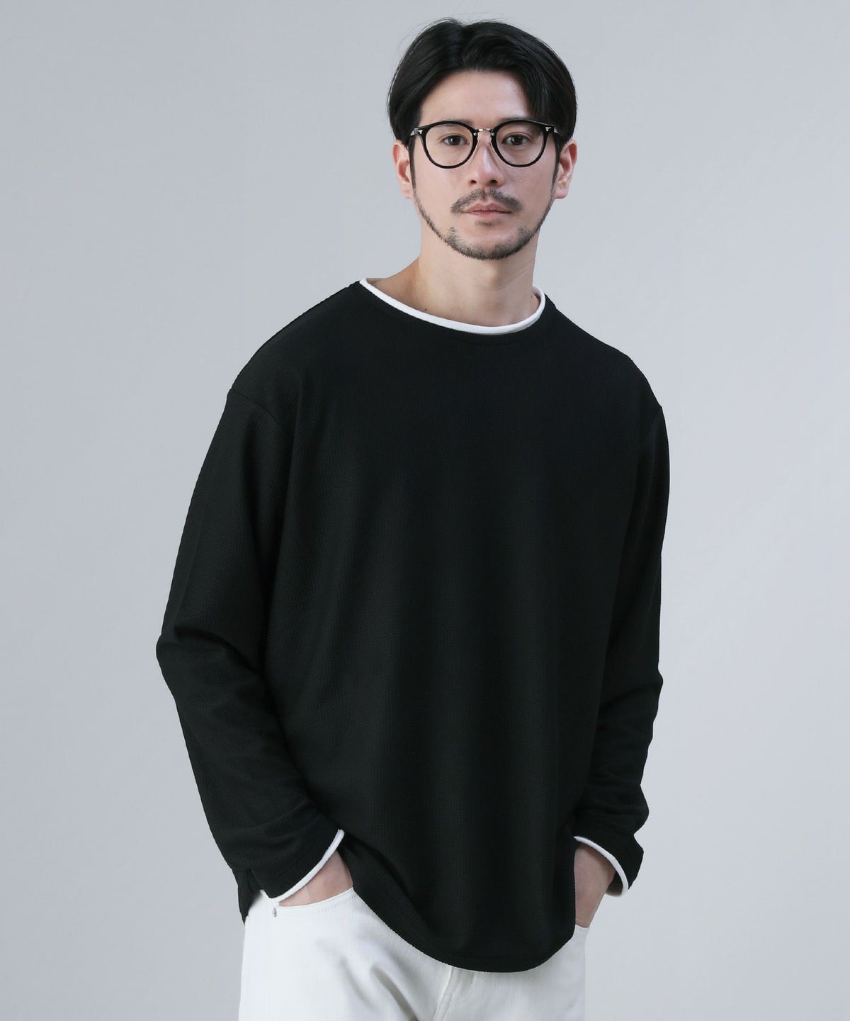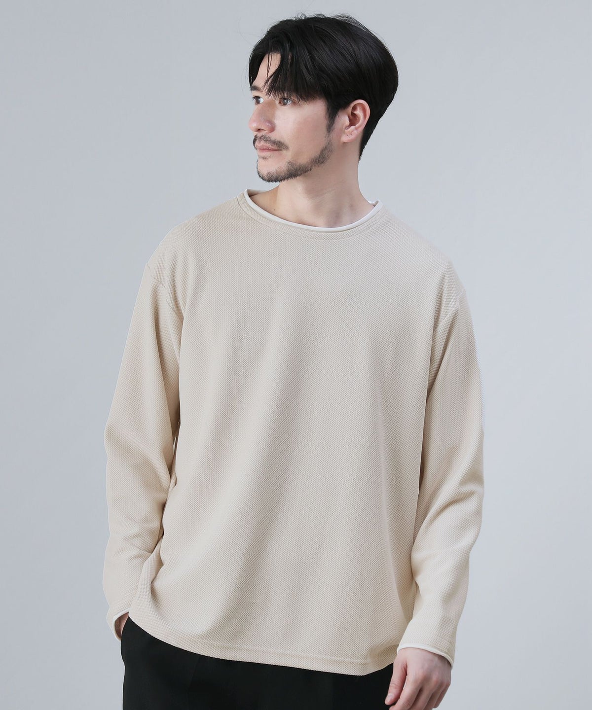 ジグザグ編みニットロールクルーネック長袖カットソー