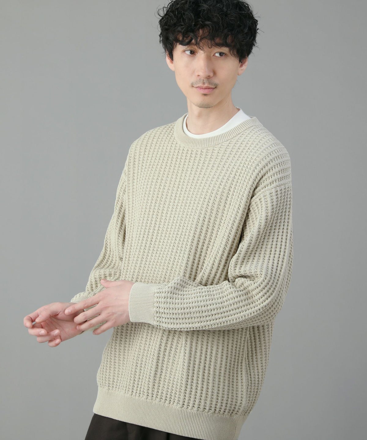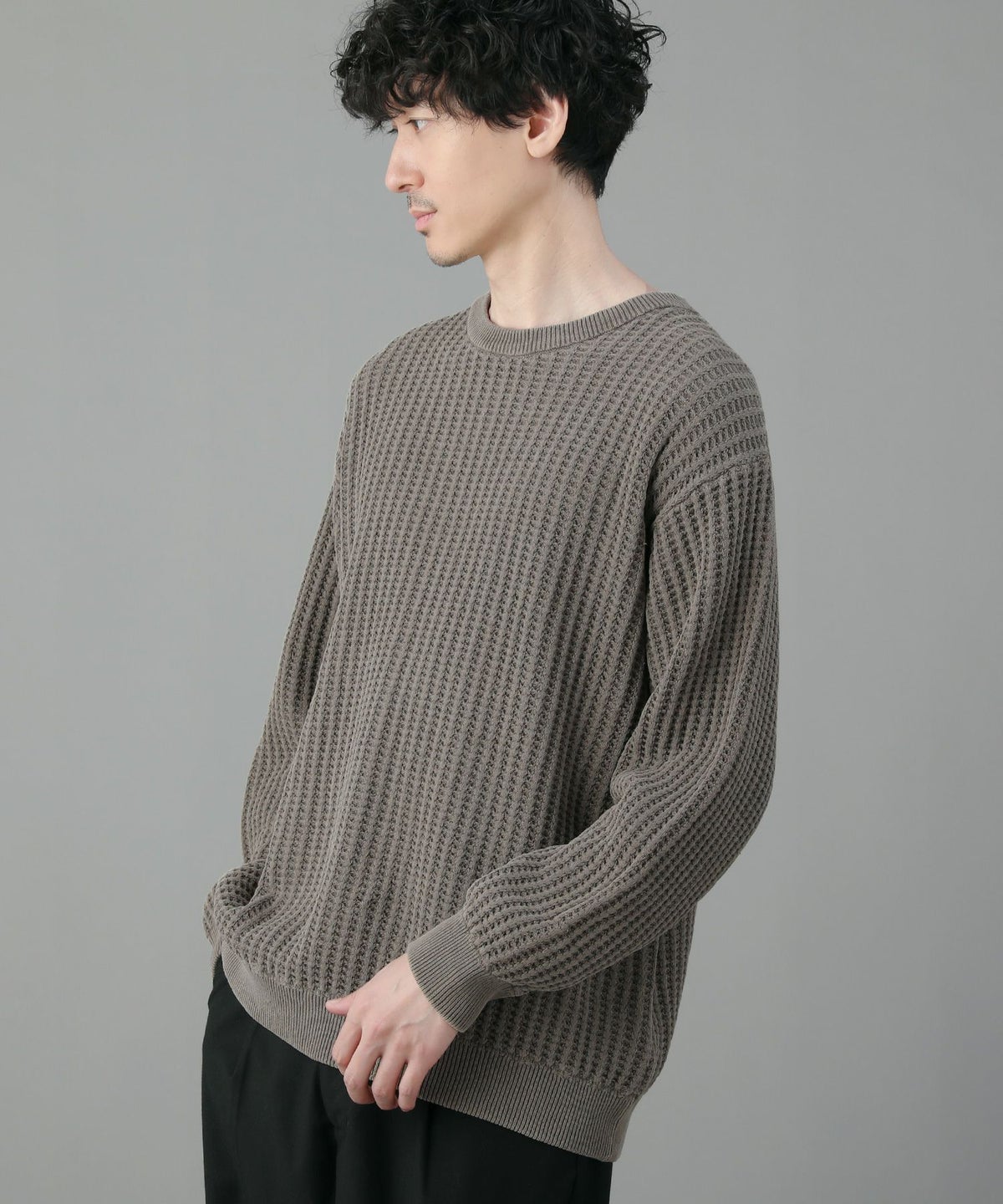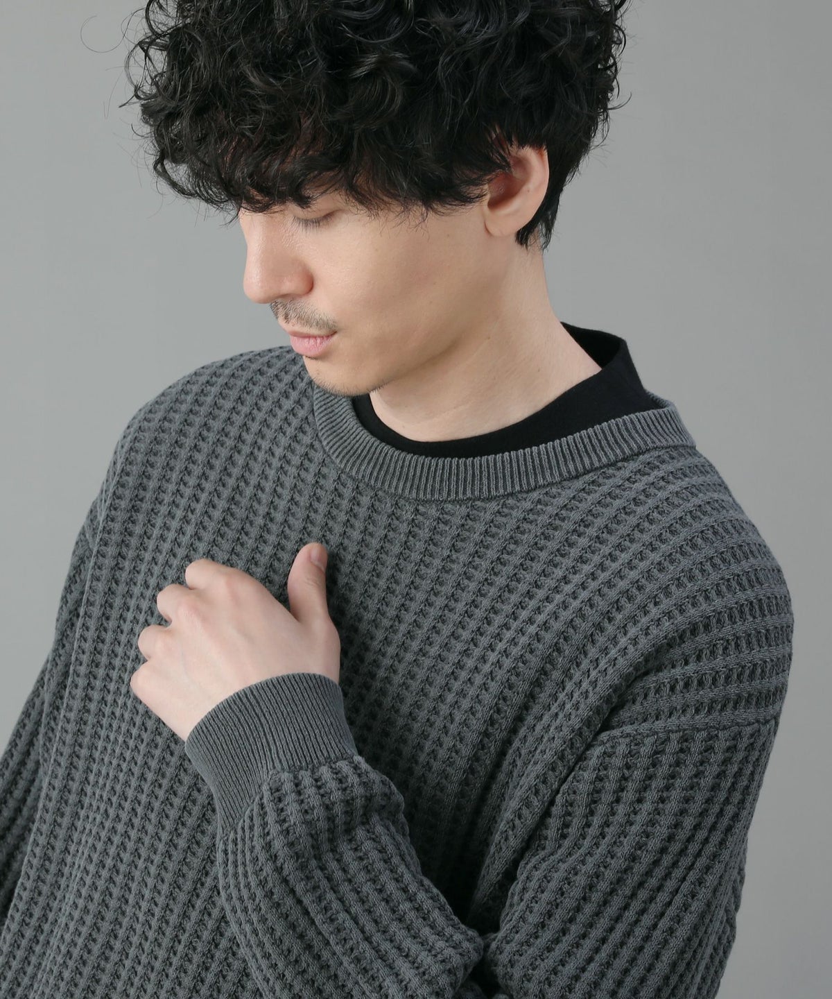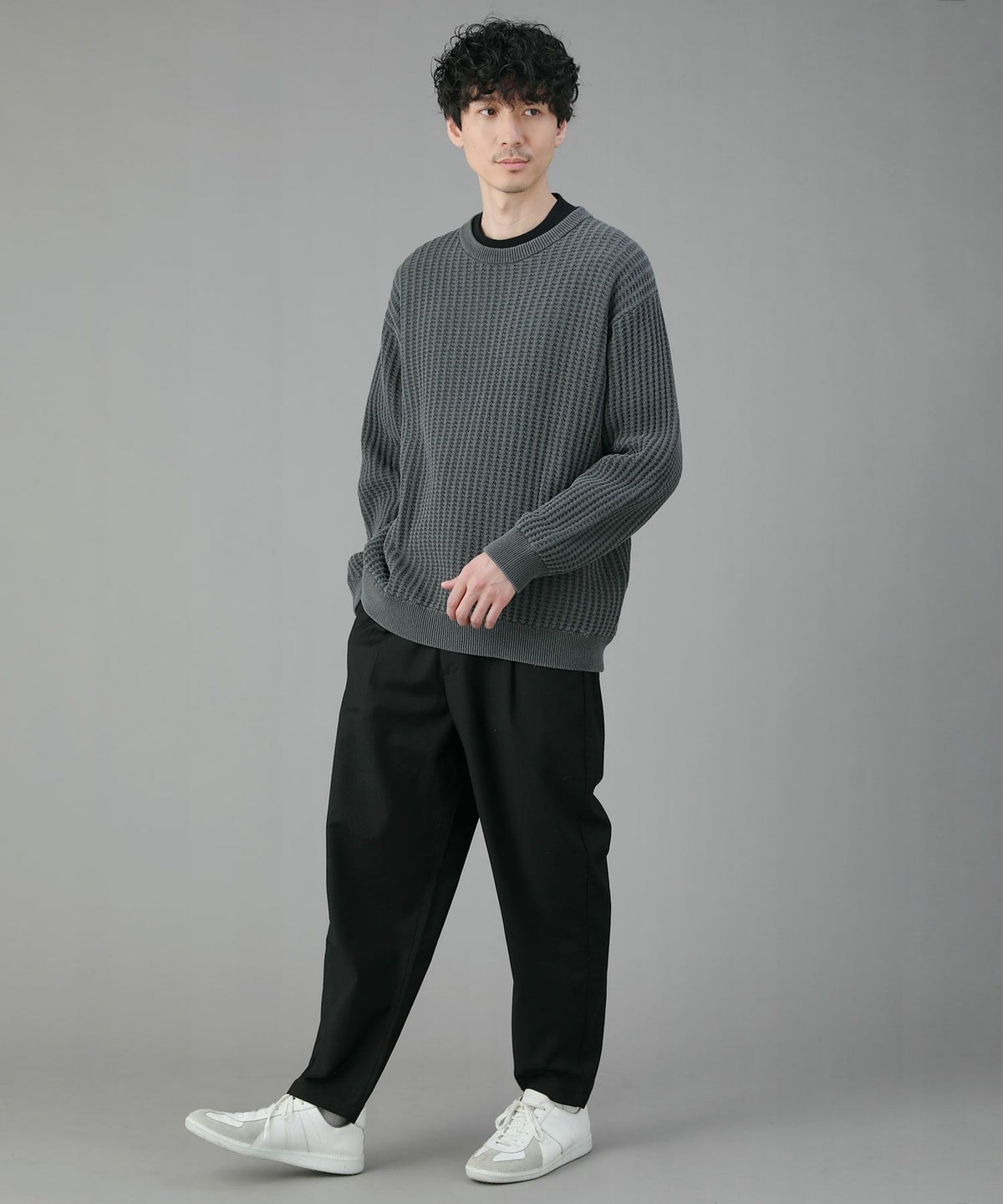 日本製ビッグワッフルサドルショルダーガゼットクルーネックXLニットソー