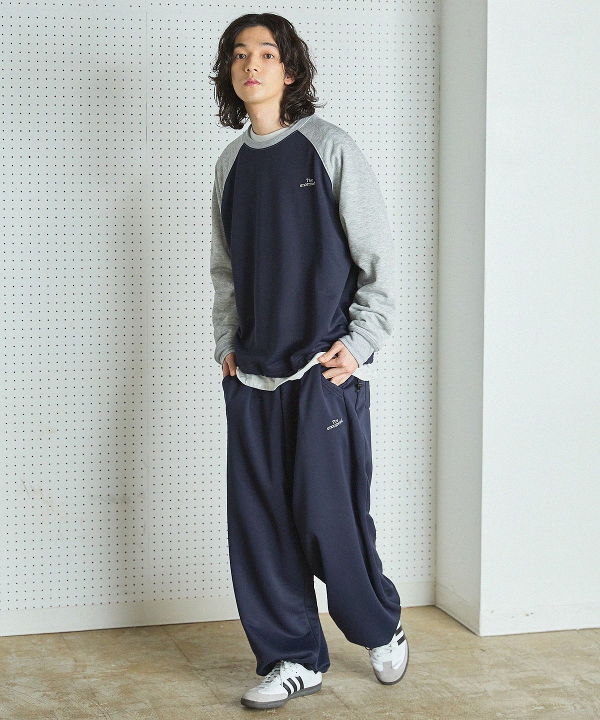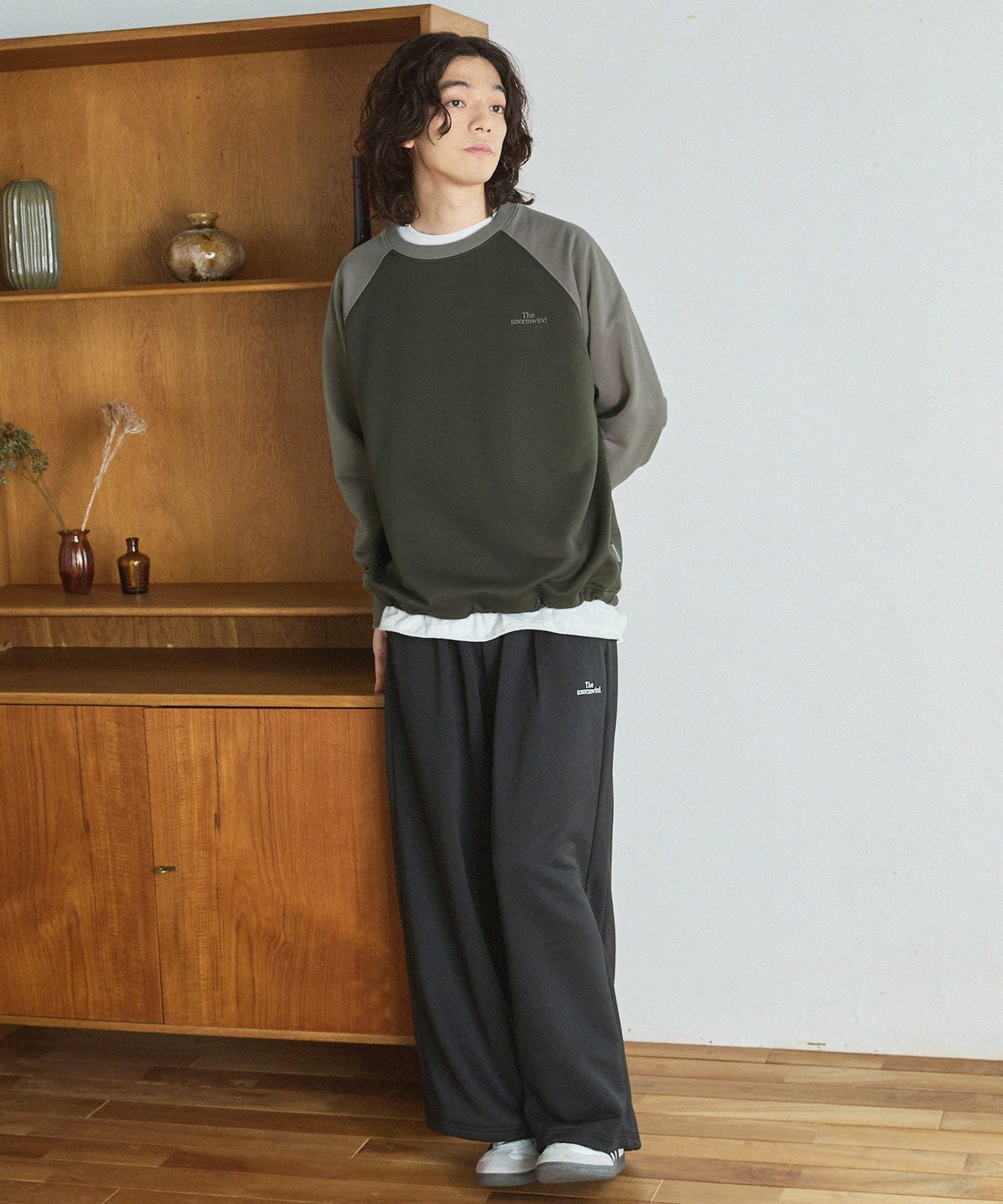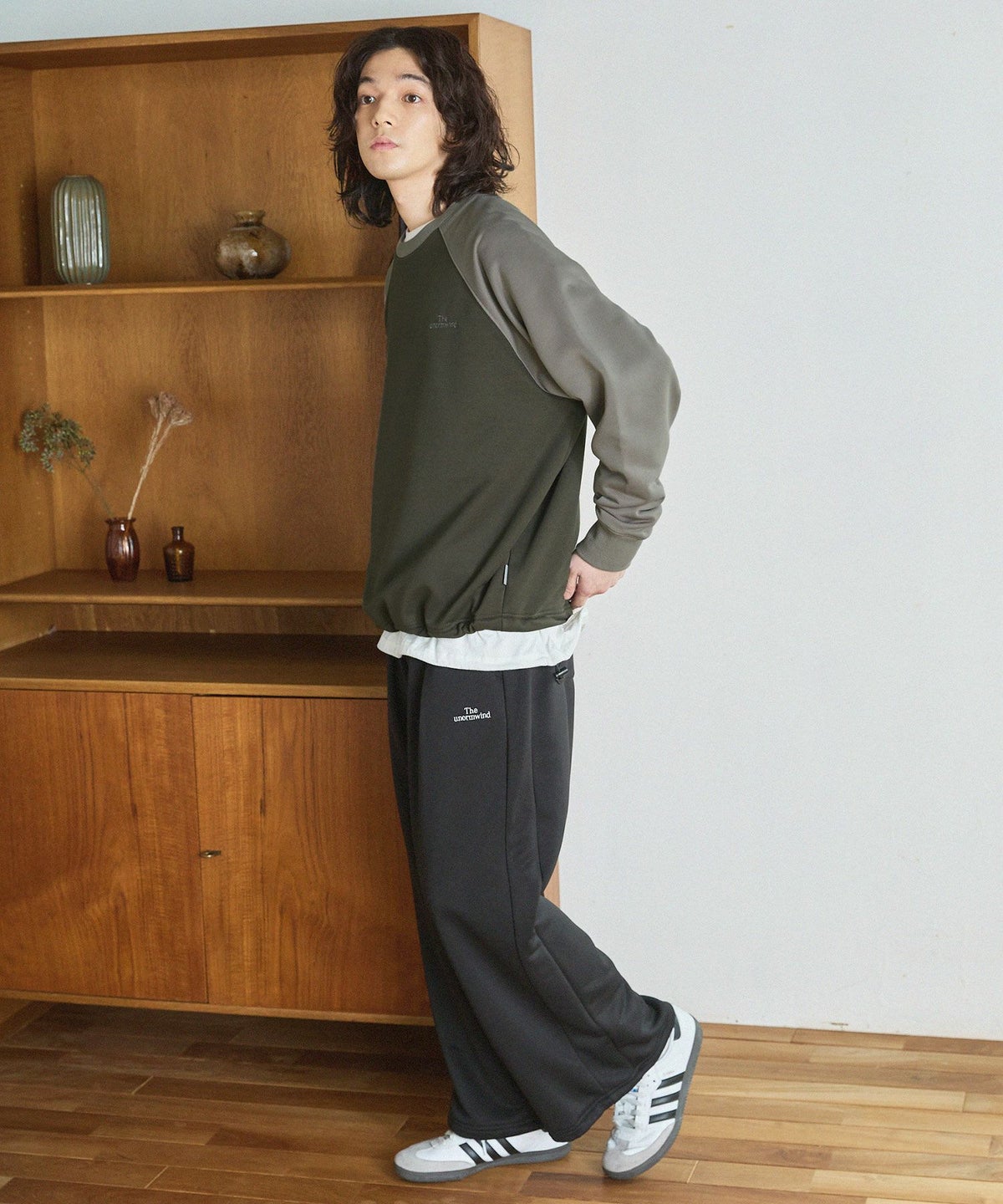 【セットアップ対応】ブランド刺繍ロゴ裾ドローコードラグラン配色長袖アーバンスウェット