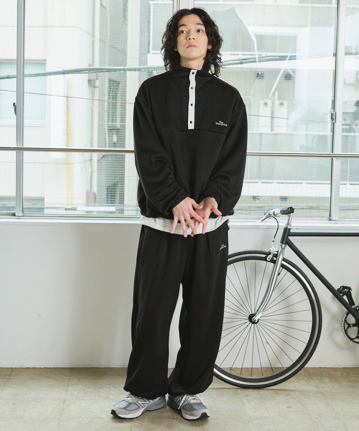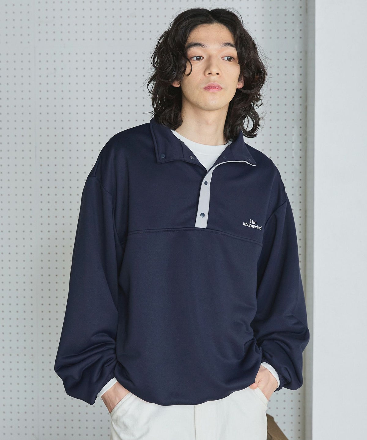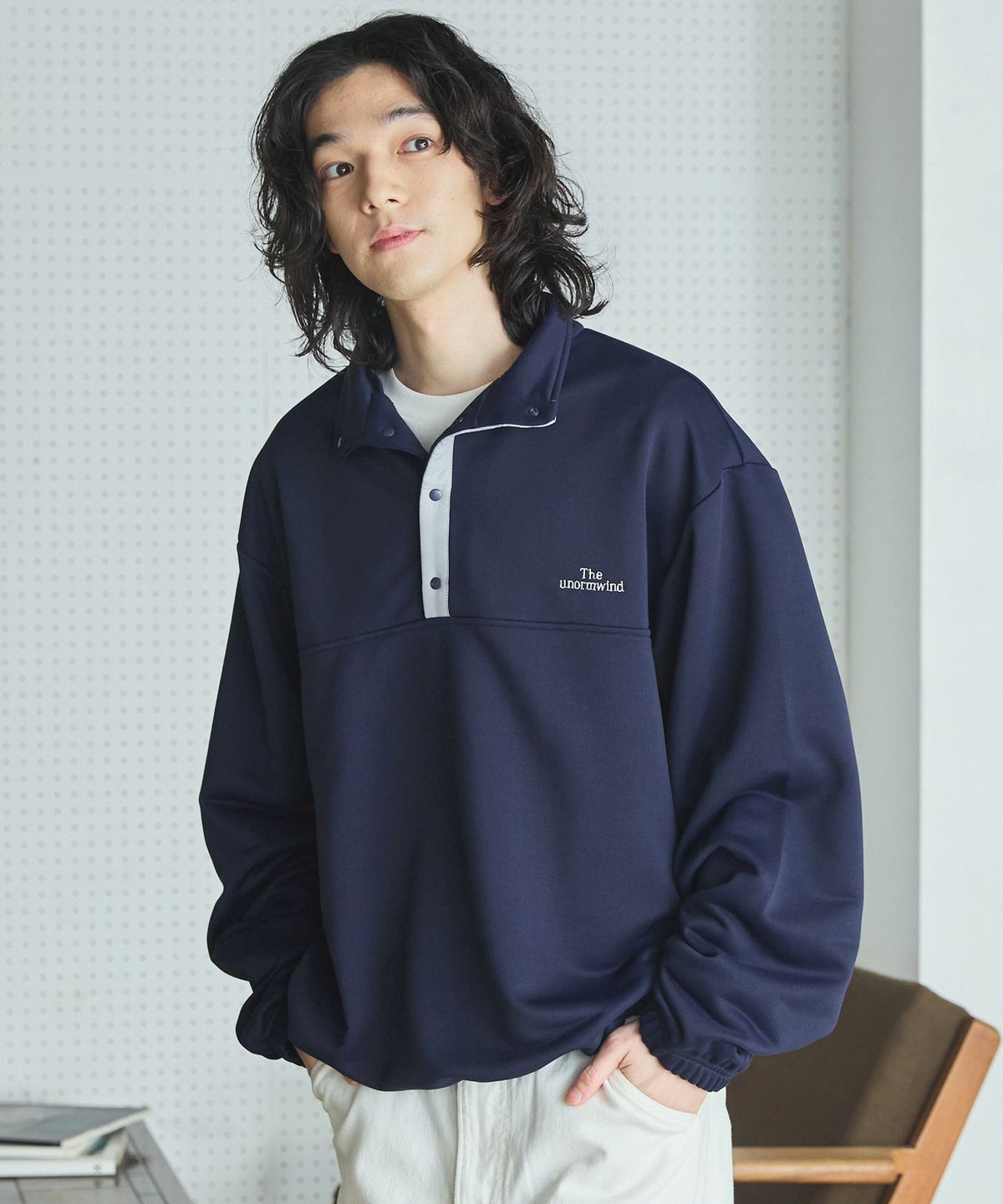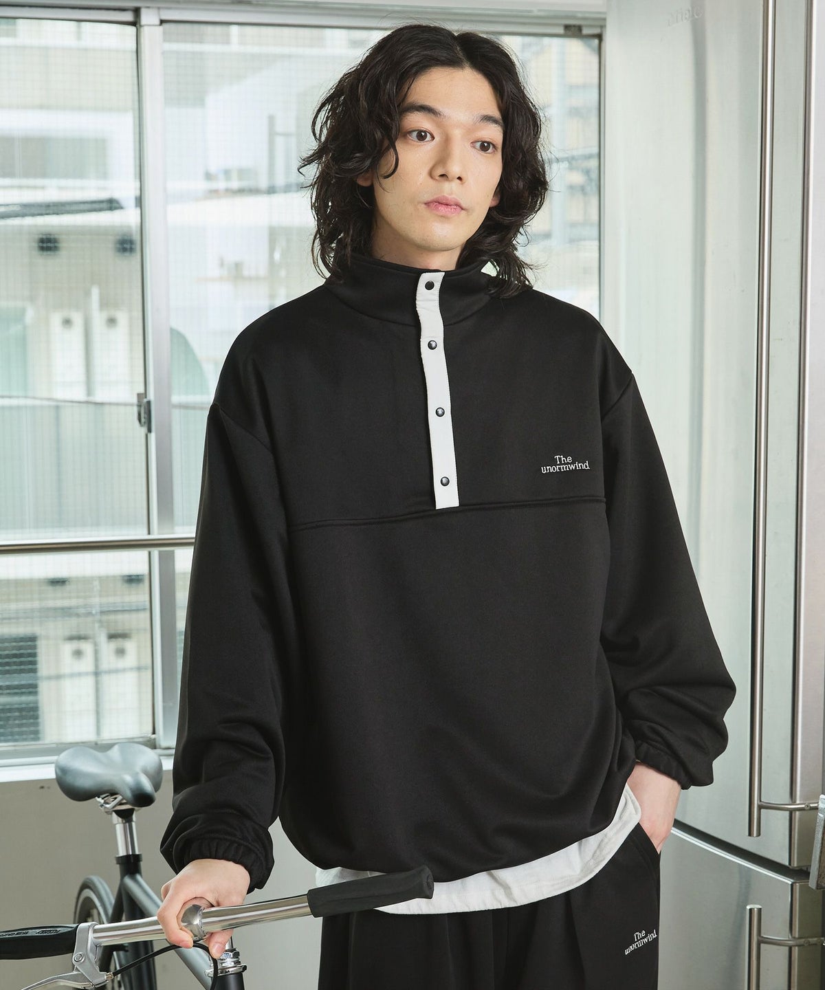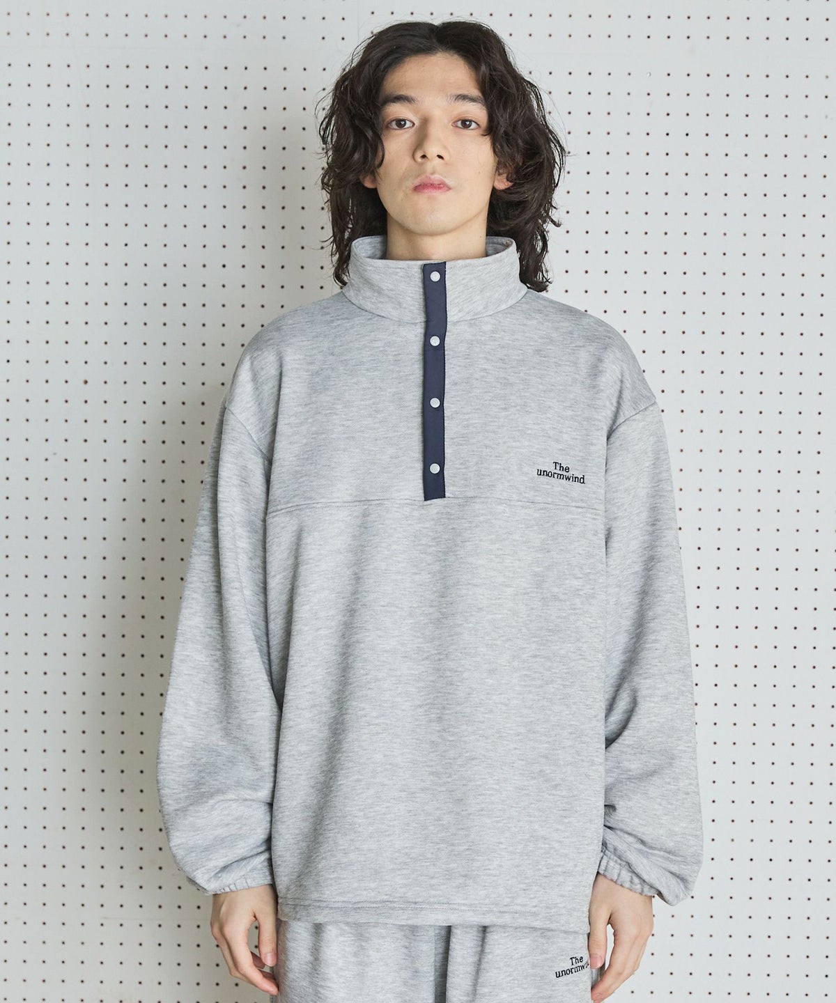 【セットアップ対応】ブランド刺繍ロゴ裾ドローコードラグラン配色長袖ハーフボタンアーバンスウェット