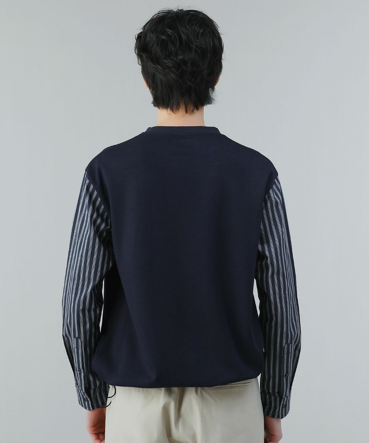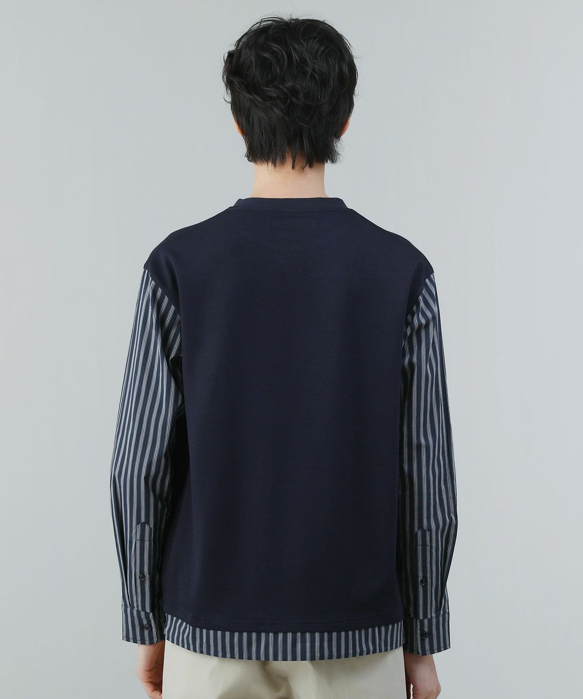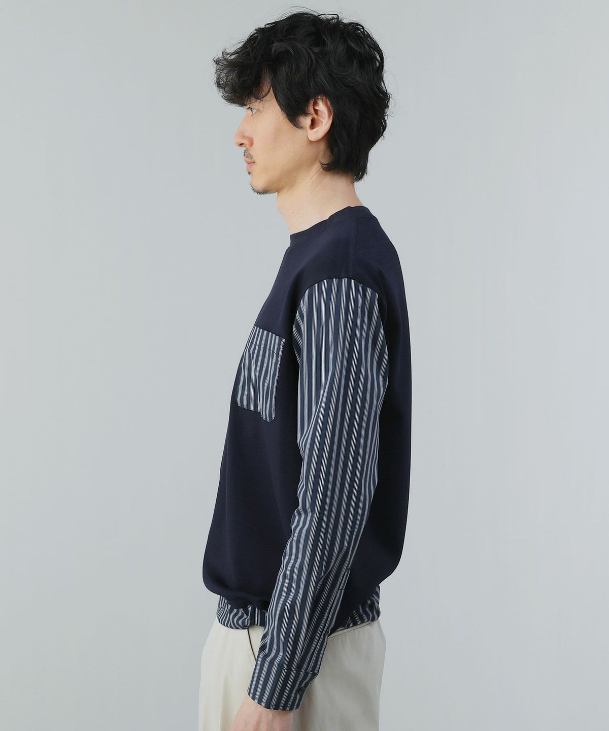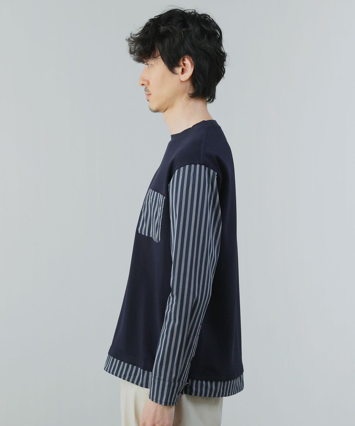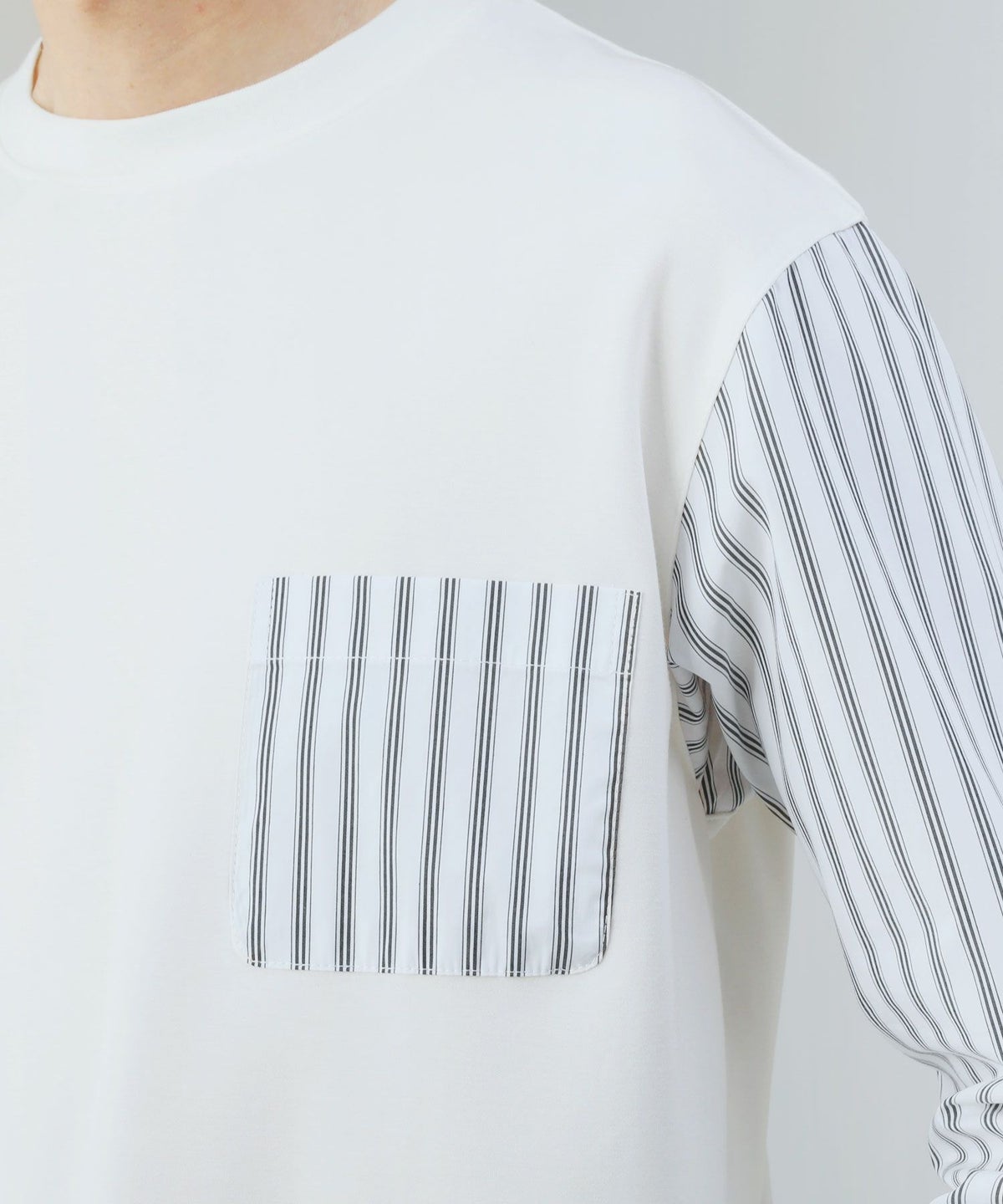 ポンチ×ストライプ布帛切り替え長袖Tシャツ