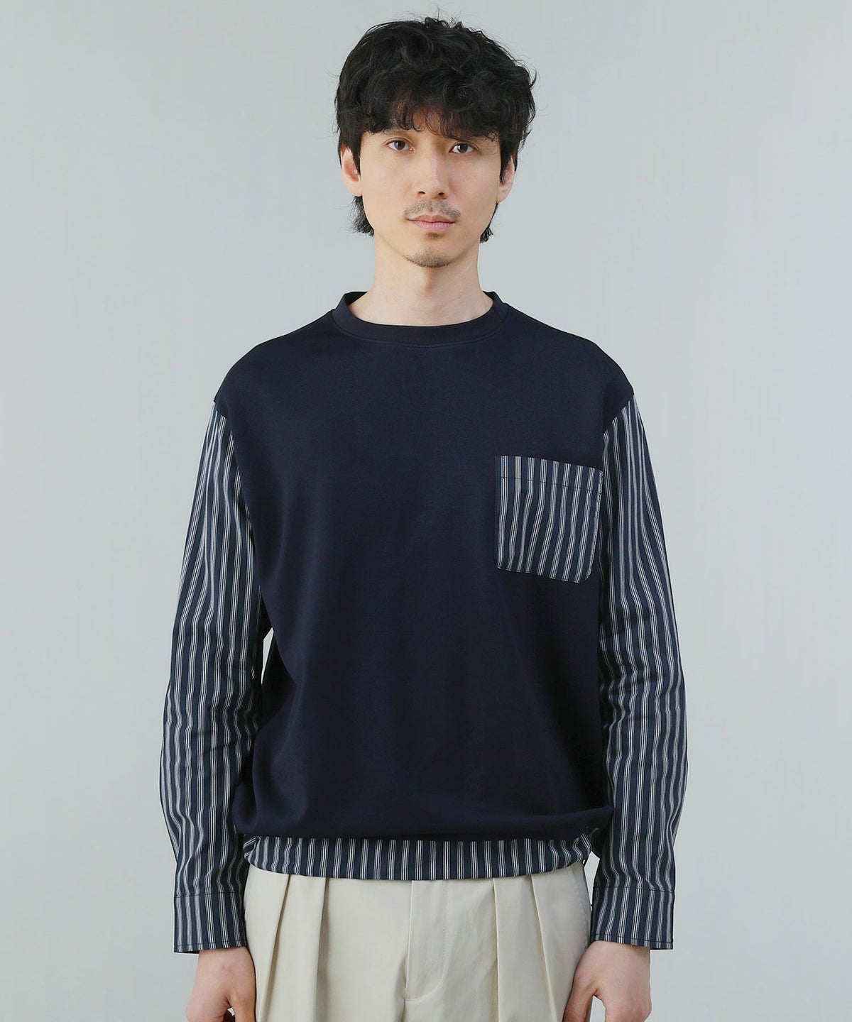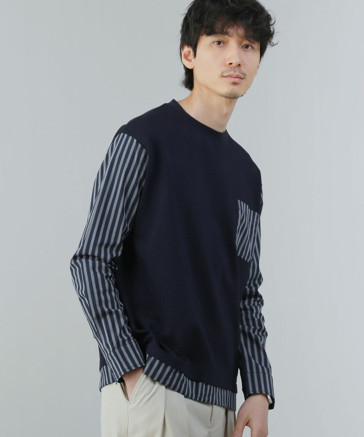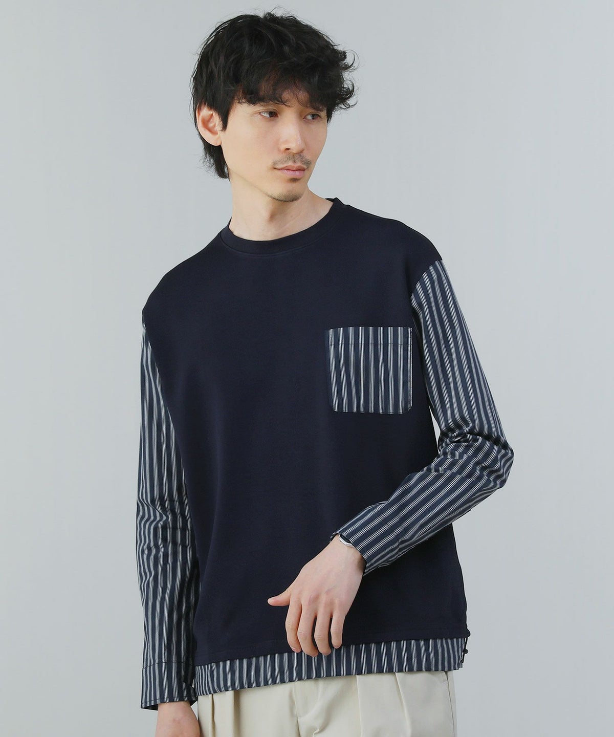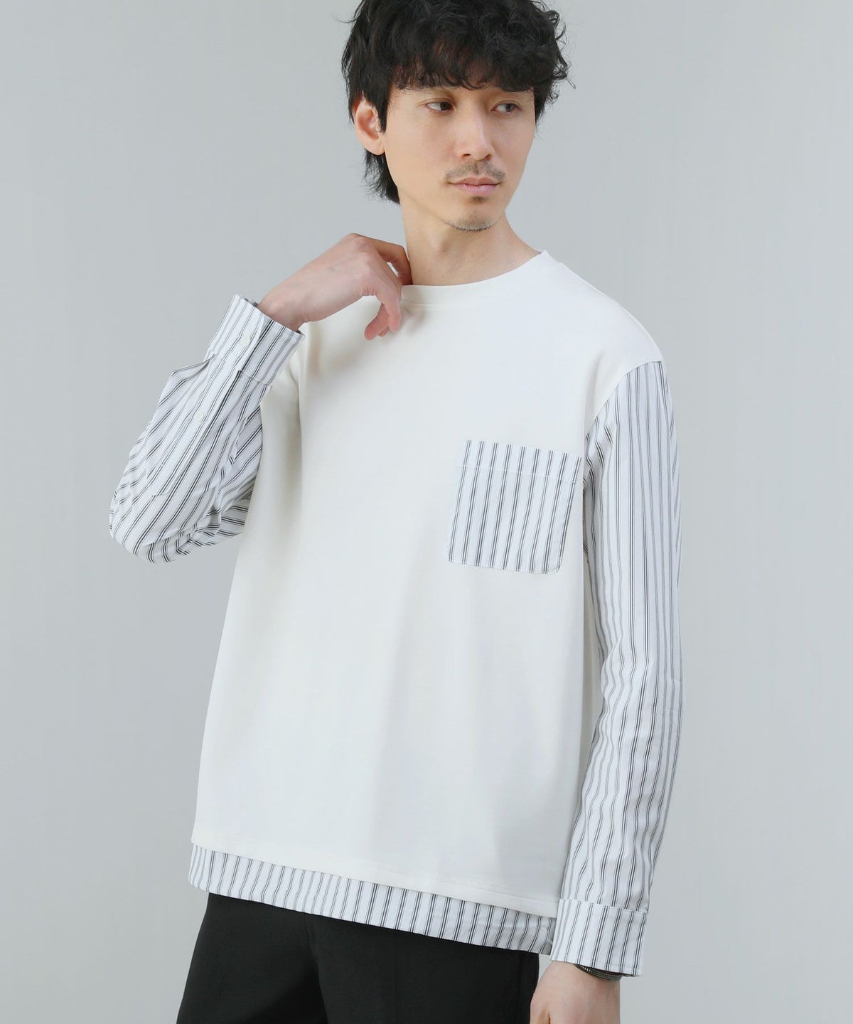 ポンチ×ストライプ布帛切り替え長袖Tシャツ