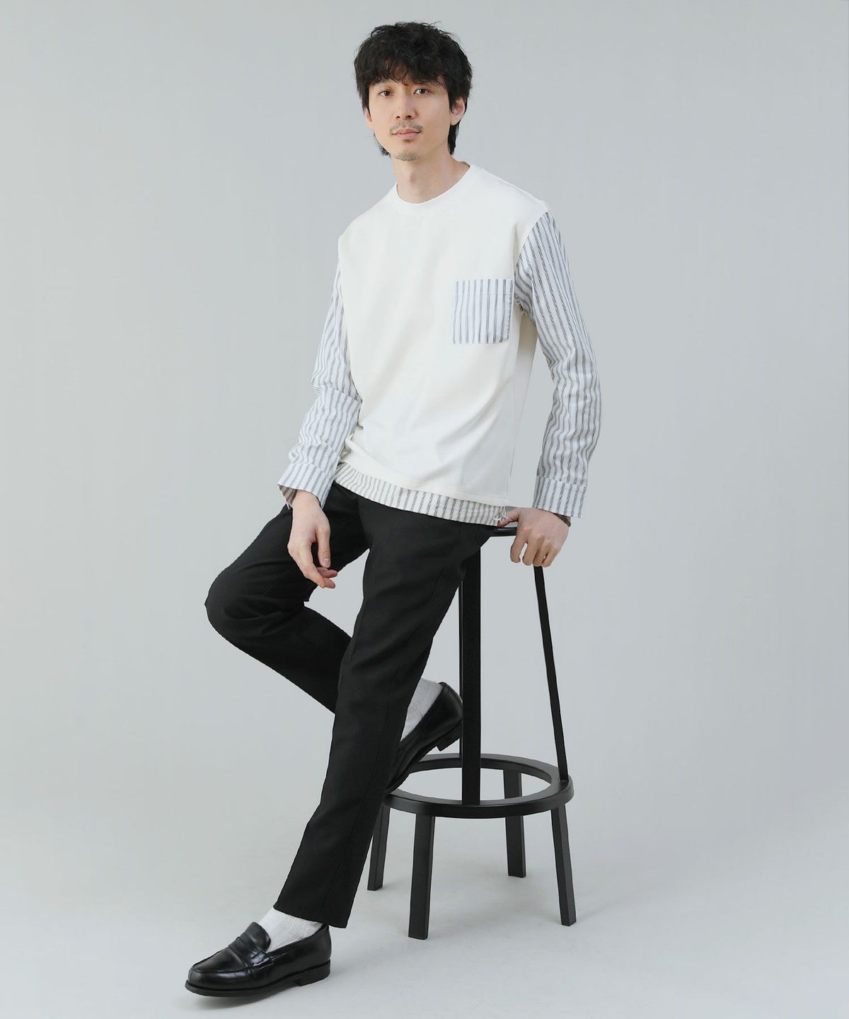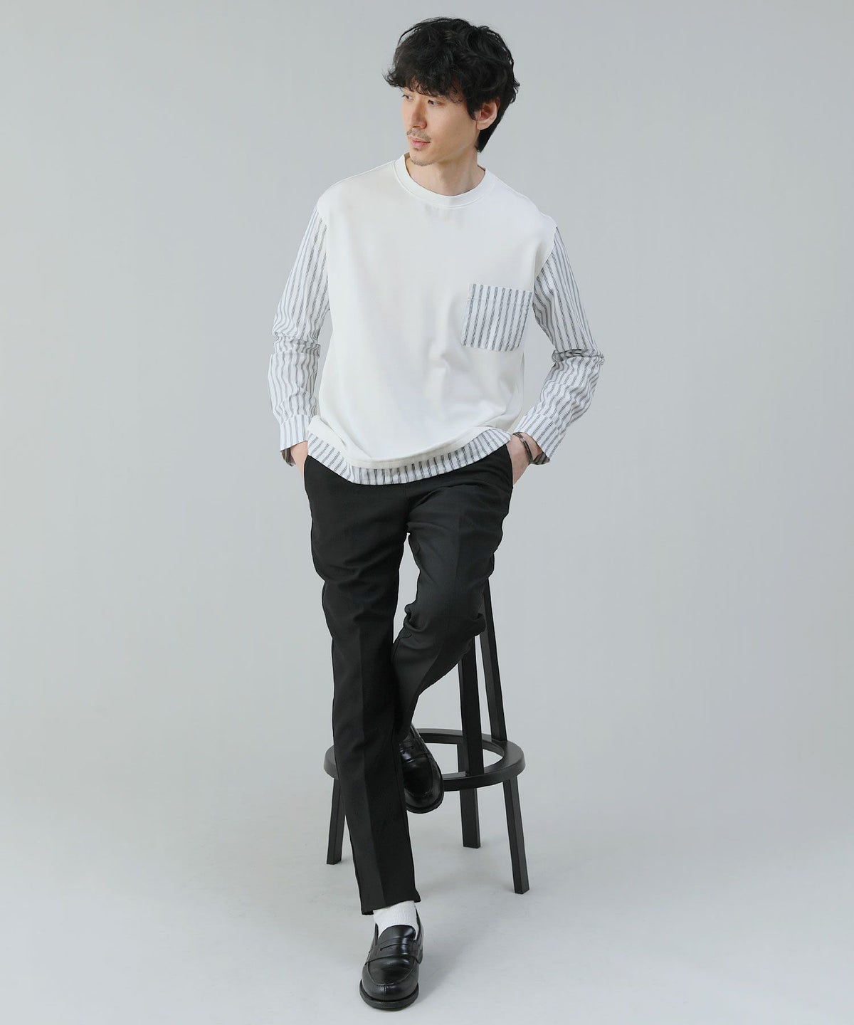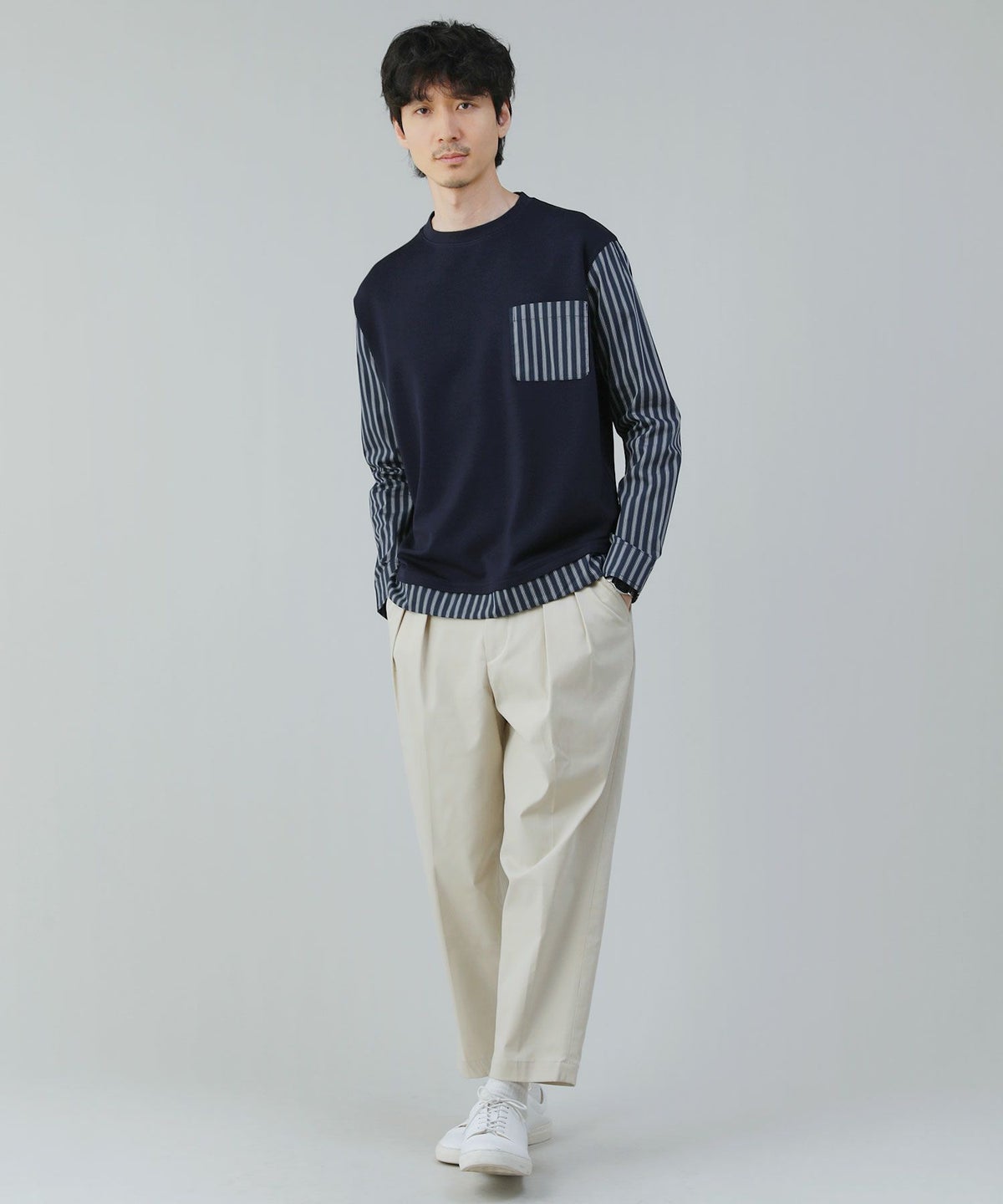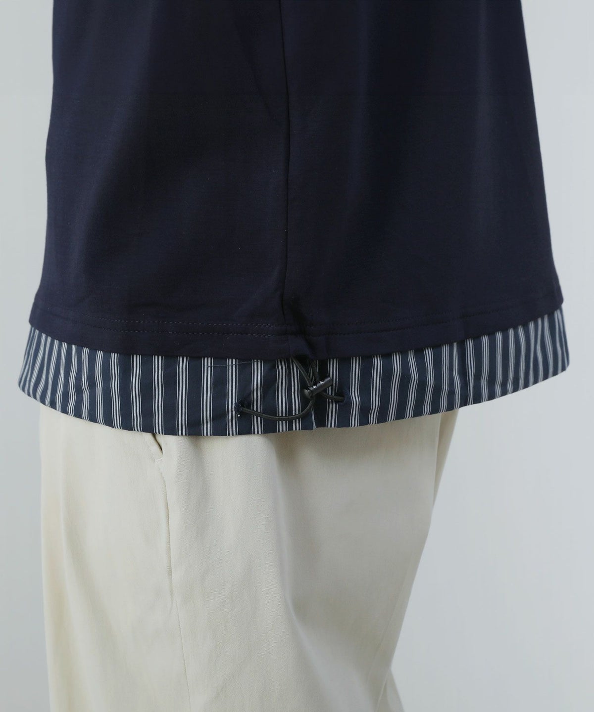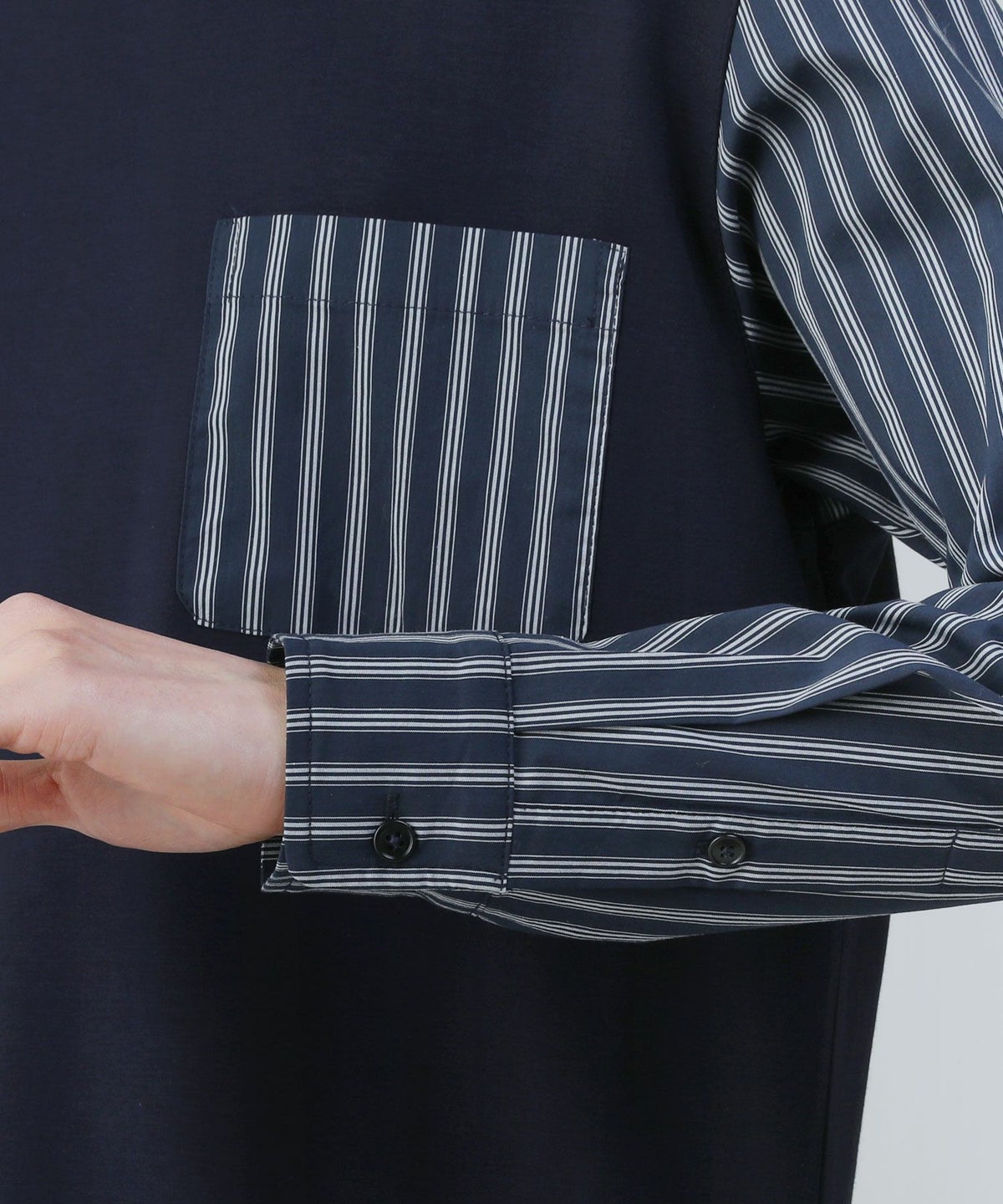 ポンチ×ストライプ布帛切り替え長袖Tシャツ