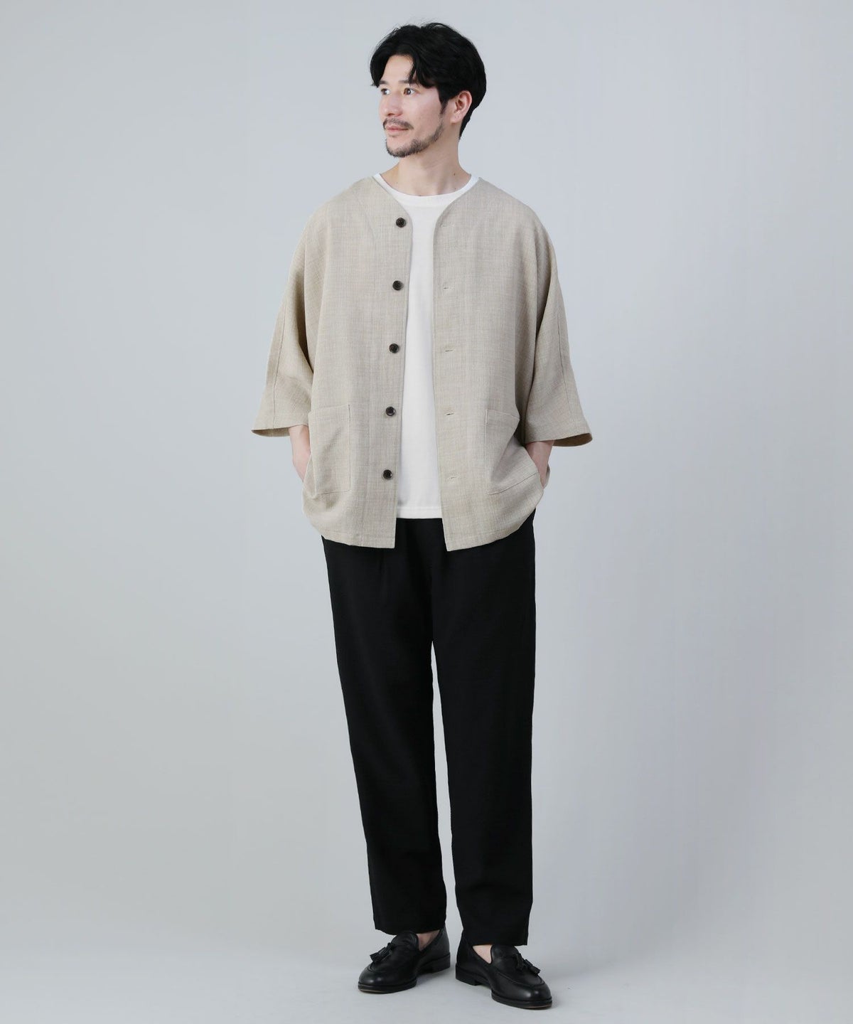 日本製Naturemier(ナチュレミア)TECHリネンライクトロピカルノーカラージャケット