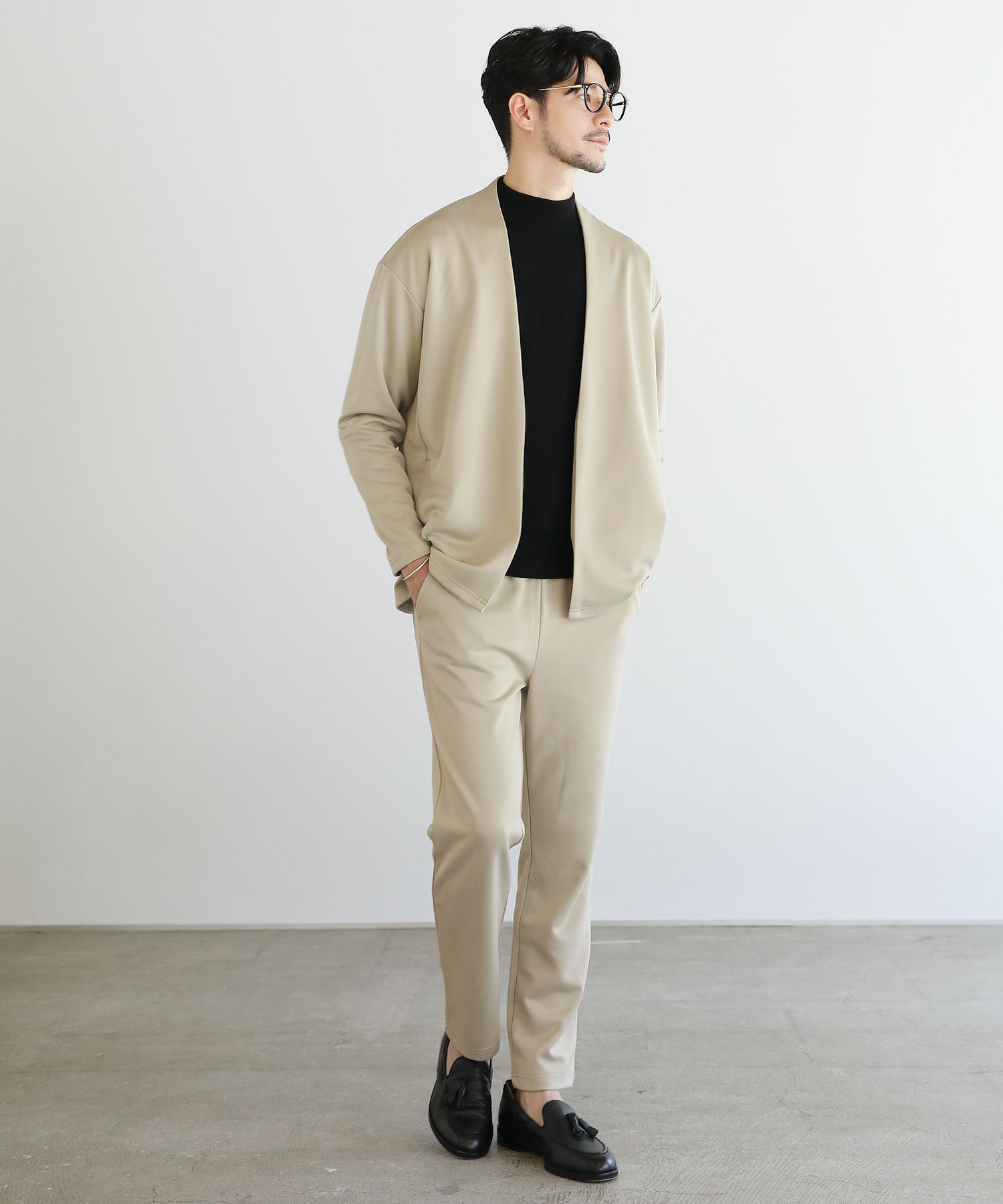 ピーチスキンポンチ/杢ポンチ ノーカラーカーディガン&テーパードパンツセットアップ