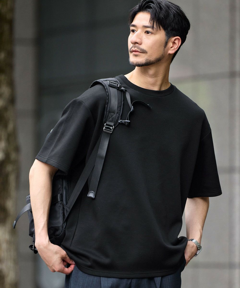 ゆったりとさせたシルエットとポリウレタン由来の伸縮性で身動きがとりやすく、動作にストレスを感じさせません。空気を含んだようなふくらみと適度なハリがある生地で形が崩れにくいため、どの角度から見ても立体的でしゃんとした印象に。シワにもなりにくく着ている間キレイめなシルエットをキープしてくれる、大人な表情のTシャツです。
