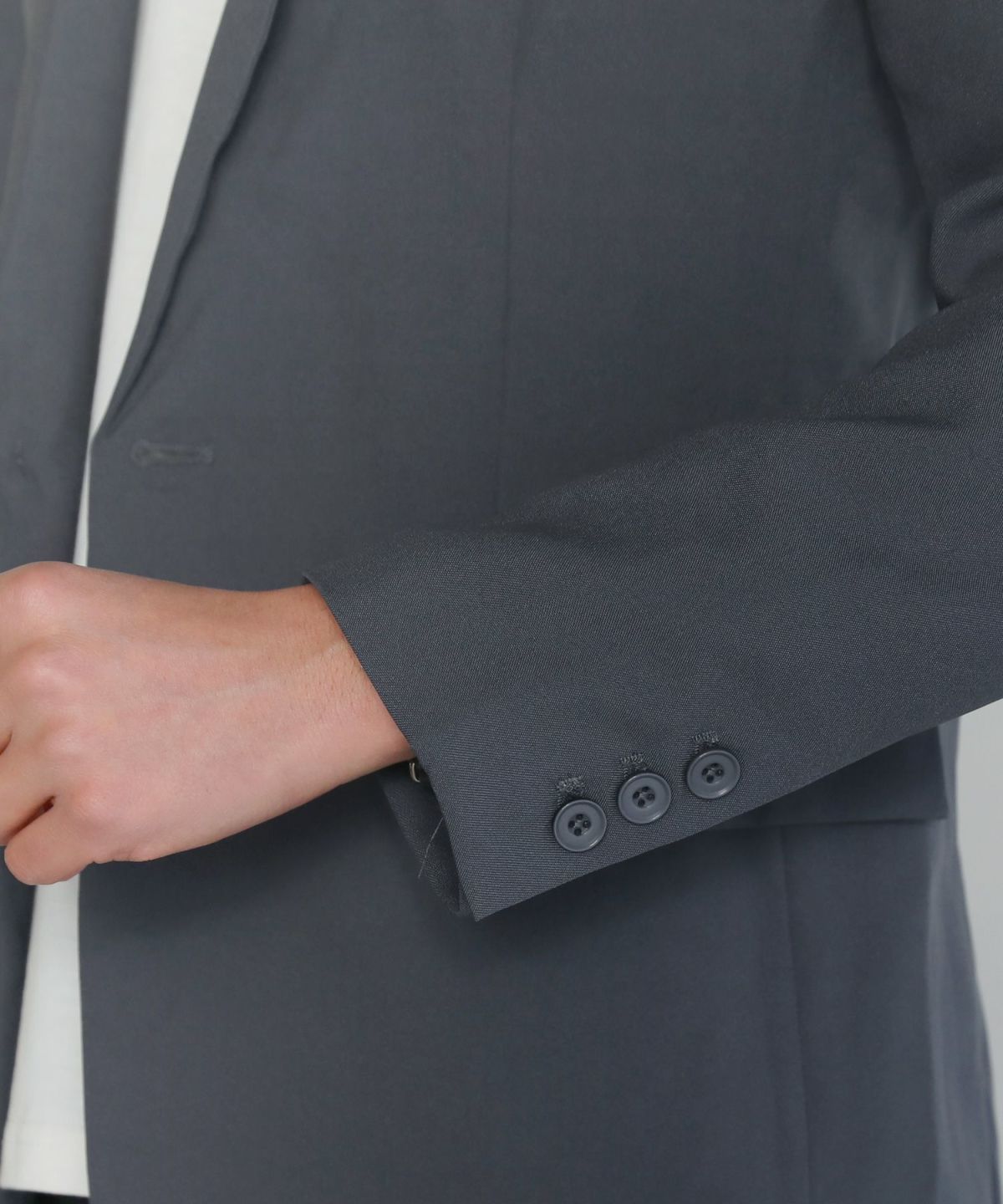 生地は品の良い印象の微光沢ポリエステルスーツ生地。きめ細かく滑らかな生地が、きちんと感を演出します。裏地も付いているので袖通しはスムーズ。便利な内ポケットも1つ付けております。