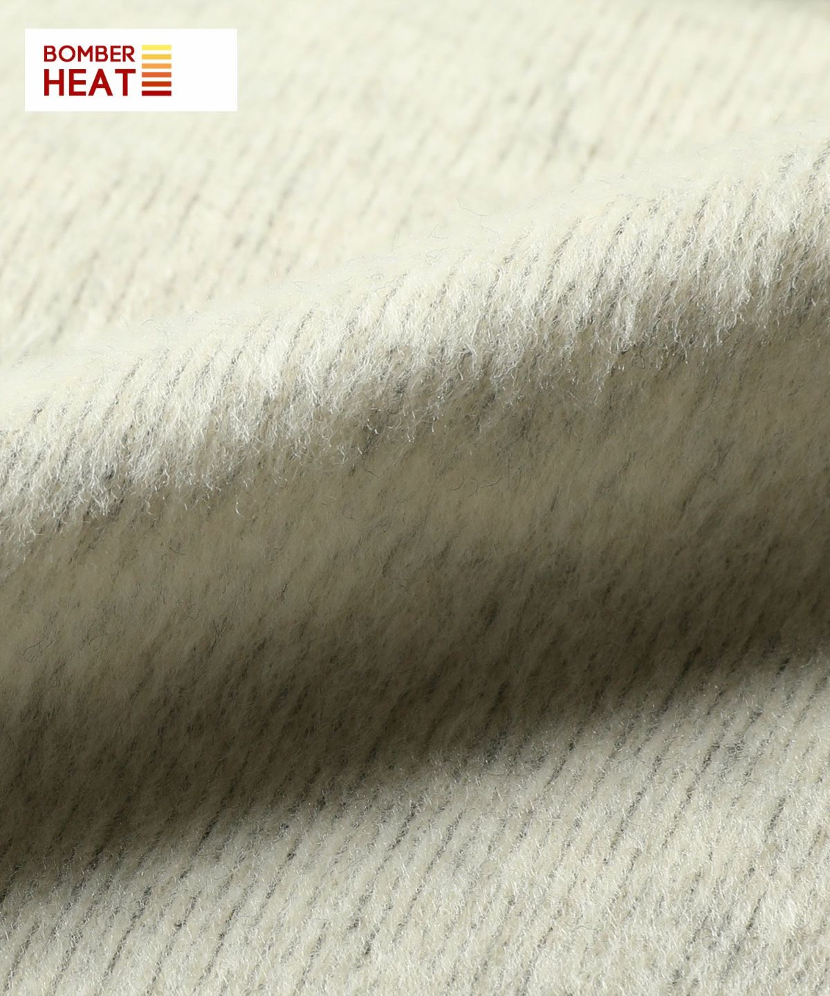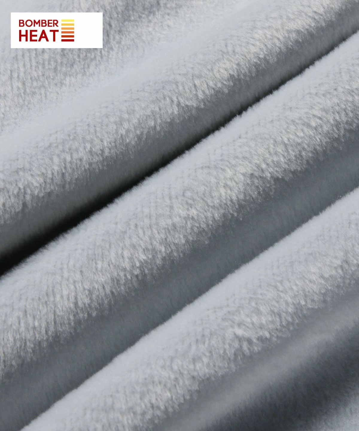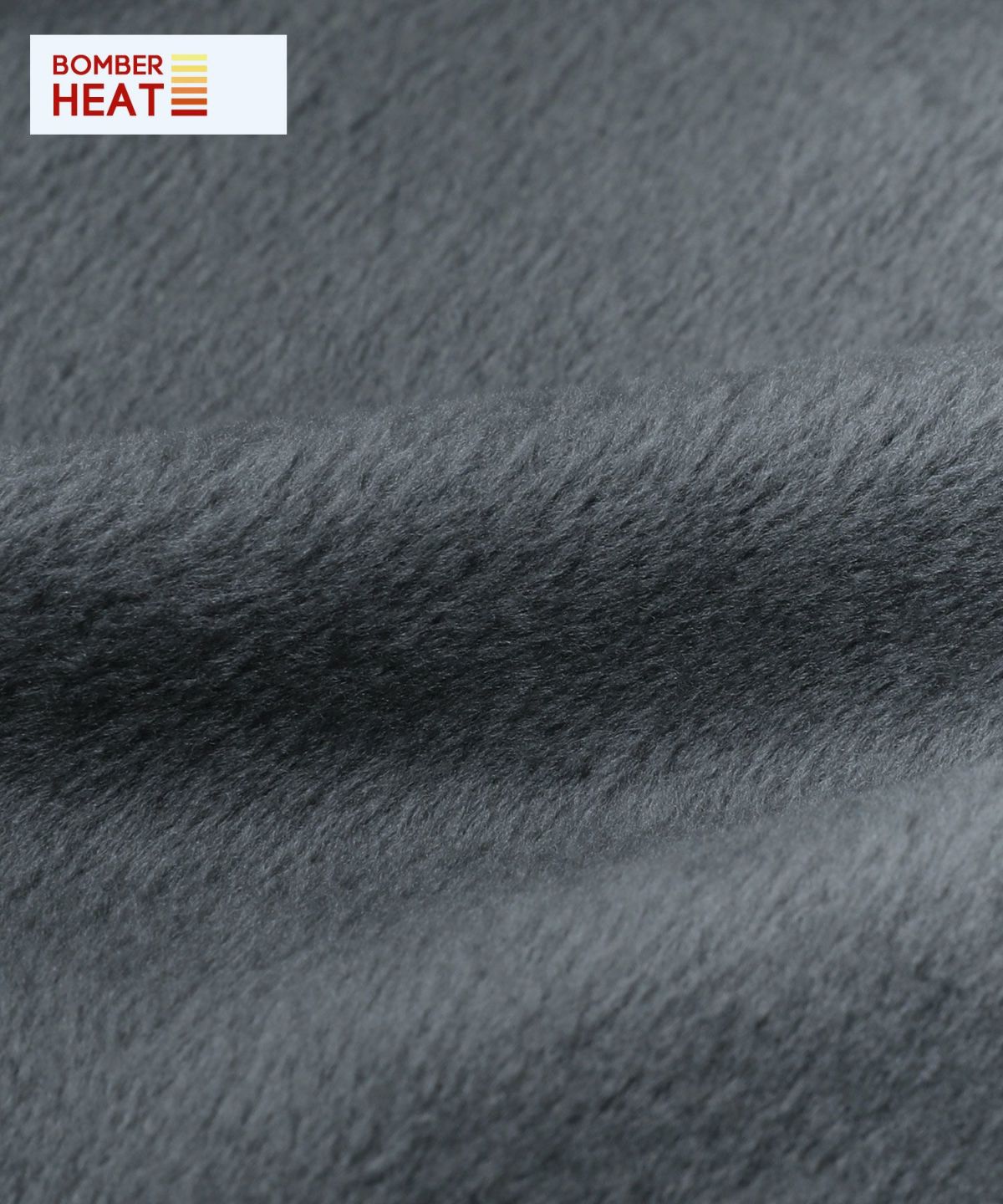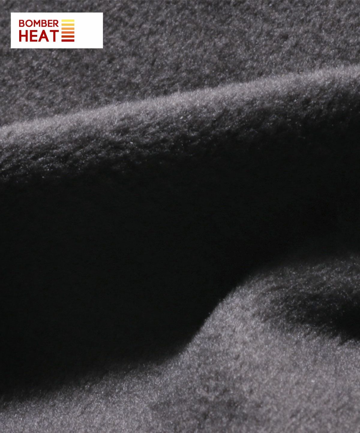 圧倒的な暖かさで注目される『ボンバーヒート生地』。裏地に特殊な起毛加工を施してベロアライクのタッチに仕上げた編み地です。柔らかいポリエステル糸を何度も起毛することで、チクチク感のない、まるで毛布のような滑らかな毛並みを生み出しております。最高の優しい肌触りと、暖かい着心地。毛布に身体を包まれるような感覚がクセになる、魅惑の生地です。
