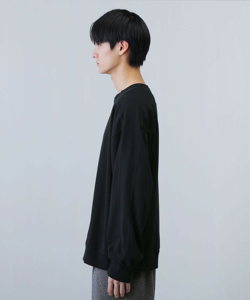 ボンバーヒートと呼ばれる特殊な裏起毛生地を用いた日本製スウェット。凹凸とした立体感のあるハニカム柄のサーマル生地を使用し、表情豊かに仕上げました。
