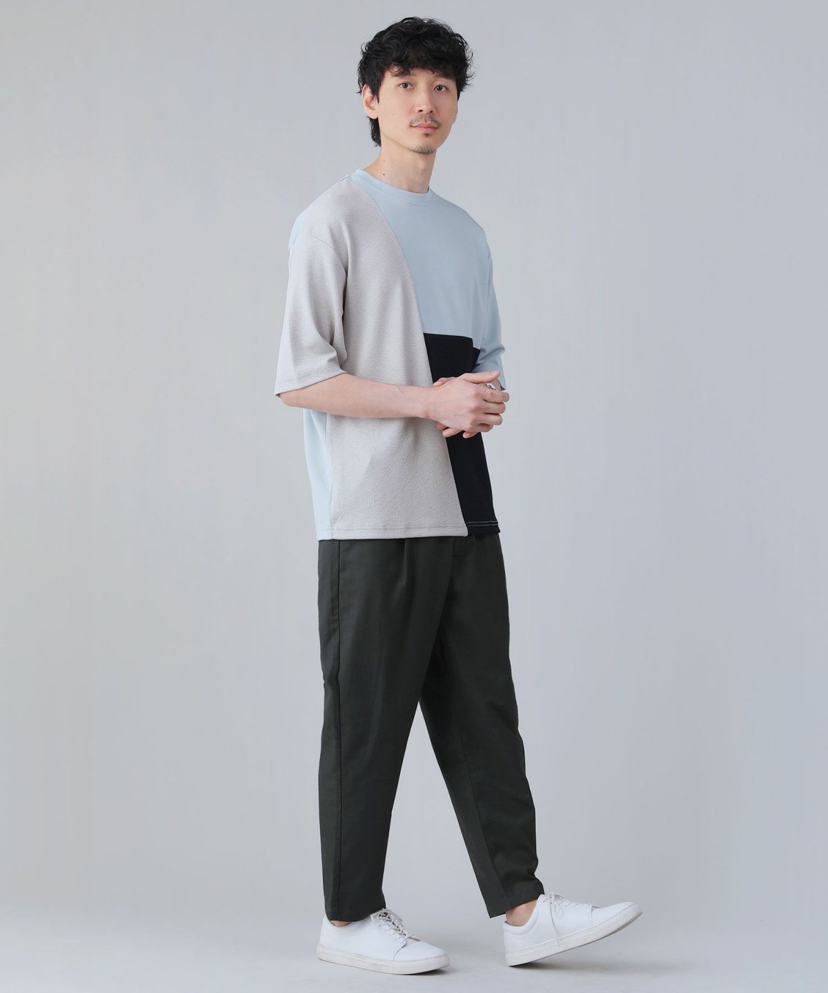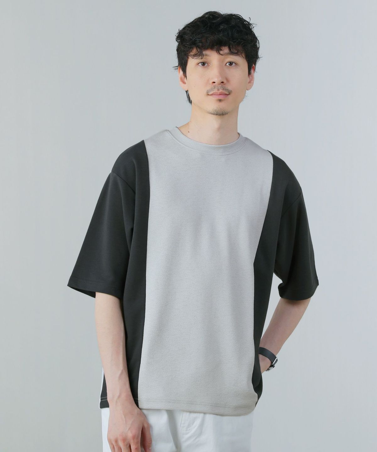 異素材の切り替えデザインが目を引く、半袖Tシャツです。