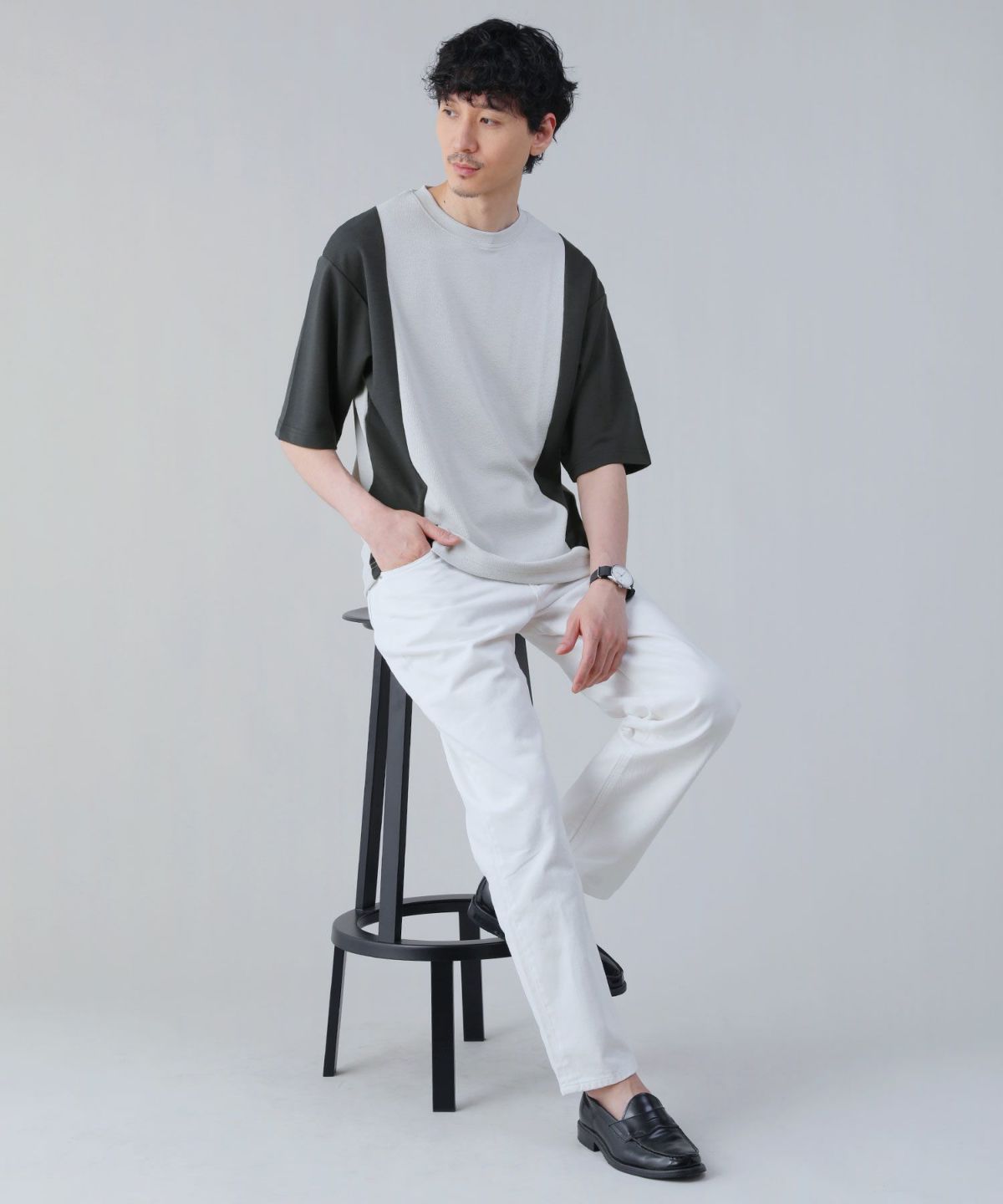 バイカラーのオフとグレー、トリカラーのグリーンとブルーの4種類ご用意しました。カジュアルなワイドパンツやキレイめのスラックスなど、様々なテイストのパンツと相性抜群。サラッと1枚で着てもお洒落にキマる便利な半袖Tシャツです。