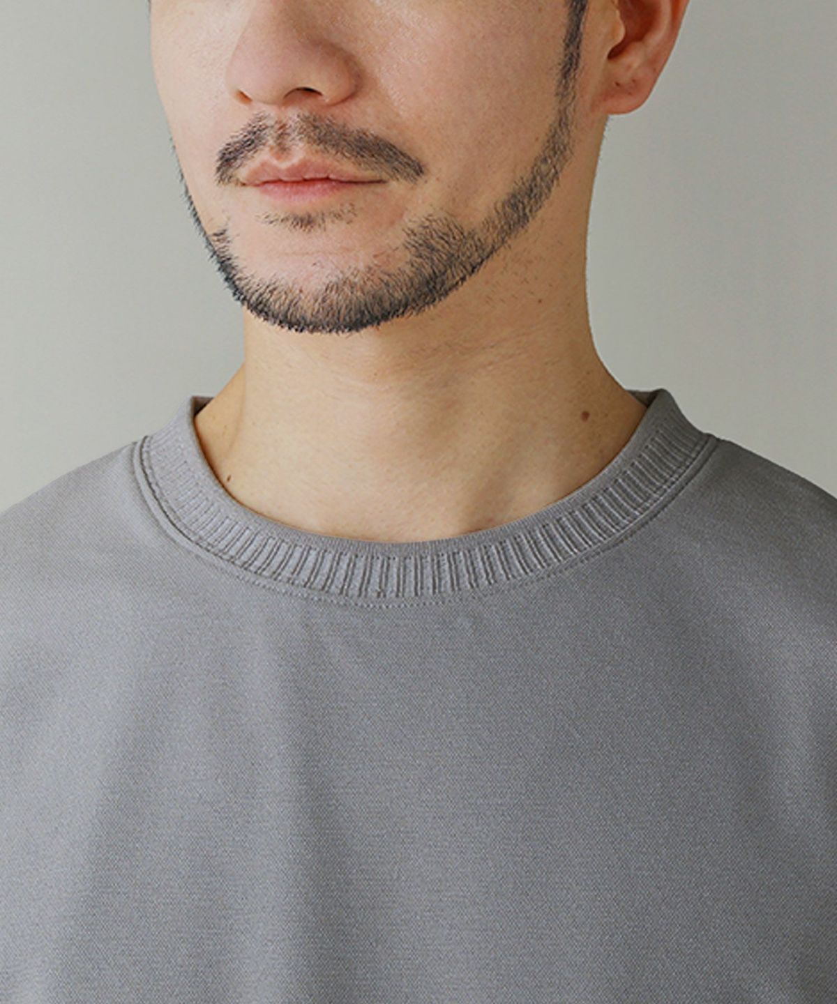 デザインのアクセントに太めに編まれたリブ襟を採用しました。ポンチ生地タイプは着回しやすいシンプルなTシャツ型に。カノコ生地タイプは、サイドの縫い目をフロント側に入れ込んで前後差を付けた、立体的な作りとなっております。どちらもドロップショルダーに5分袖と、トレンドのオーバーサイズ感を演出するデザインを取り入れつつも、大きすぎずコンパクト過ぎないルーズシルエットに仕上げています。