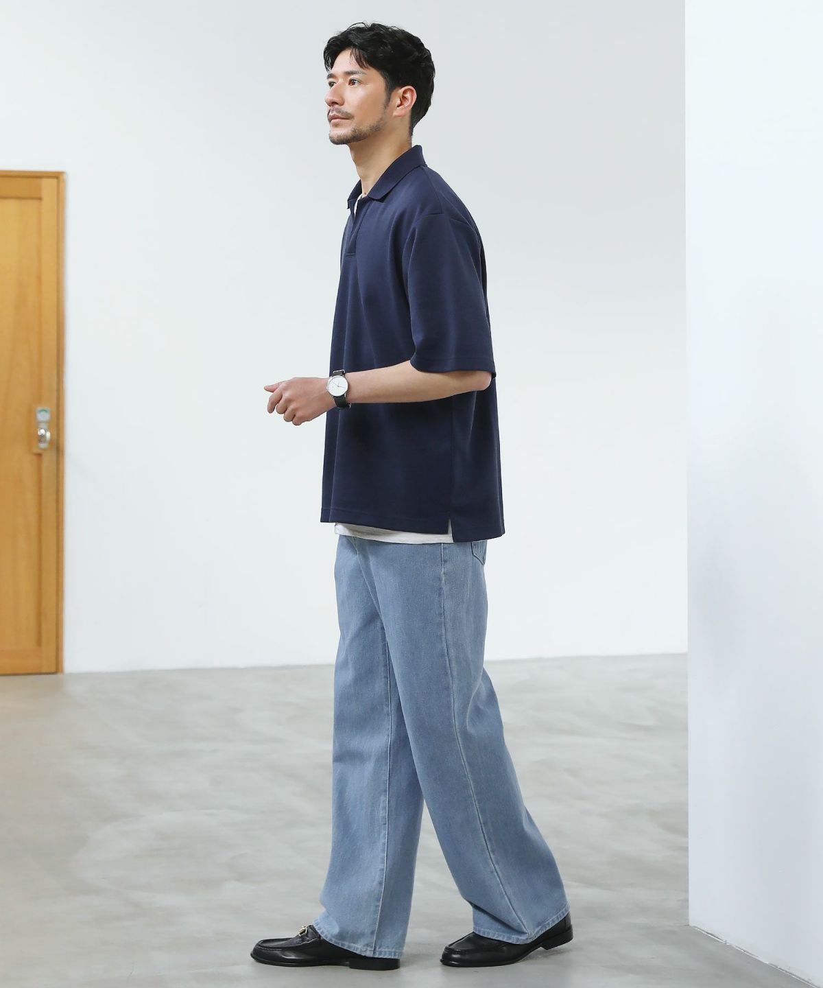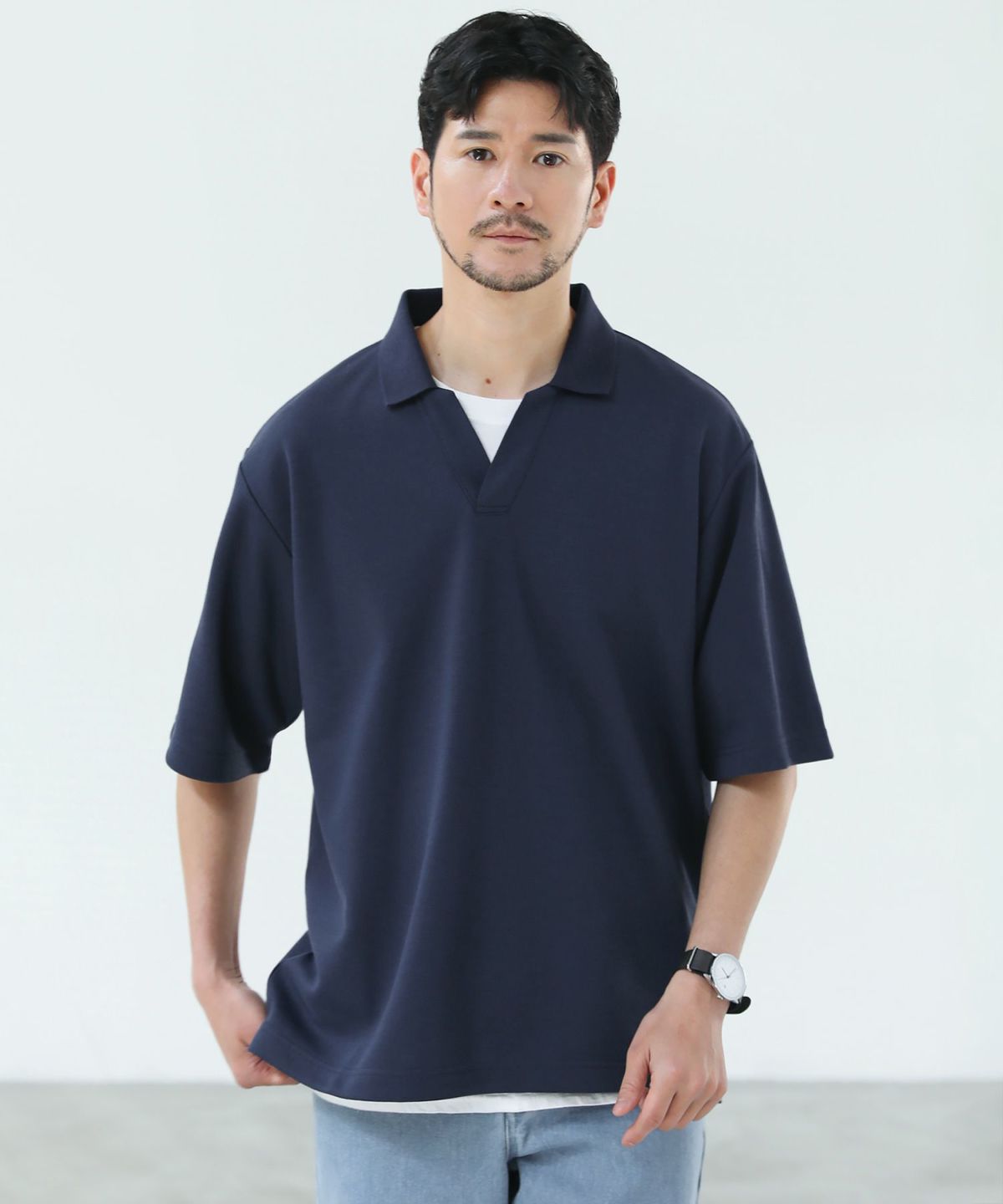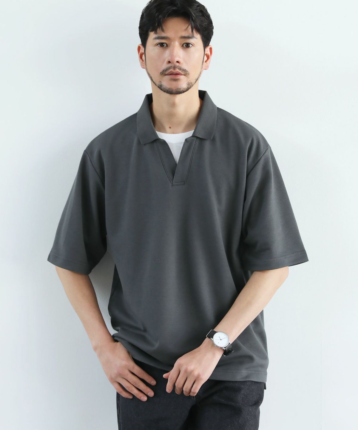 ひんやりとした着心地を体感できる接触冷感スキッパーポロシャツです。身幅と腕ぐりにたっぷりとゆとりを持たせ、動きやすくルーズな旬のシルエットに仕上げました。通常のポロシャツと違い、胸元のボタンを取り除いたスキッパースタイルにすることで胸元に自然な抜け感をプラスしています。また、抗菌防臭機能と接触冷感機能を併せ持った特殊な生地を使用。オンにもオフにも活躍する汎用性の高いデザインで、汗ばむ夏のシーズンでも涼しく清潔にご着用いただけます。