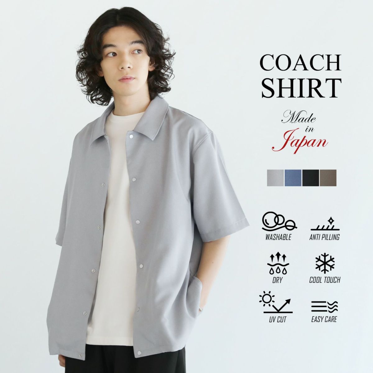 外出中、建物の中との温度差に対応できるアイテムに困ることはありませんか?さっと羽織れる軽さや、バッグに入れて持ち歩けるようなメンズの羽織り物は意外と少ないもの。SPUは機能性に優れた夏向けの半袖シャツを完成させました。ほのかに艶のある上品な生地感に日本製の丁寧な縫製が相まって、キレイめな印象が引き立てられるアイテムとなっております。麻調のドライな質感で、肌に触れるとひんやりと心地よい接触冷感機能も備えており、汗ばむ季節のお洒落着に最適。さらに気兼ねなく日常的に着用とお洗濯を繰り返すことができるウォッシャブル仕様にもなっております。