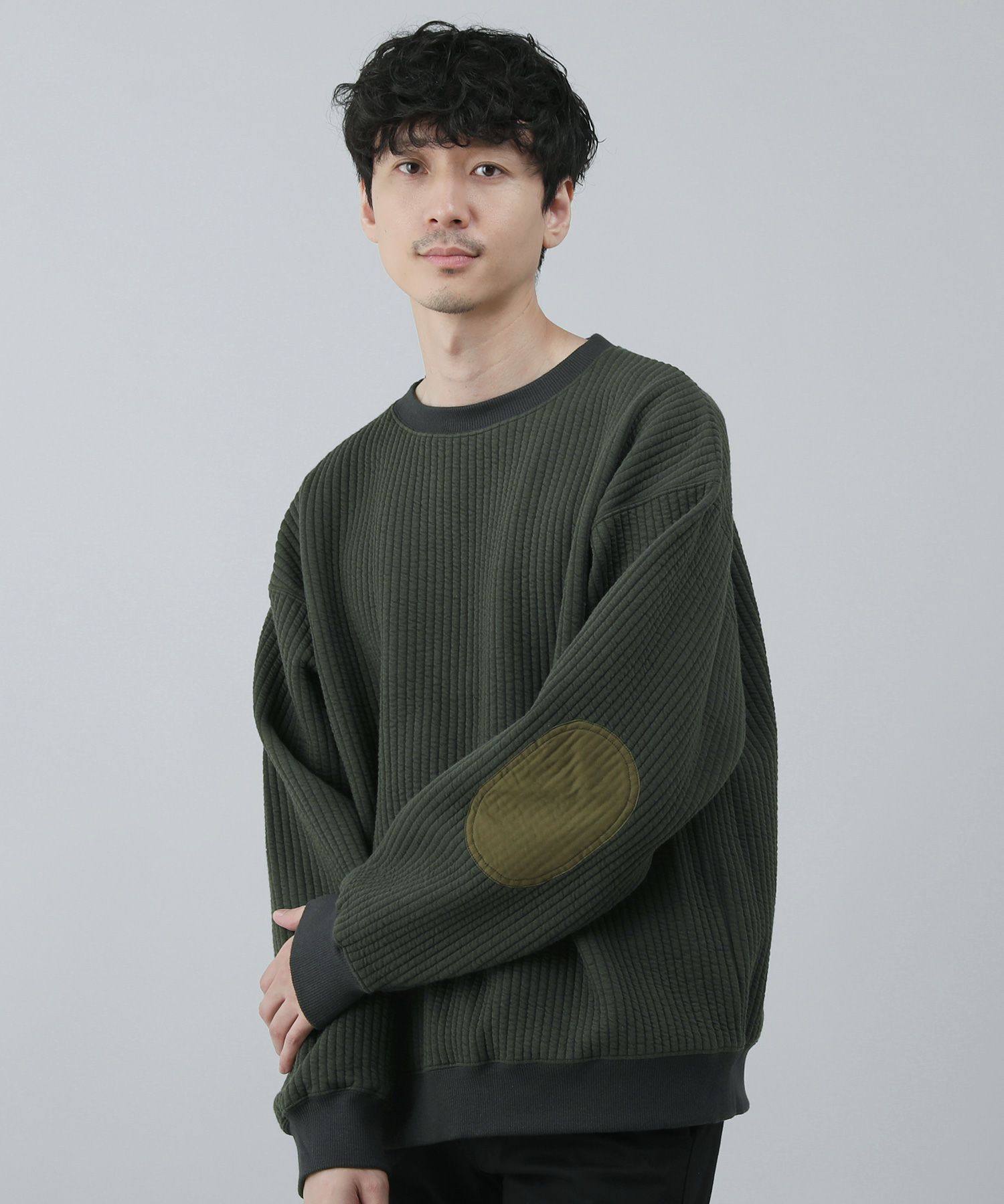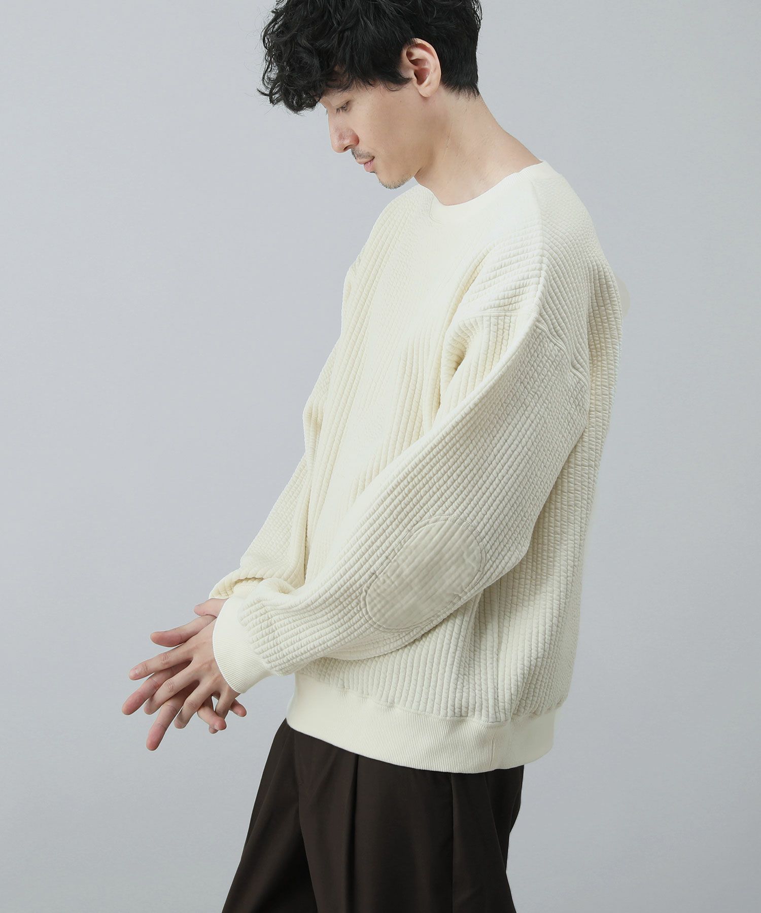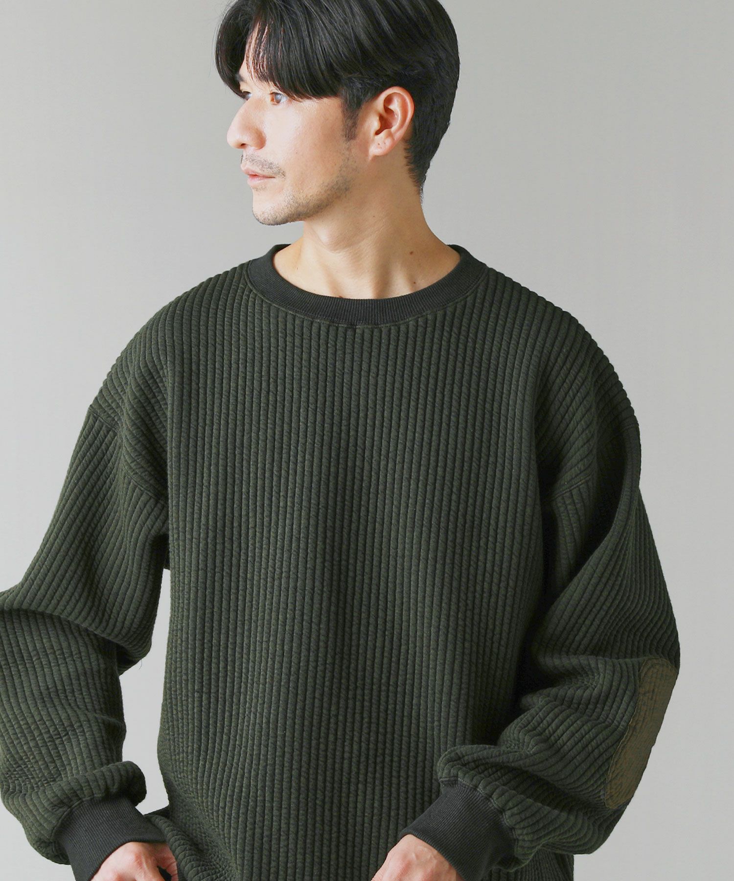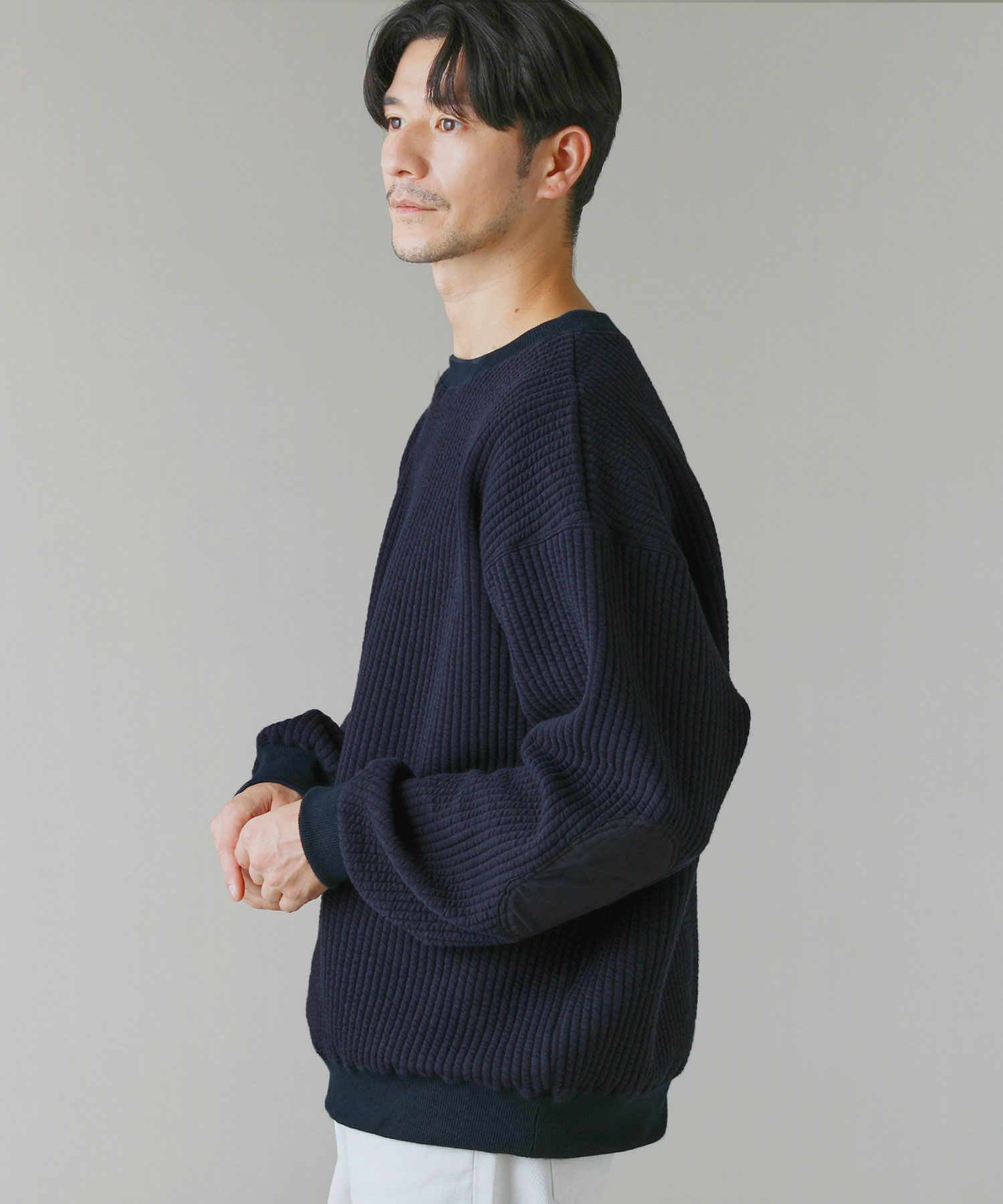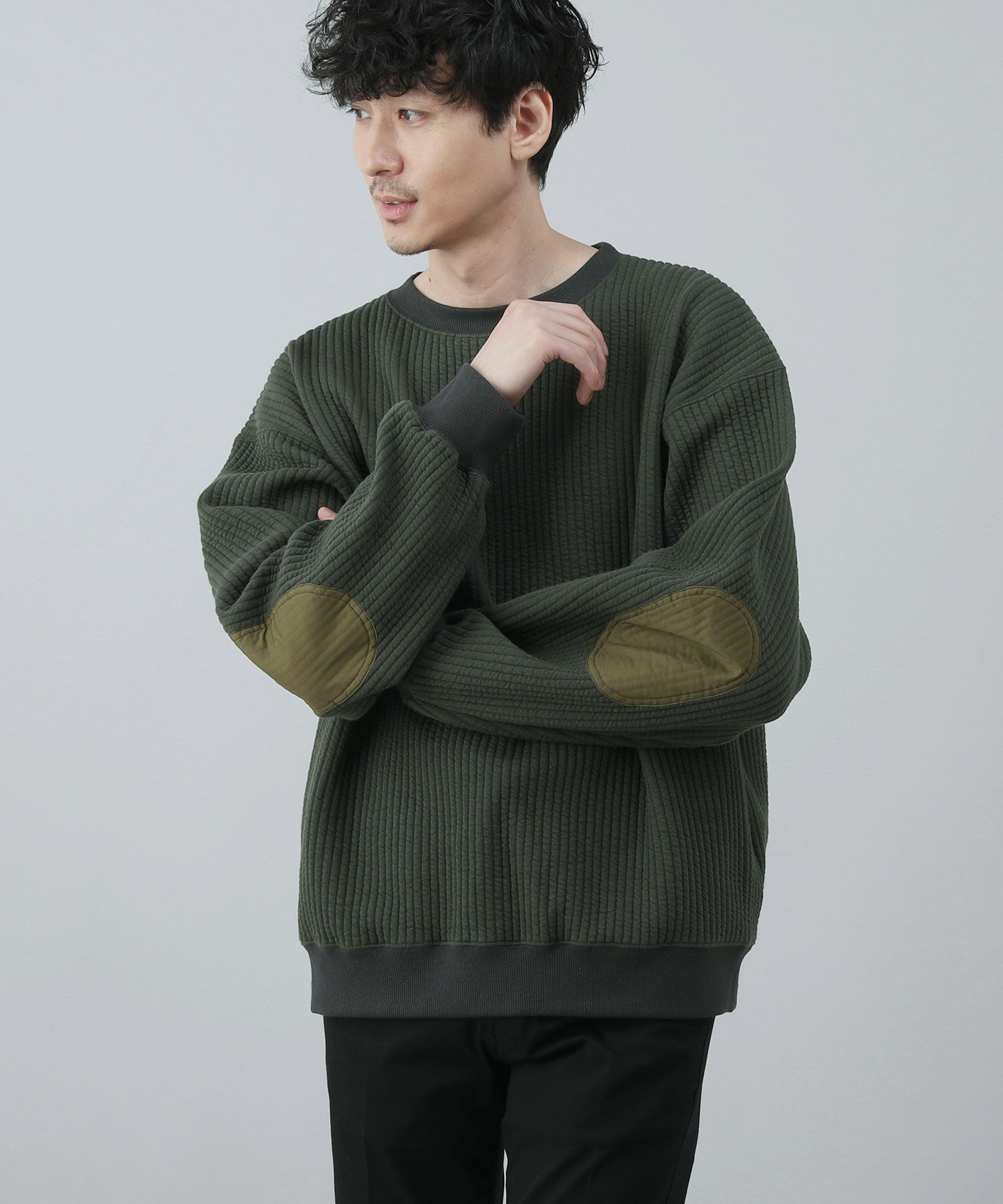 日本製尾州コットンキルトエルボーパッチクルーネック長袖スウェット 12,100円(税込) |