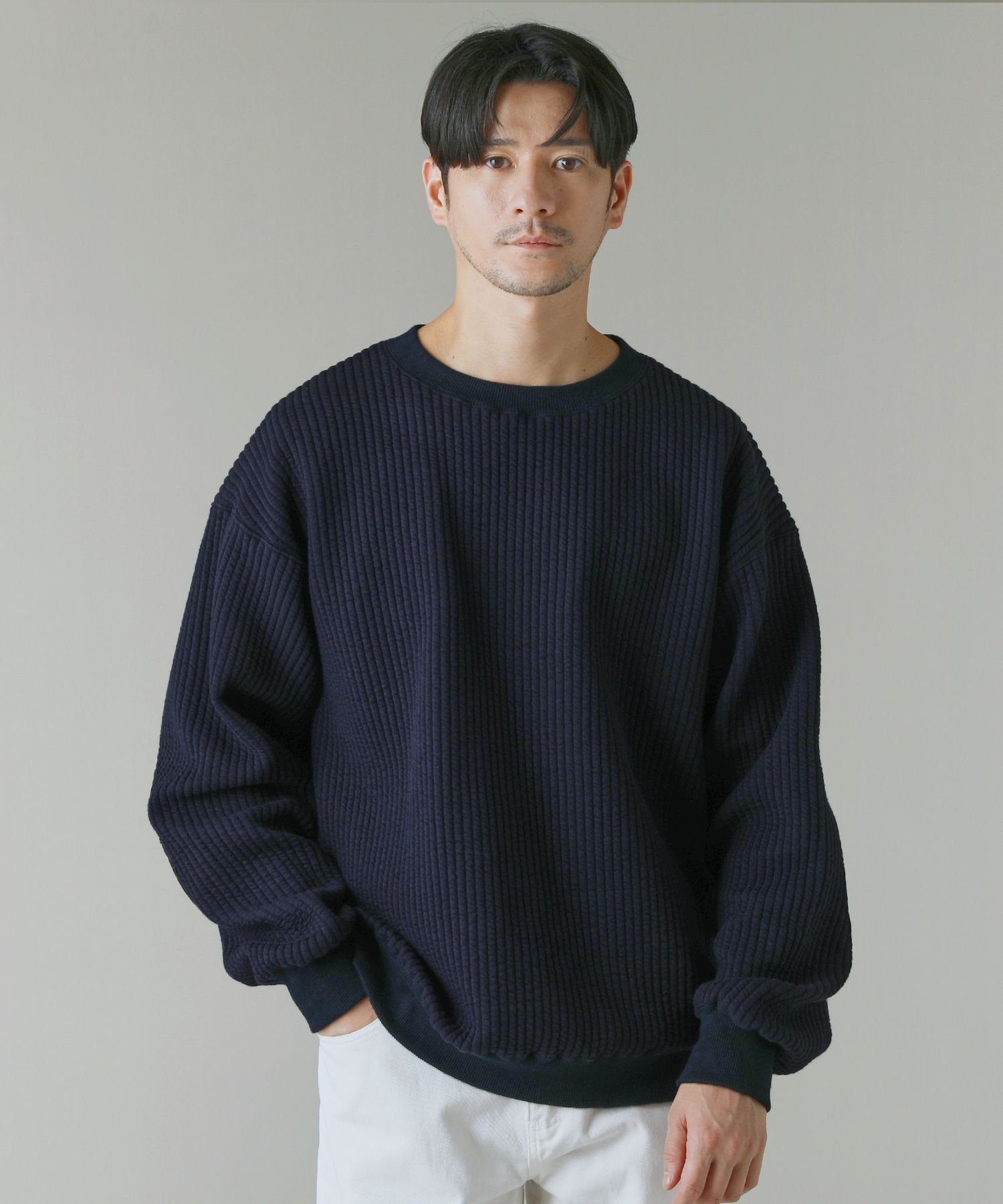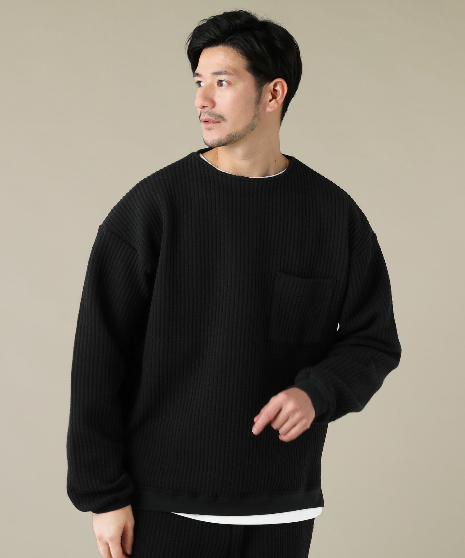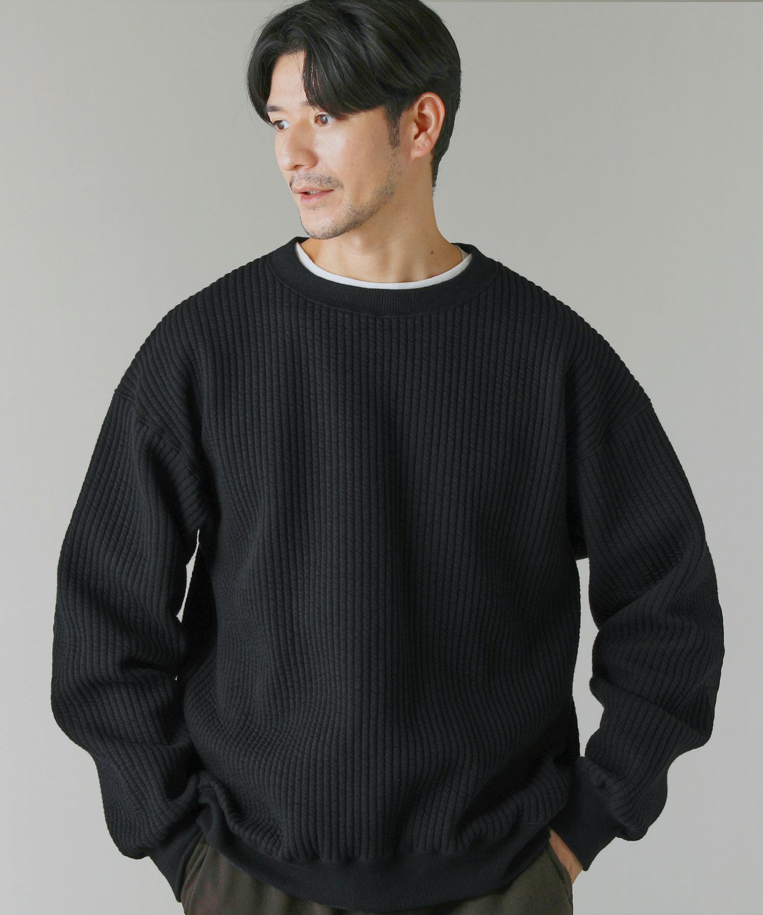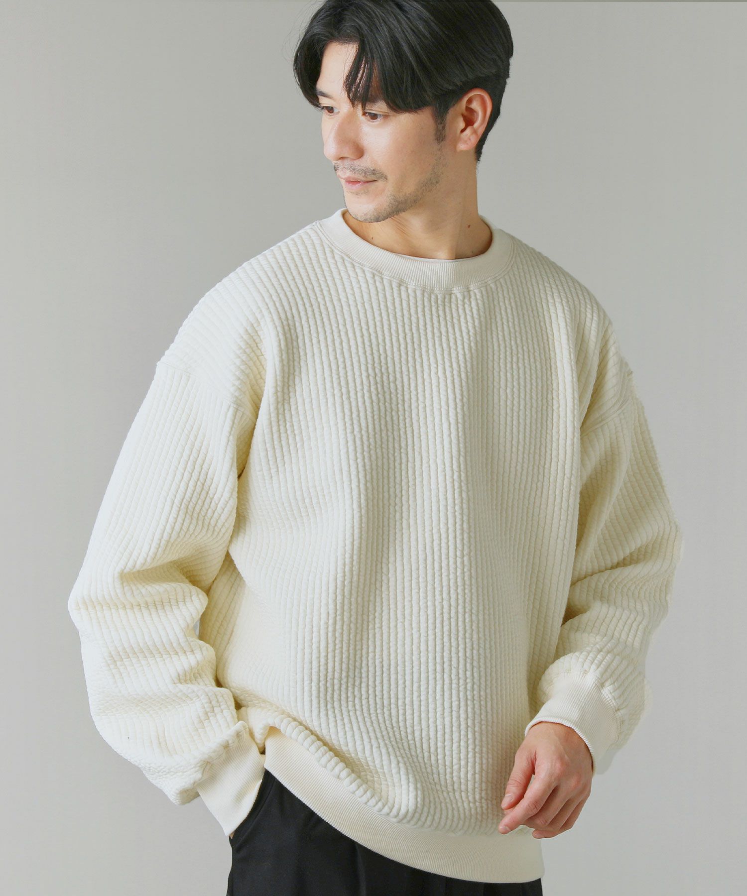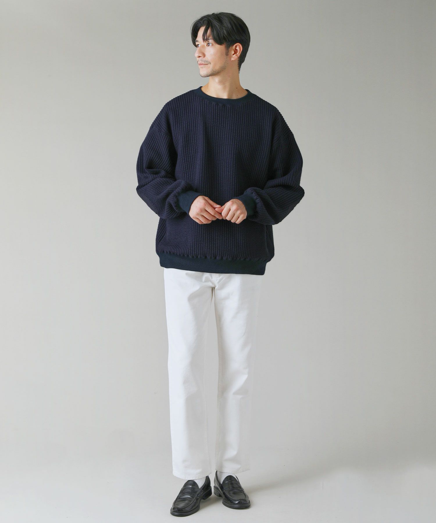日本製尾州コットンキルトエルボーパッチクルーネック長袖スウェット 12,100円(税込) |