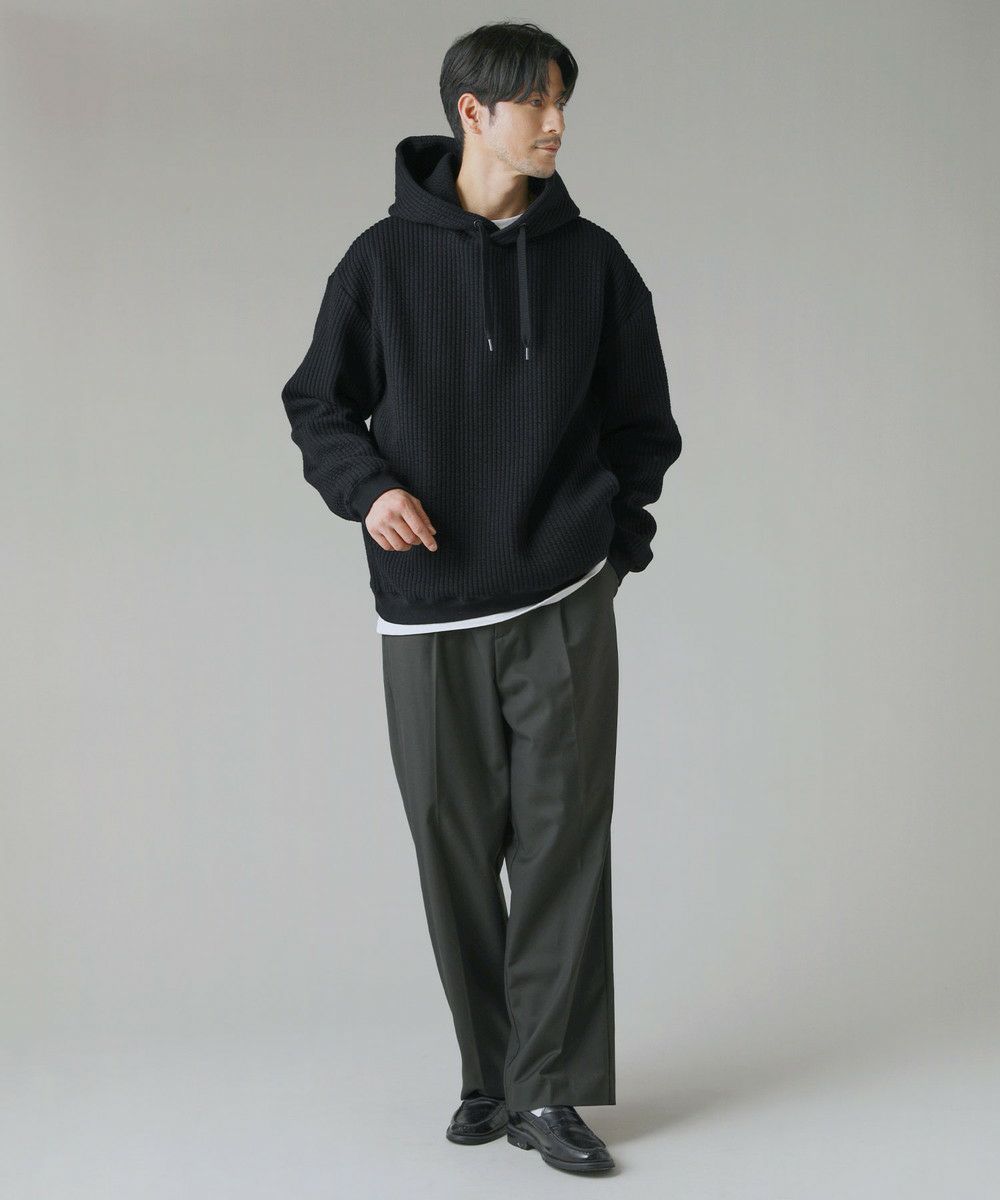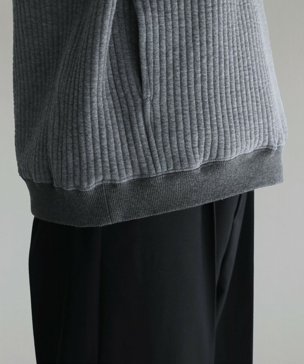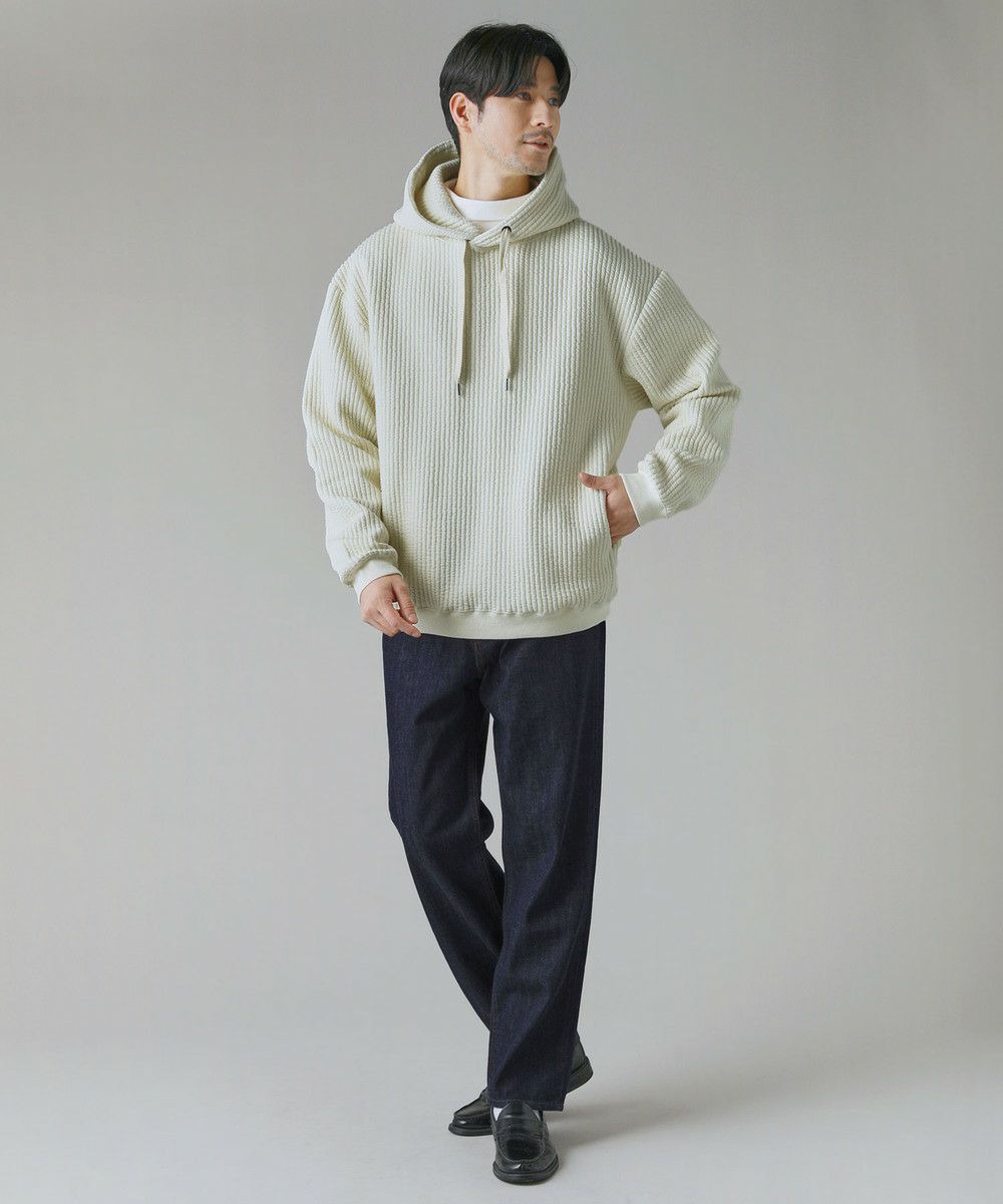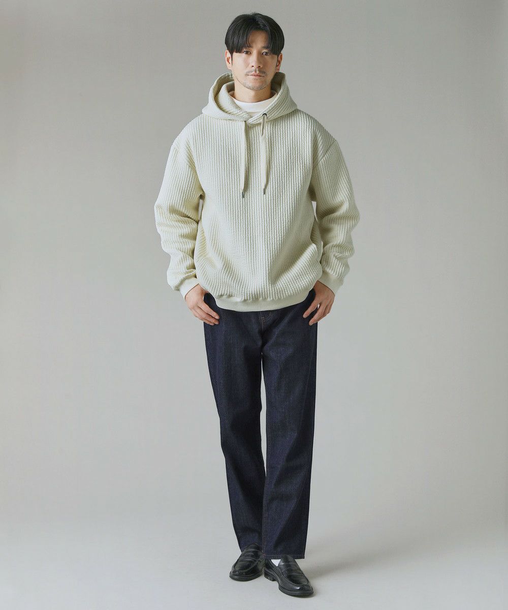 ボックスシルエットとドロップショルダーがリラックス感とこなれた雰囲気を生み出しつつ、程よい着丈なのでだらしなく見えないデザインとなっております。カジュアルなデイリーアイテムとしてはもちろん、キレイめなロングコートやスラックスを合わせた都会的なシーンでも馴染む、スタイリッシュなアイテムです。裾と袖口にはリブを配しており、フィット感と切り替えデザインがさりげないポイントに。 フード部分は生地を二重にして厚みを出すことで、立ち上がりをキープしてくれます。