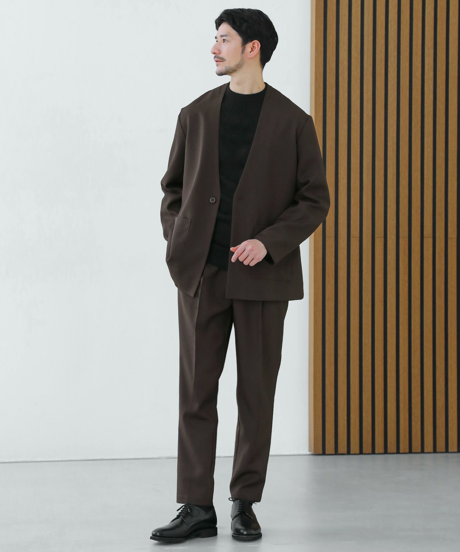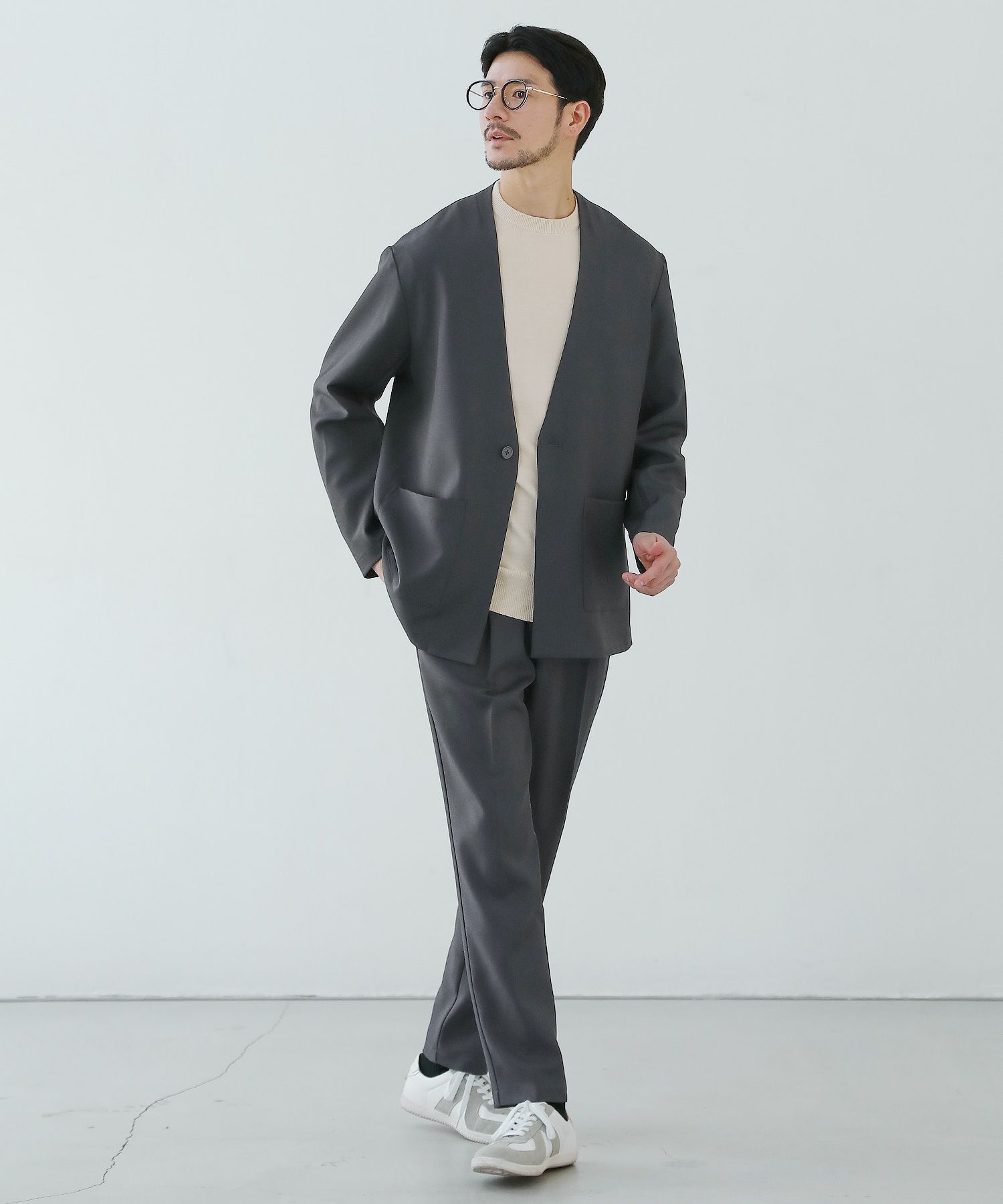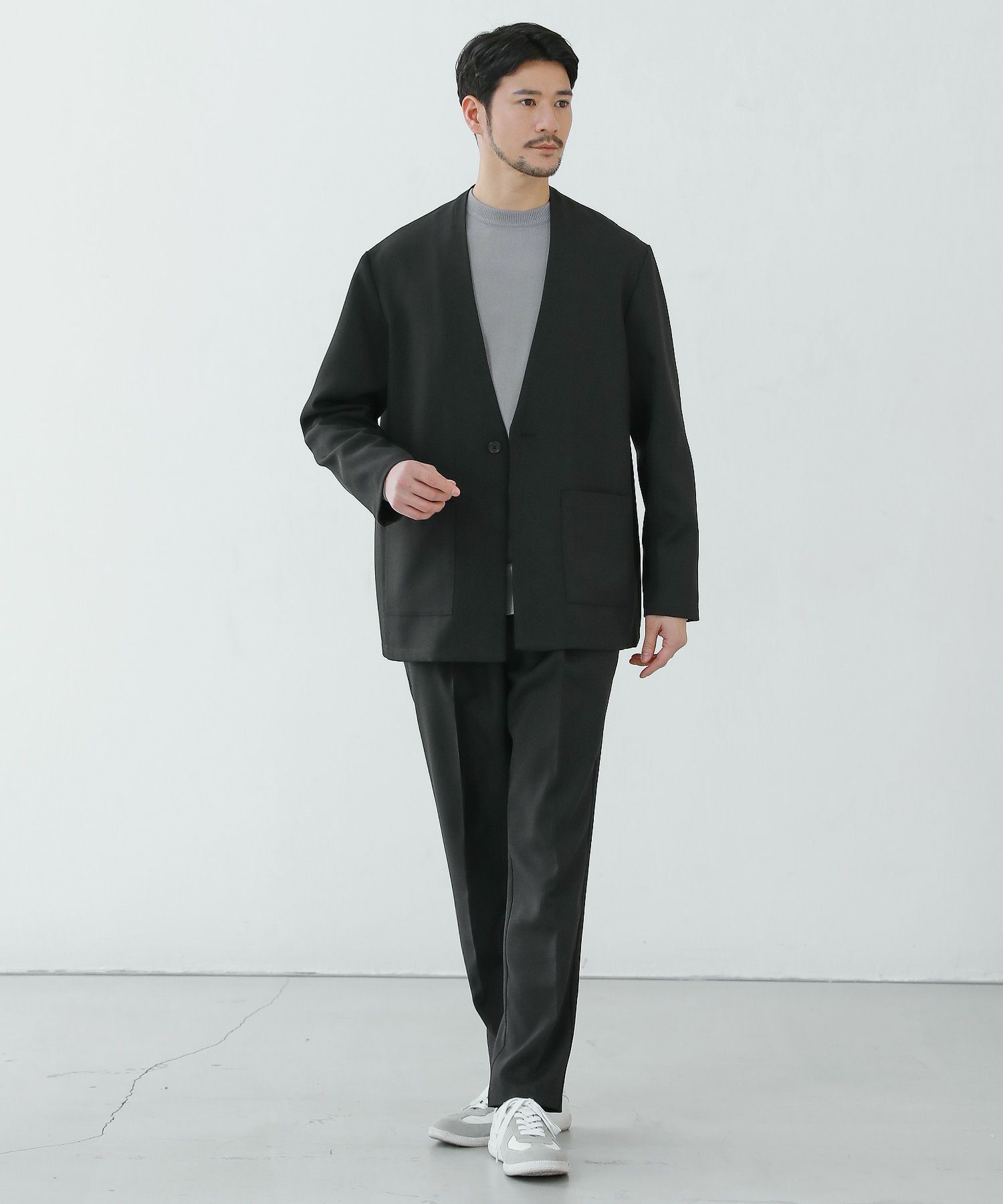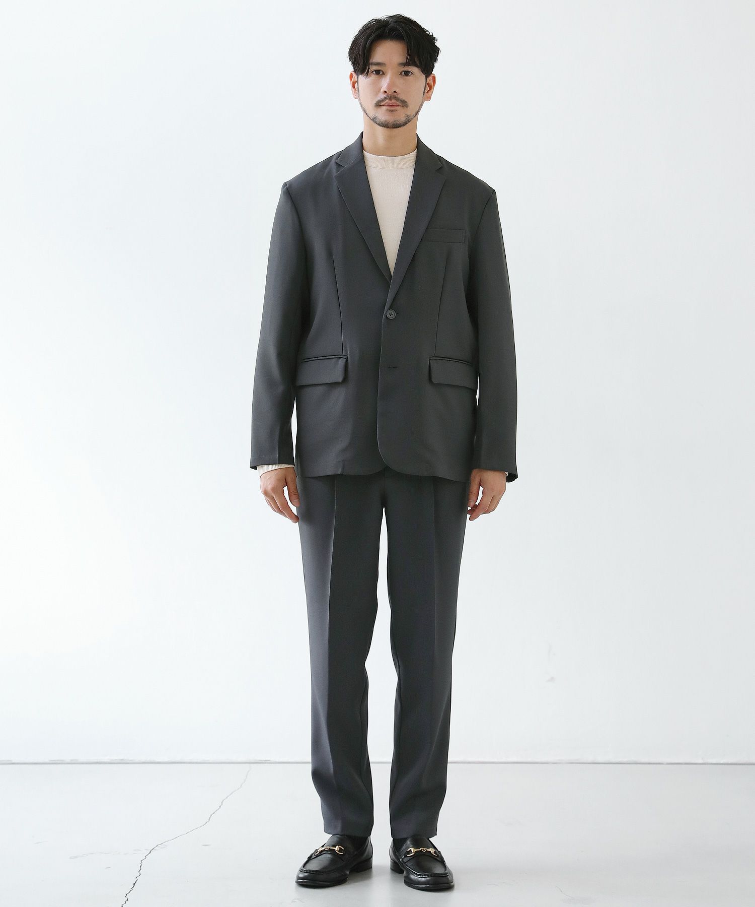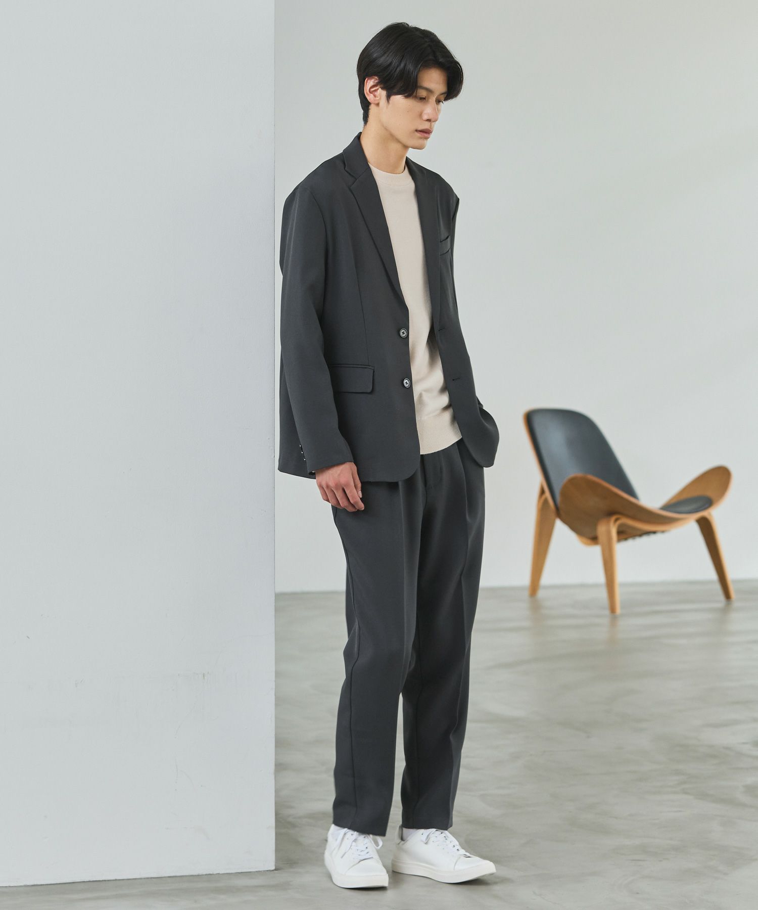 ESSENTIALS WARDROBEのセットアップは「3点セットアップ」。その名の通り、上下に加えてインナーになるニットアイテムもセットにしたまさに「届いてすぐにサマになるセットアップ」です。3点すべてが一緒に着用すること考えられたサイジングなので、理想のキレイめな着こなしが体感できる自信作。手軽に、それでいて大人が目指すキレイめカジュアルをお届けします。