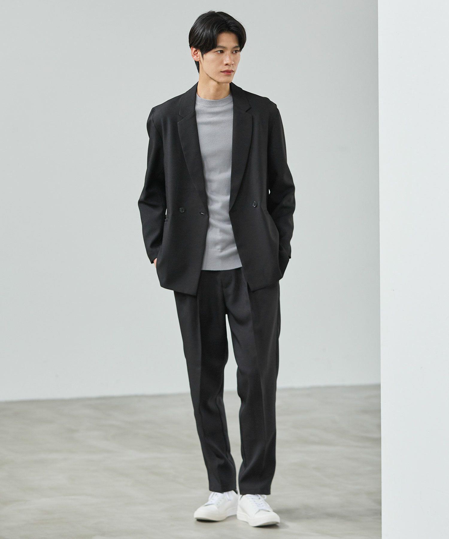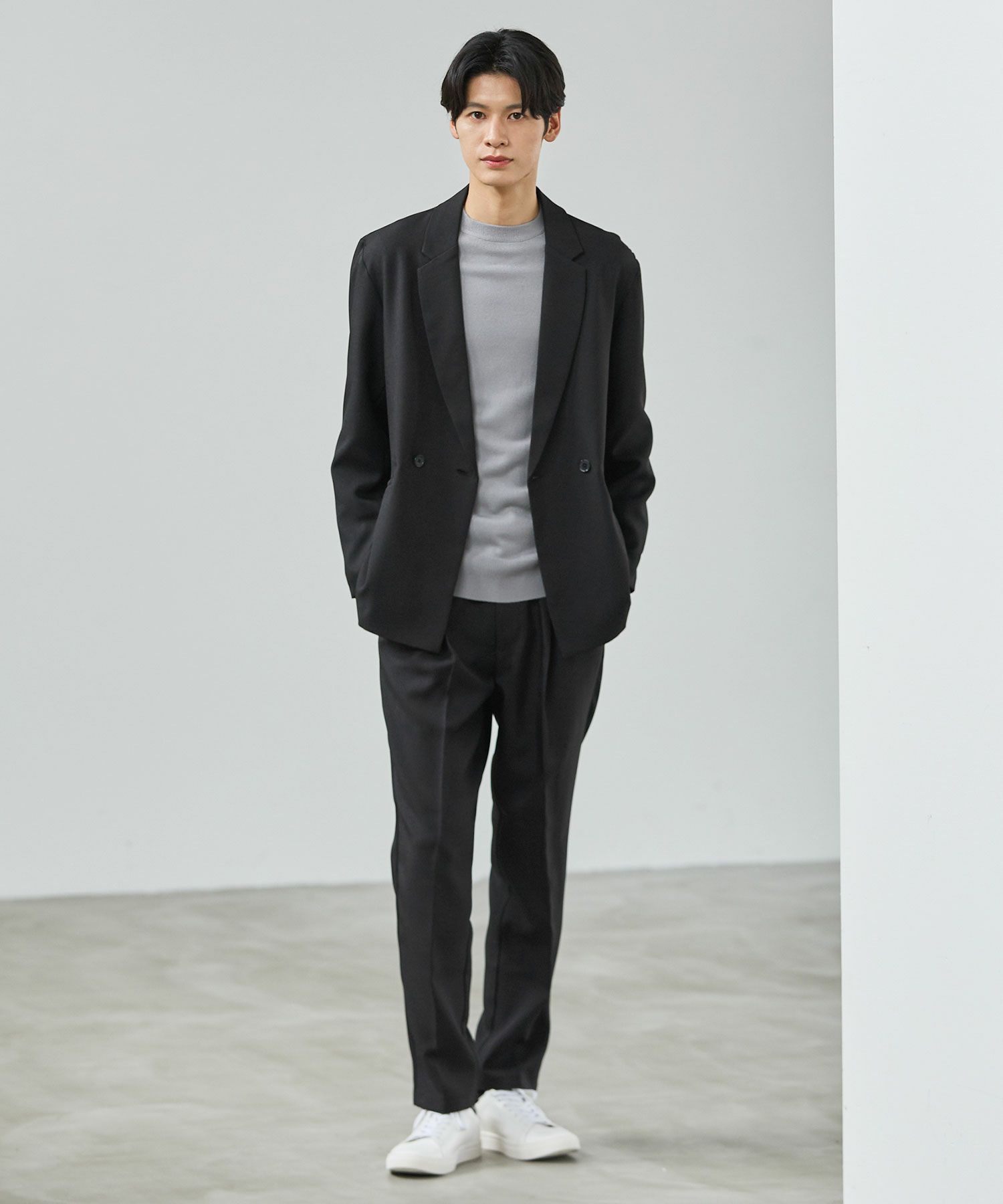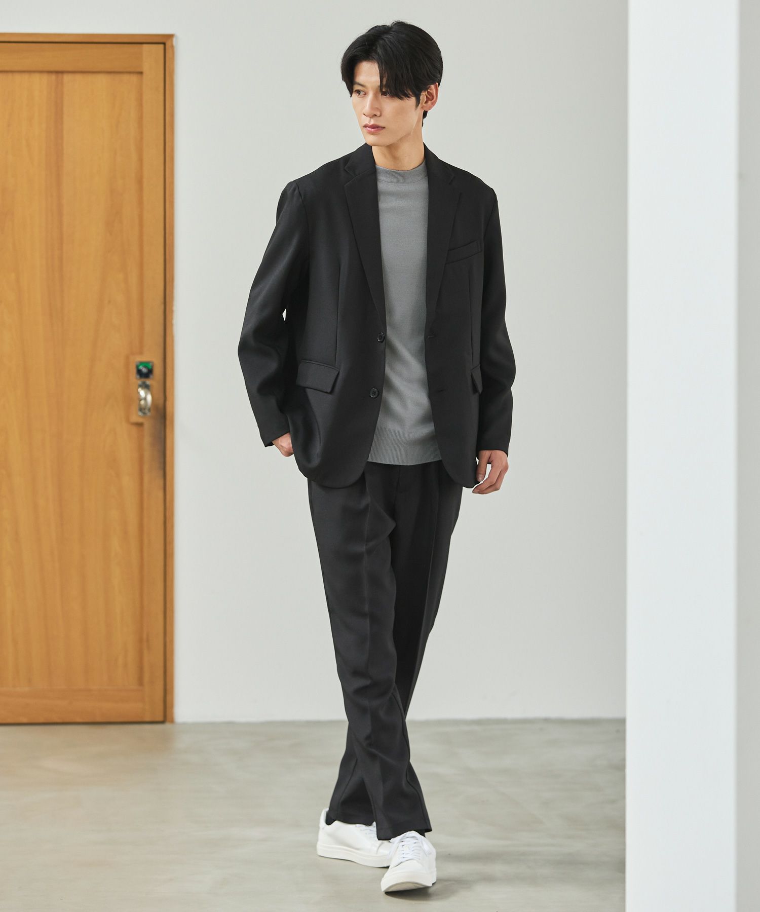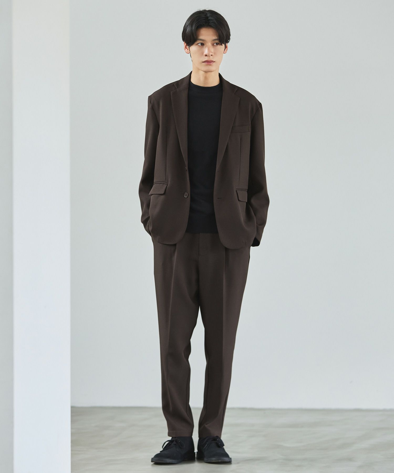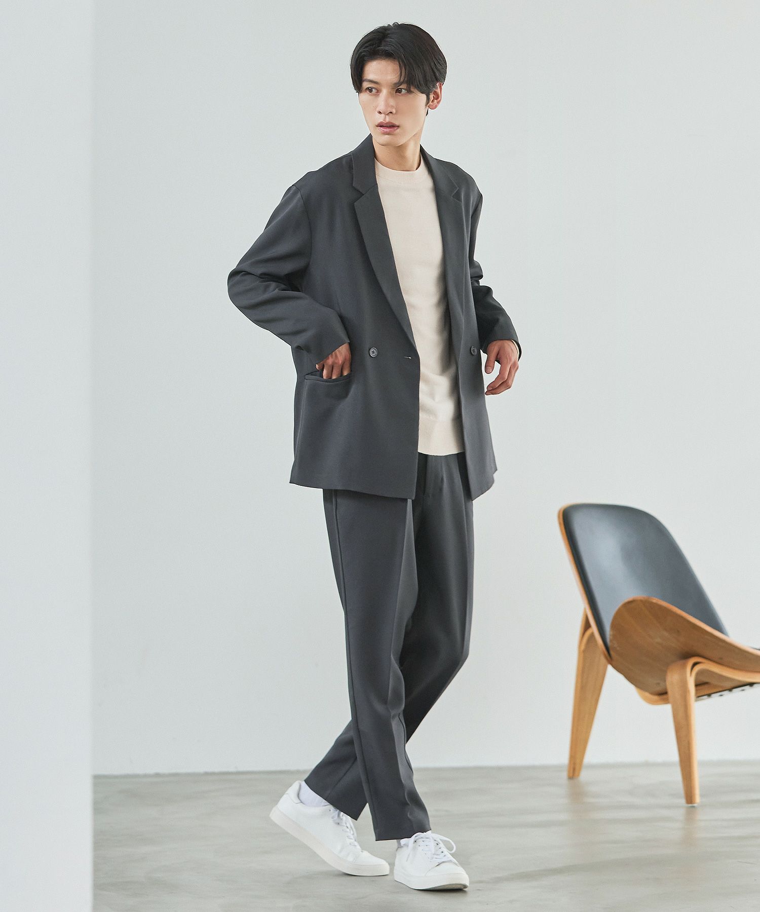 ESSENTIALS WARDROBEのセットアップは「3点セットアップ」。その名の通り、上下に加えてインナーになるニットアイテムもセットにしたまさに「届いてすぐにサマになるセットアップ」です。3点すべてが一緒に着用すること考えられたサイジングなので、理想のキレイめな着こなしが体感できる自信作。手軽に、それでいて大人が目指すキレイめカジュアルをお届けします。