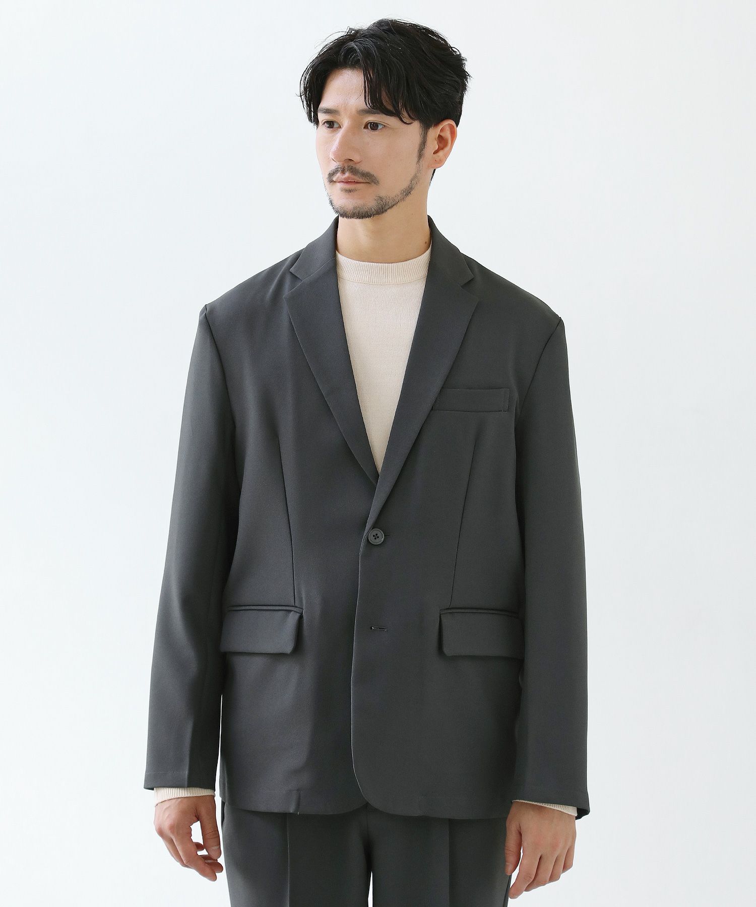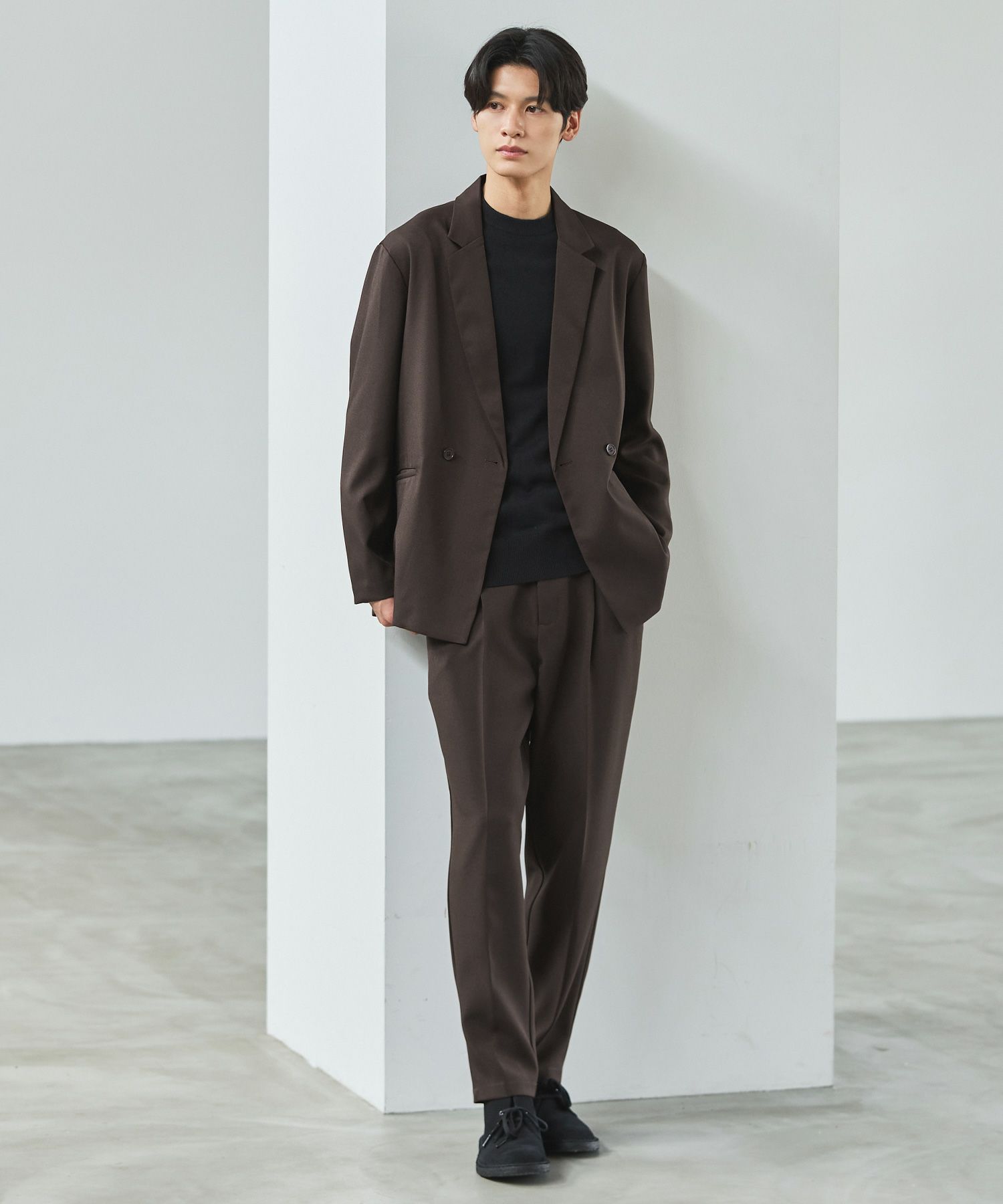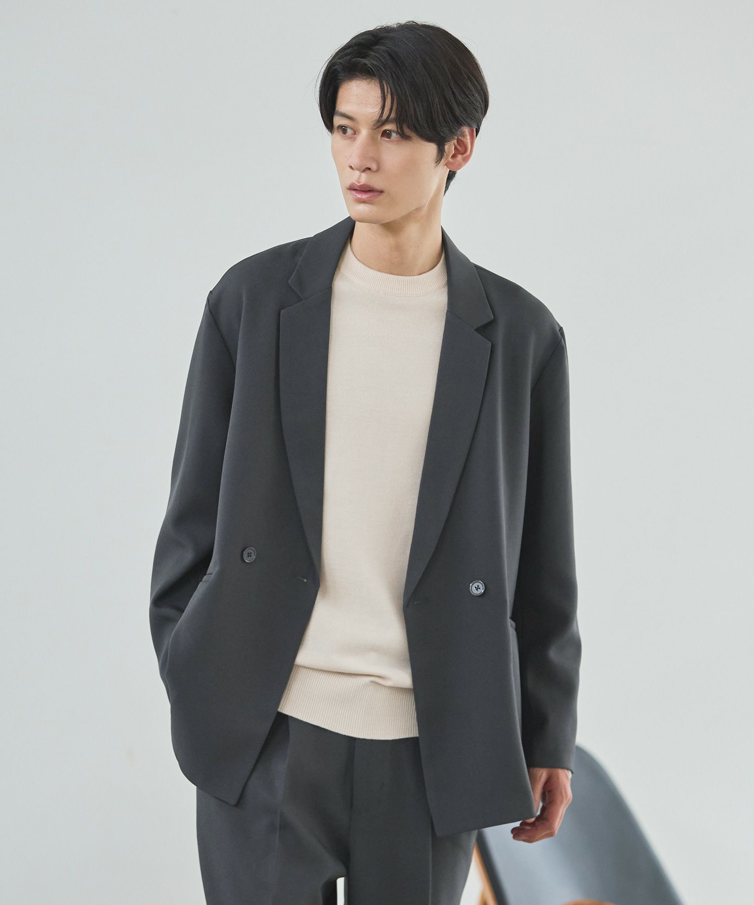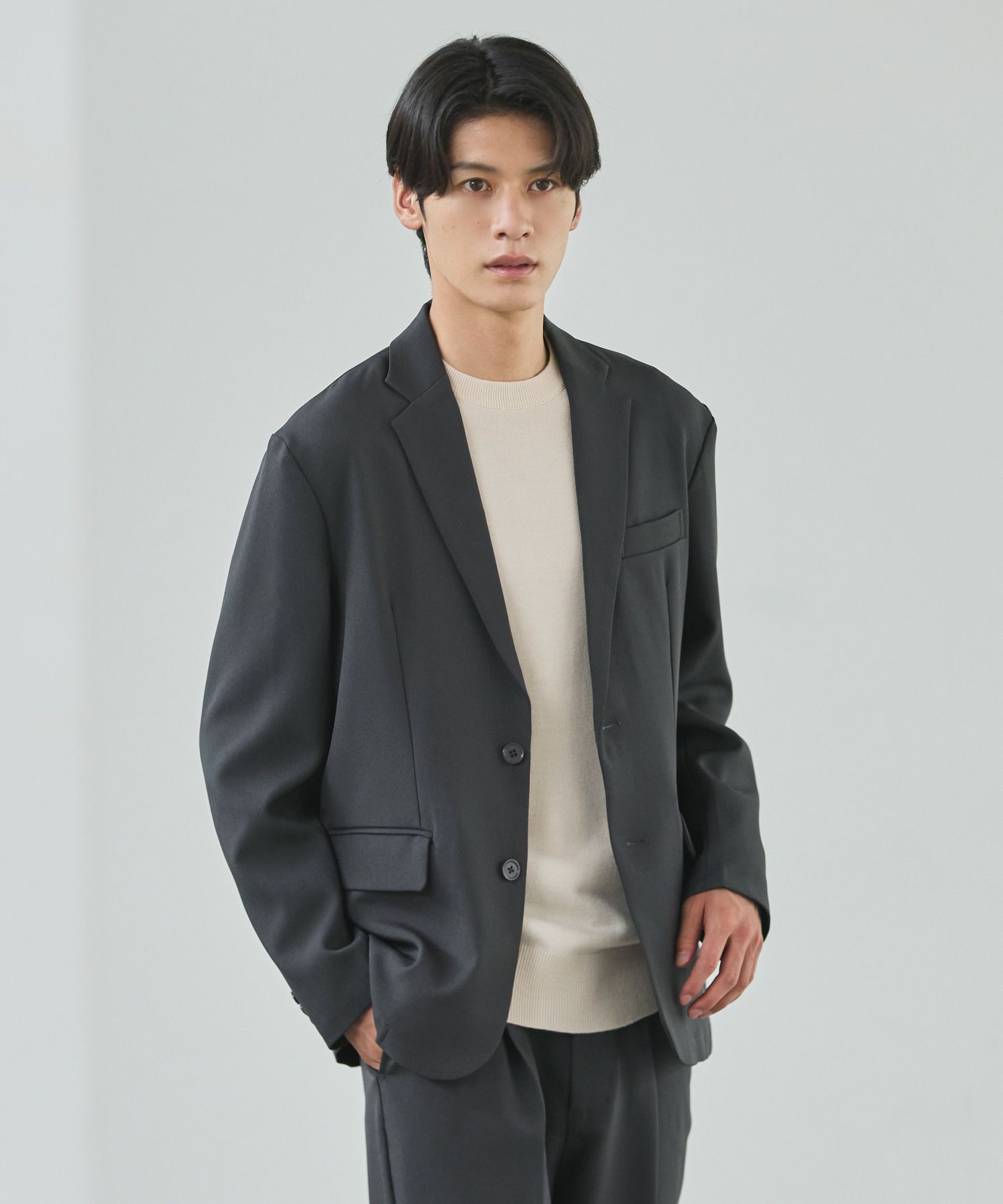 ESSENTIALS WARDROBEのセットアップは「3点セットアップ」。その名の通り、上下に加えてインナーになるニットアイテムもセットにしたまさに「届いてすぐにサマになるセットアップ」です。3点すべてが一緒に着用すること考えられたサイジングなので、理想のキレイめな着こなしが体感できる自信作。手軽に、それでいて大人が目指すキレイめカジュアルをお届けします。