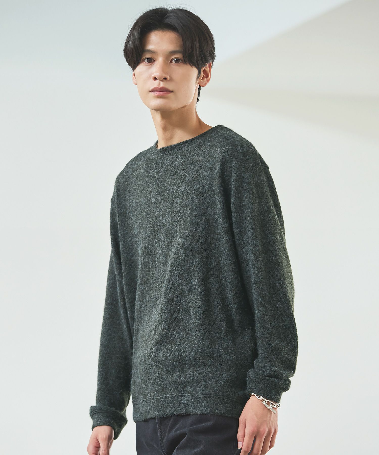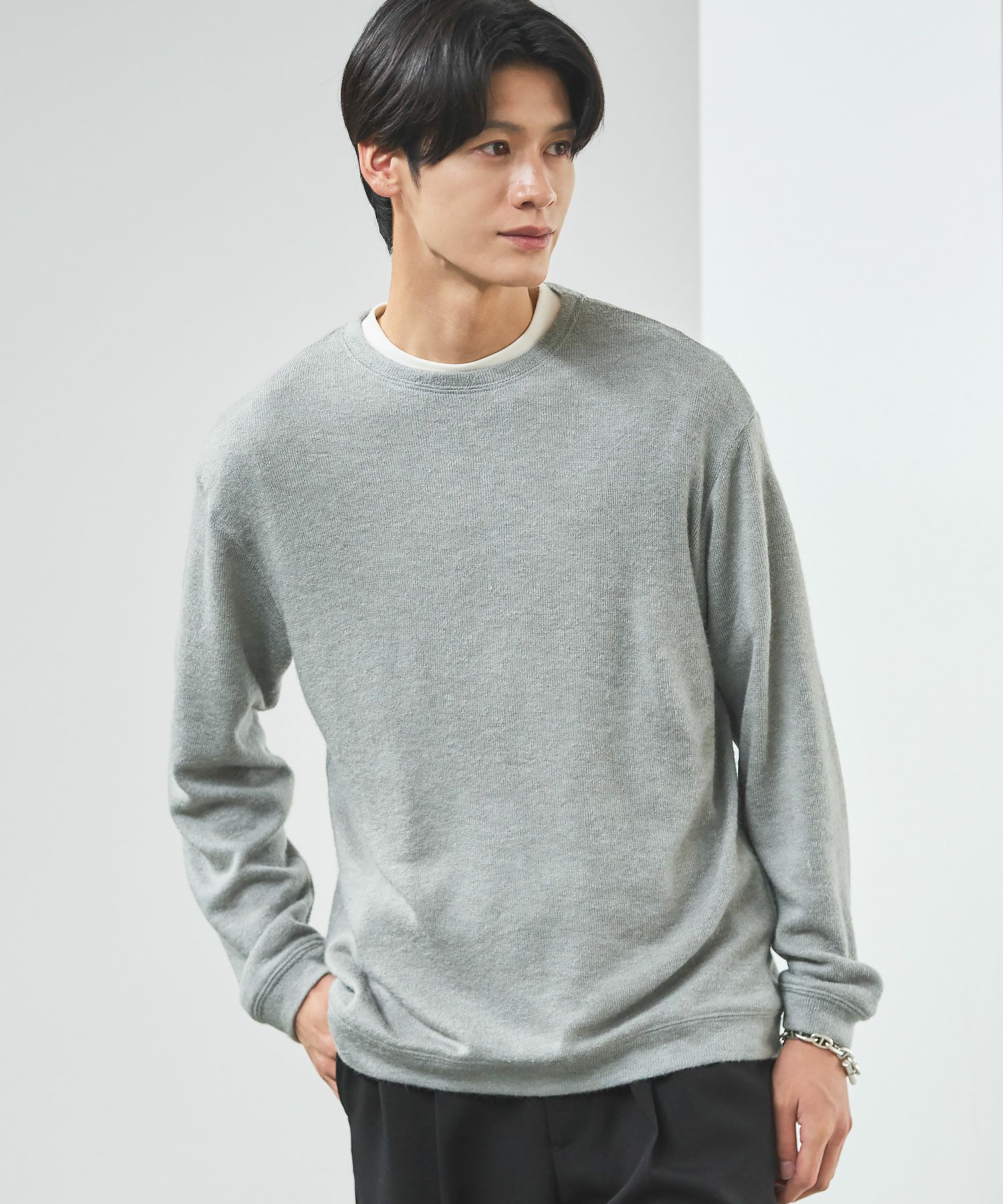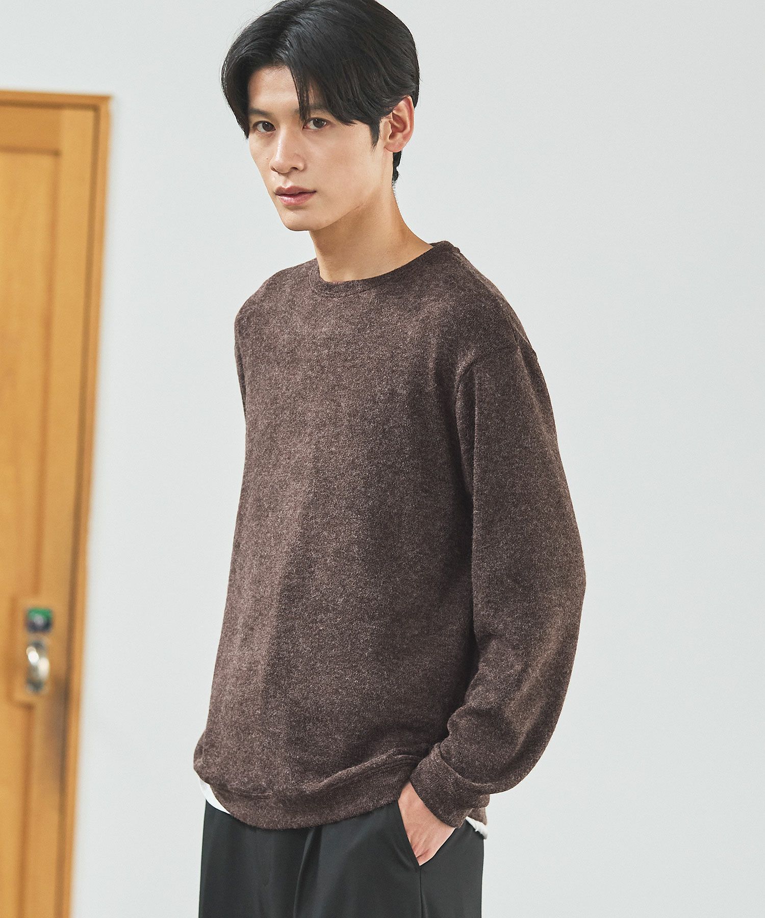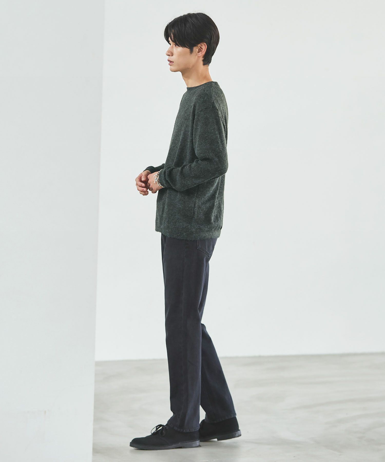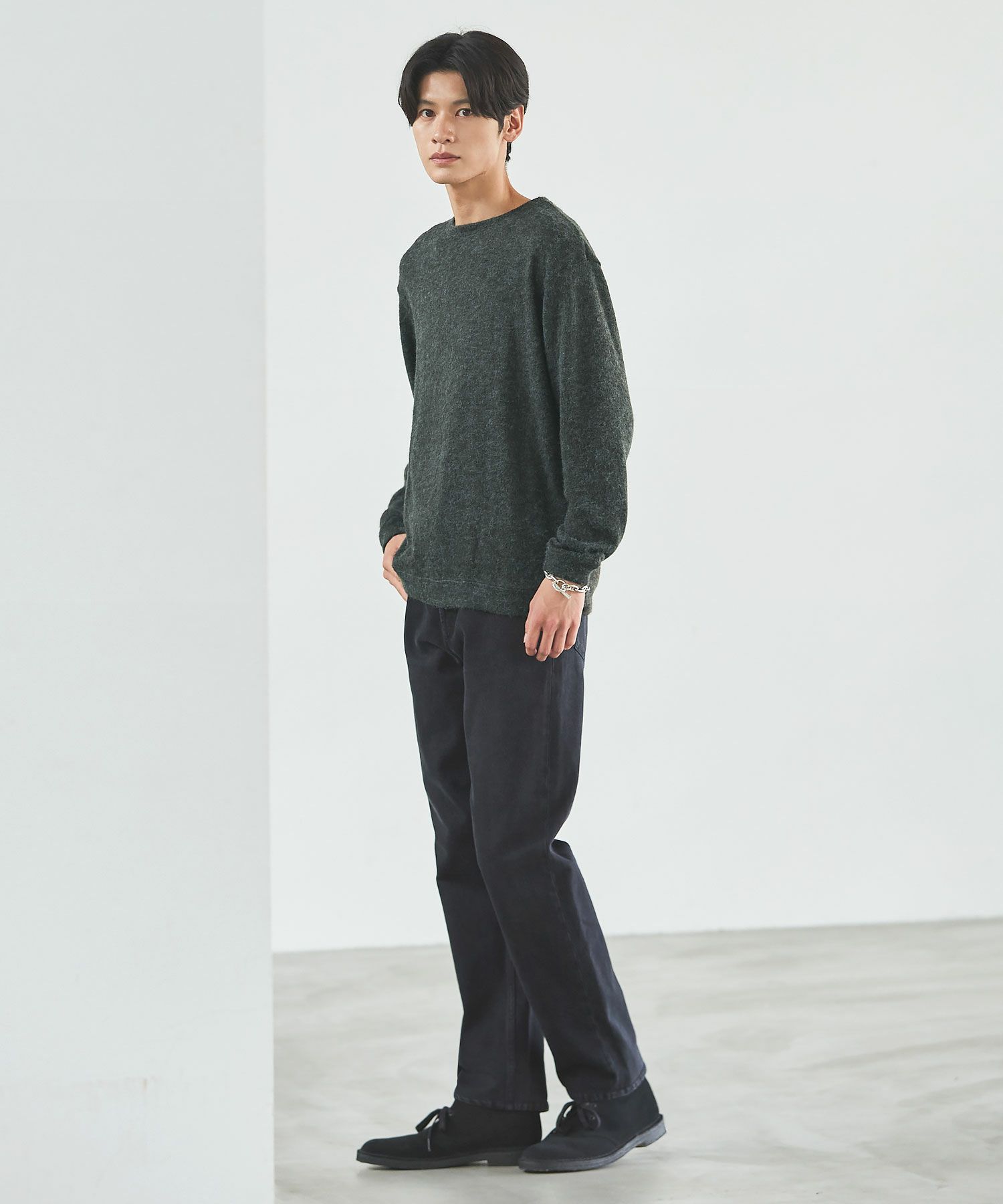 メランジ(杢調)とシャギー感を併せ持った表情のあるクルーネックニットとの着用例。これくらいの表情感ならオフィスカジュアルとしても成立するのではないでしょうか。ウォーム感もあって、温かみのある着こなし。