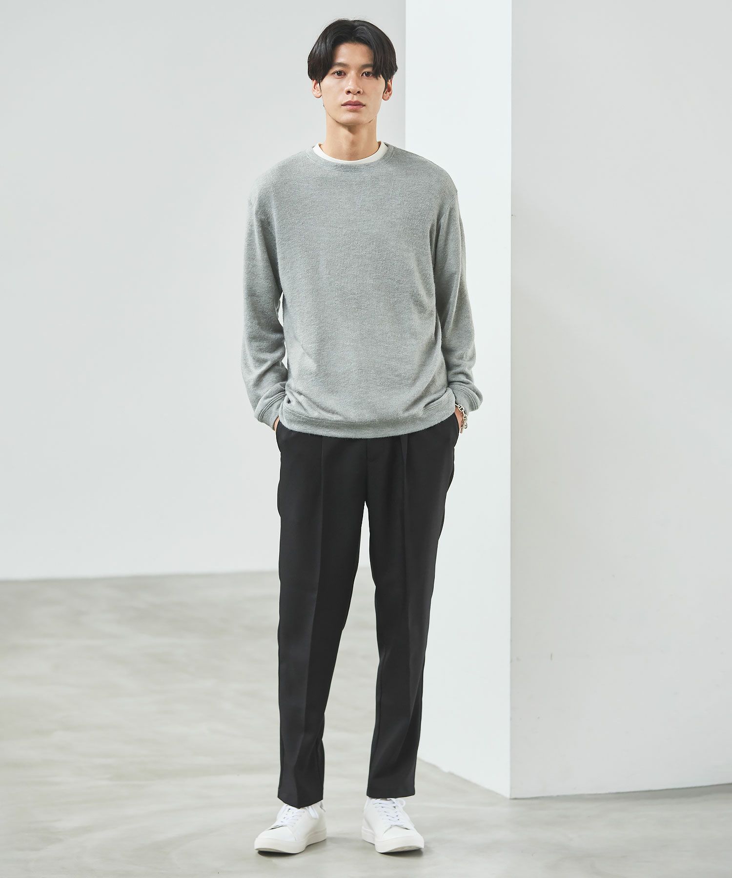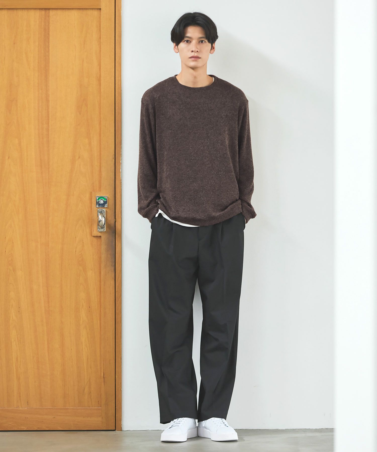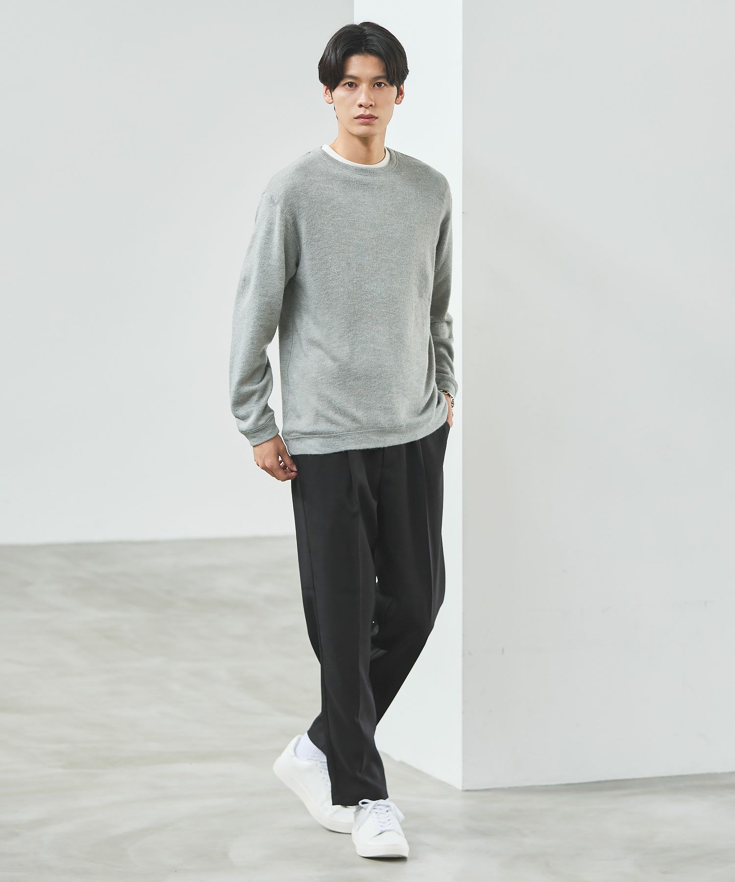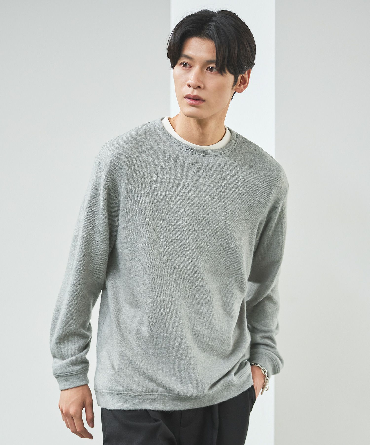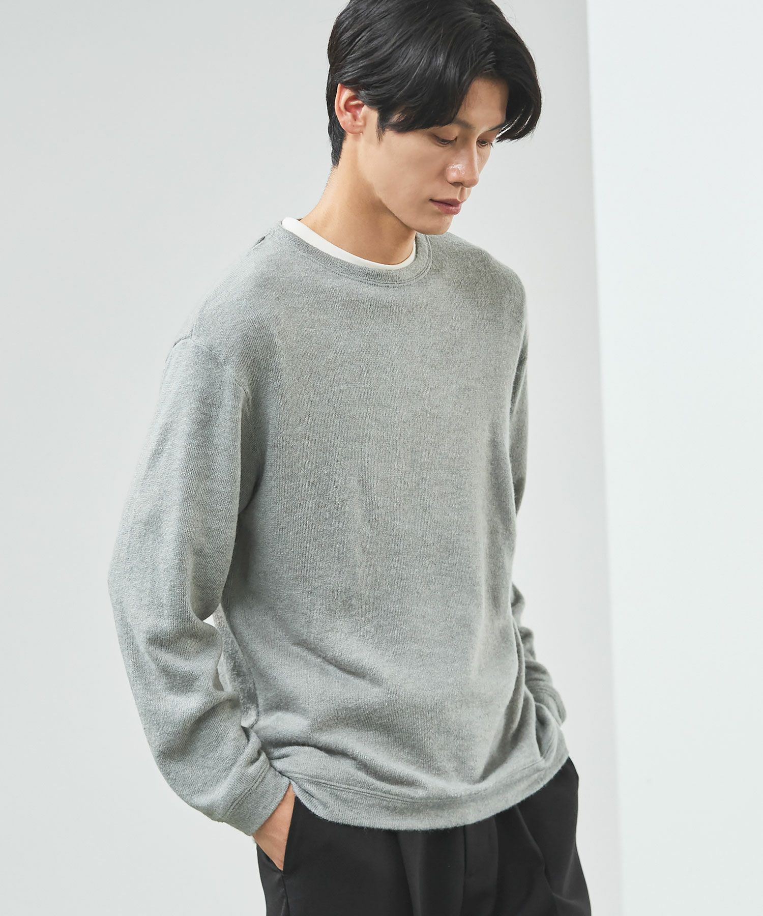 メランジ(杢調)とシャギー感を併せ持った表情のあるクルーネックニットとの着用例。これくらいの表情感ならオフィスカジュアルとしても成立するのではないでしょうか。ウォーム感もあって、温かみのある着こなし。