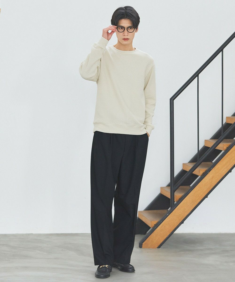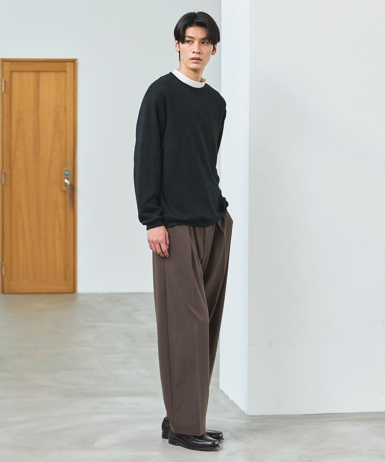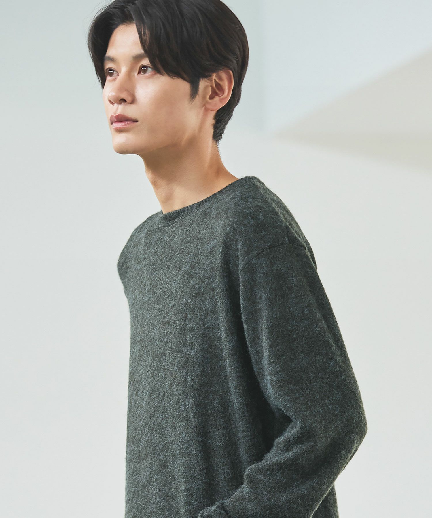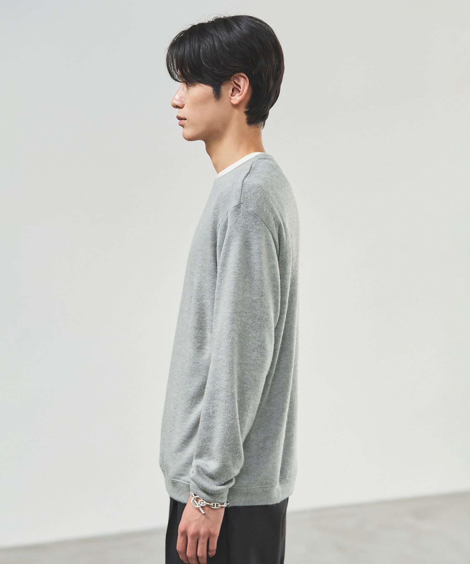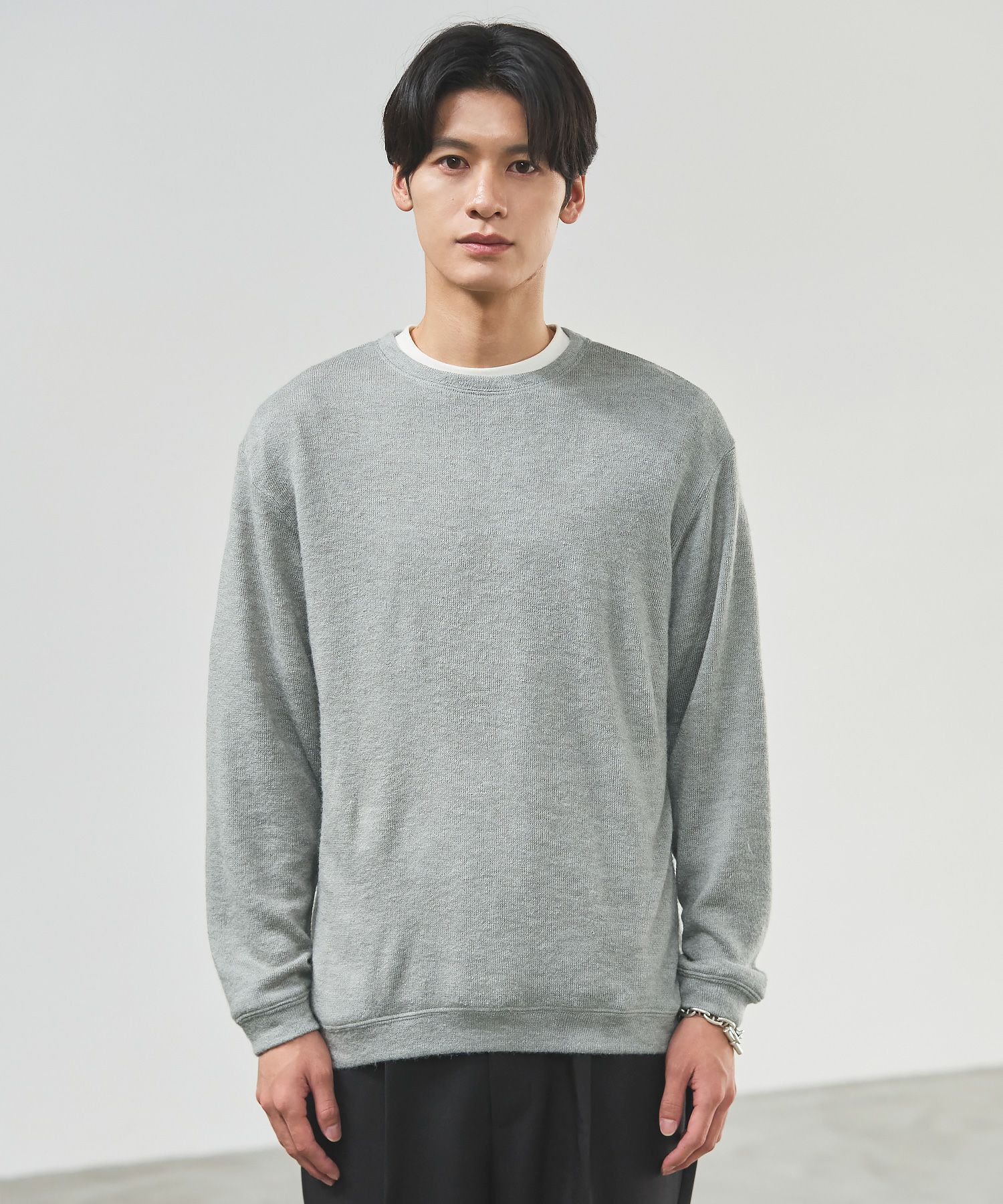 メランジ(杢調)とシャギー感を併せ持った表情のあるクルーネックニットとの着用例。これくらいの表情感ならオフィスカジュアルとしても成立するのではないでしょうか。ウォーム感もあって、温かみのある着こなし。