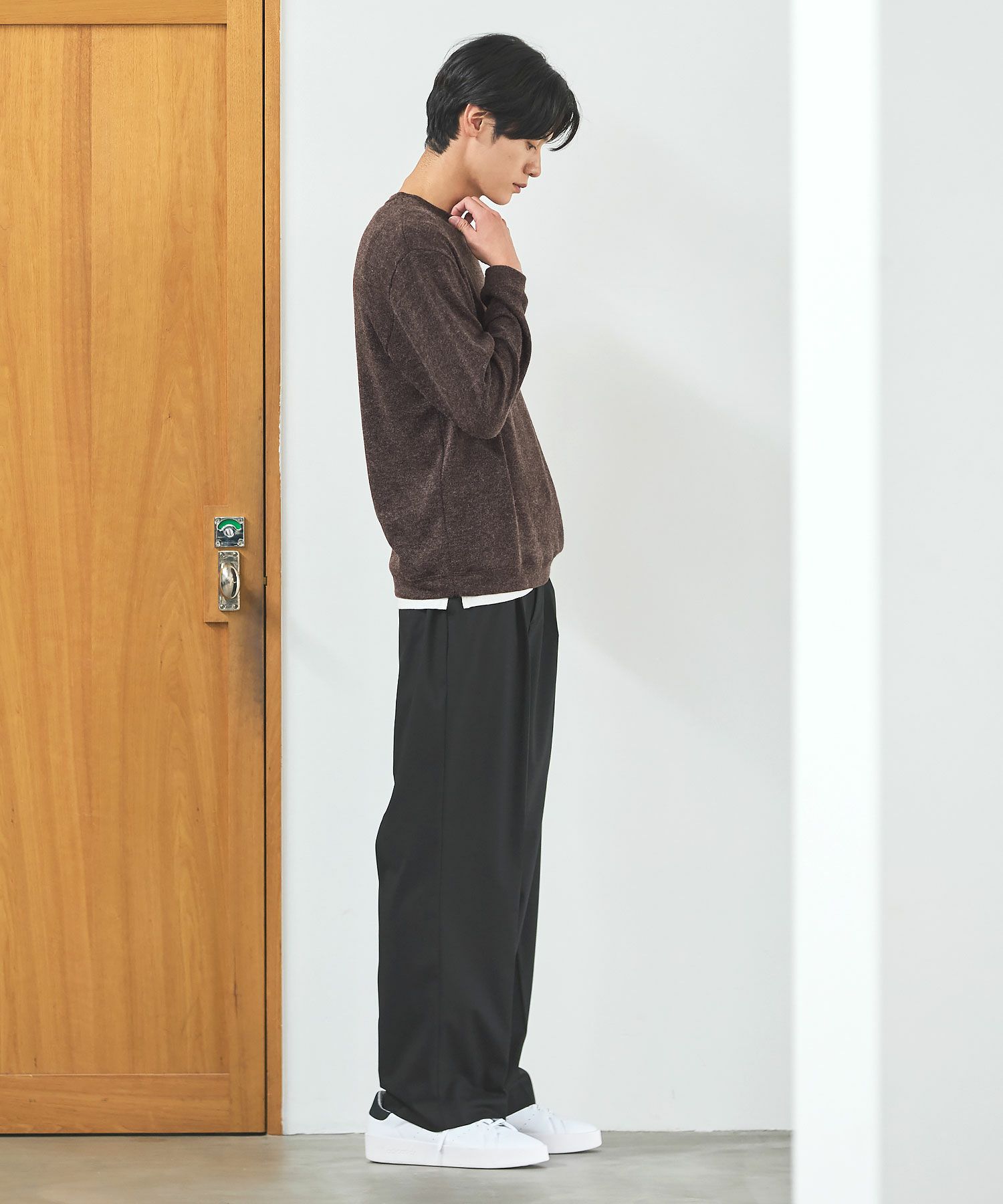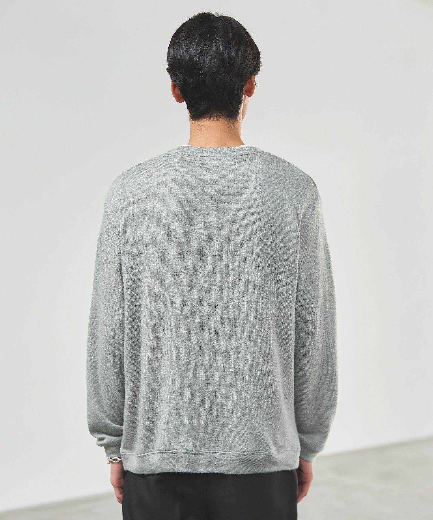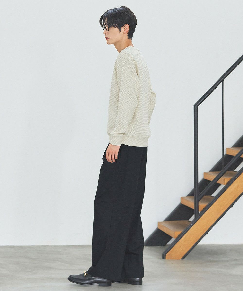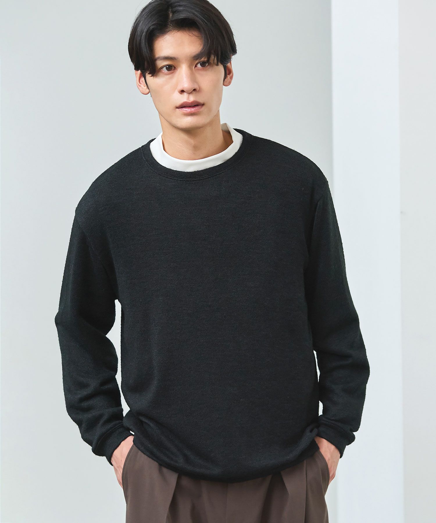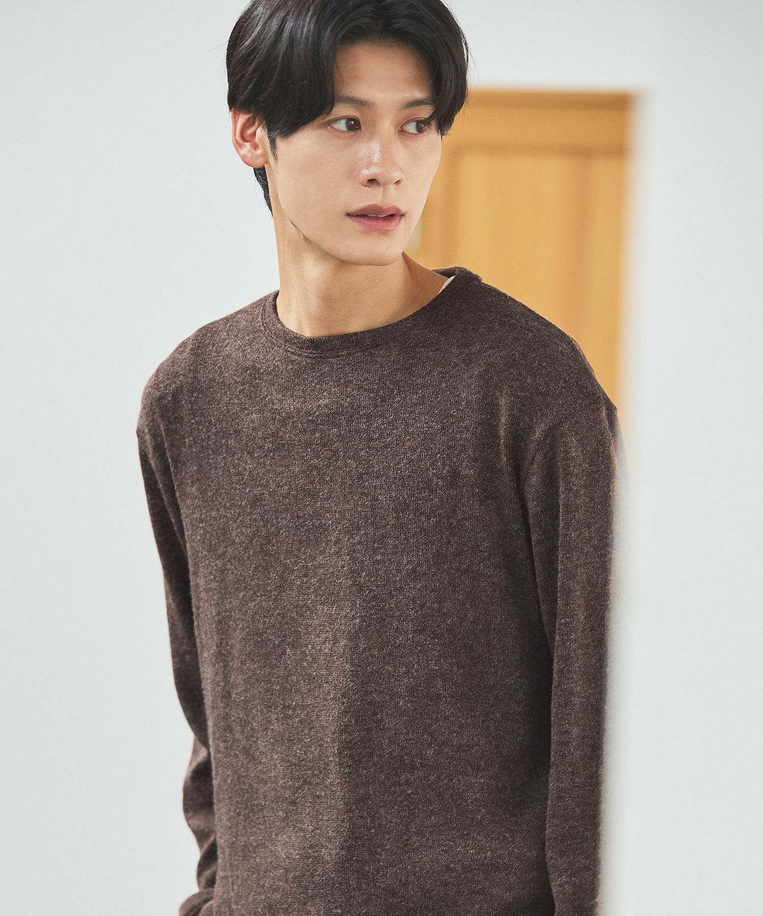 メランジ(杢調)とシャギー感を併せ持った表情のあるクルーネックニットとの着用例。これくらいの表情感ならオフィスカジュアルとしても成立するのではないでしょうか。ウォーム感もあって、温かみのある着こなし。