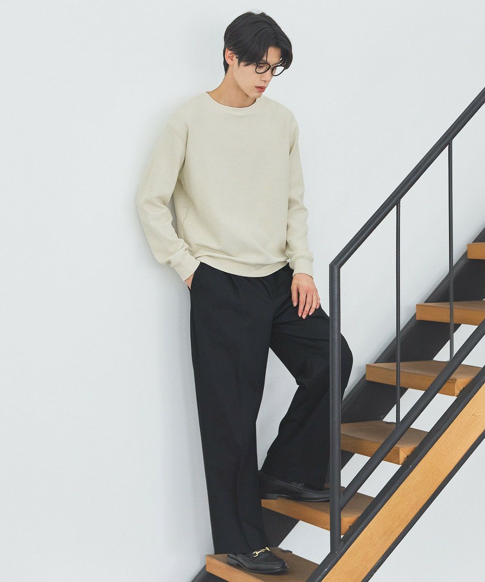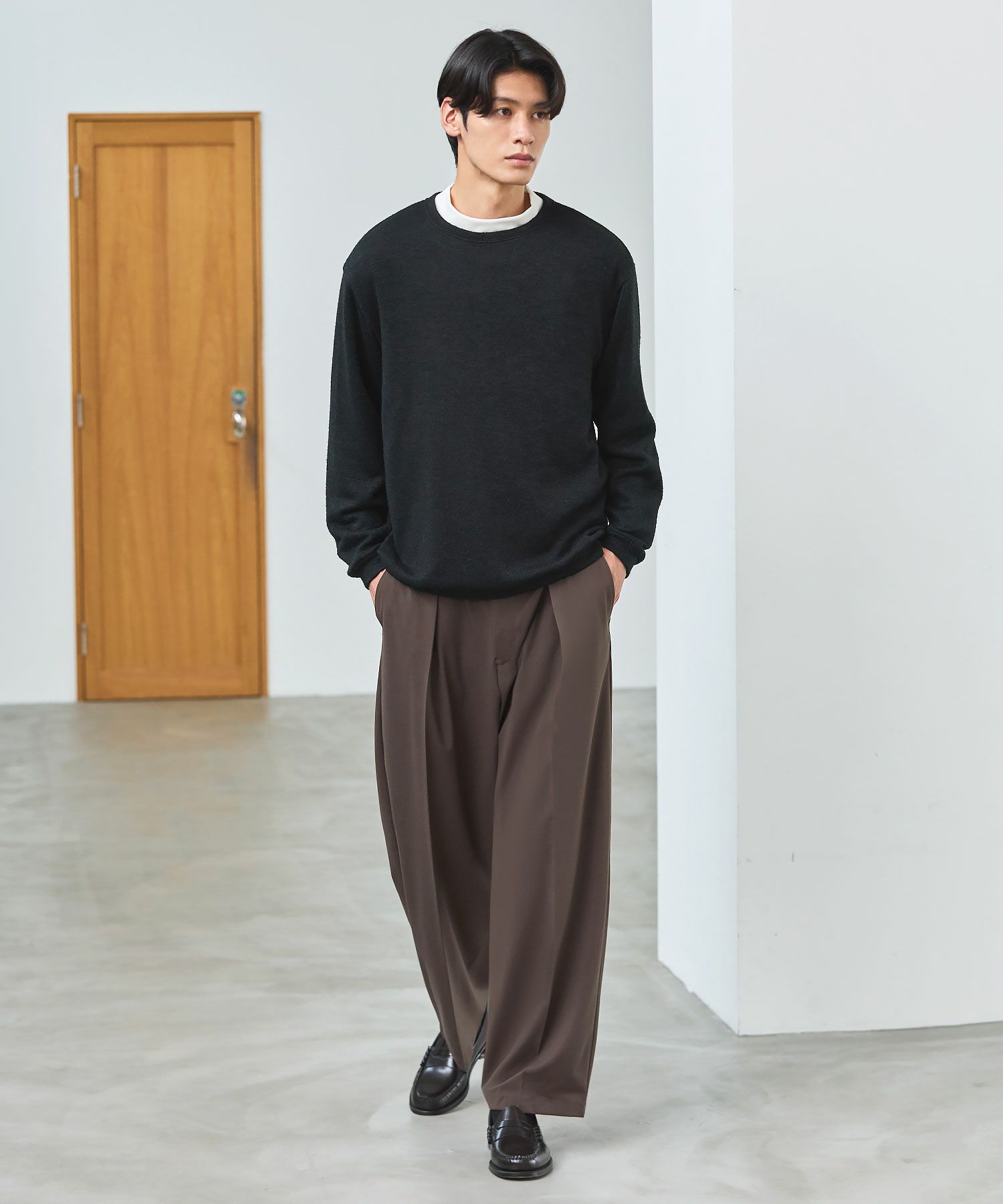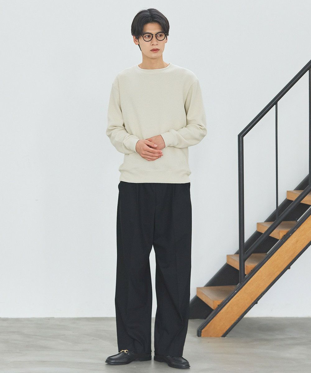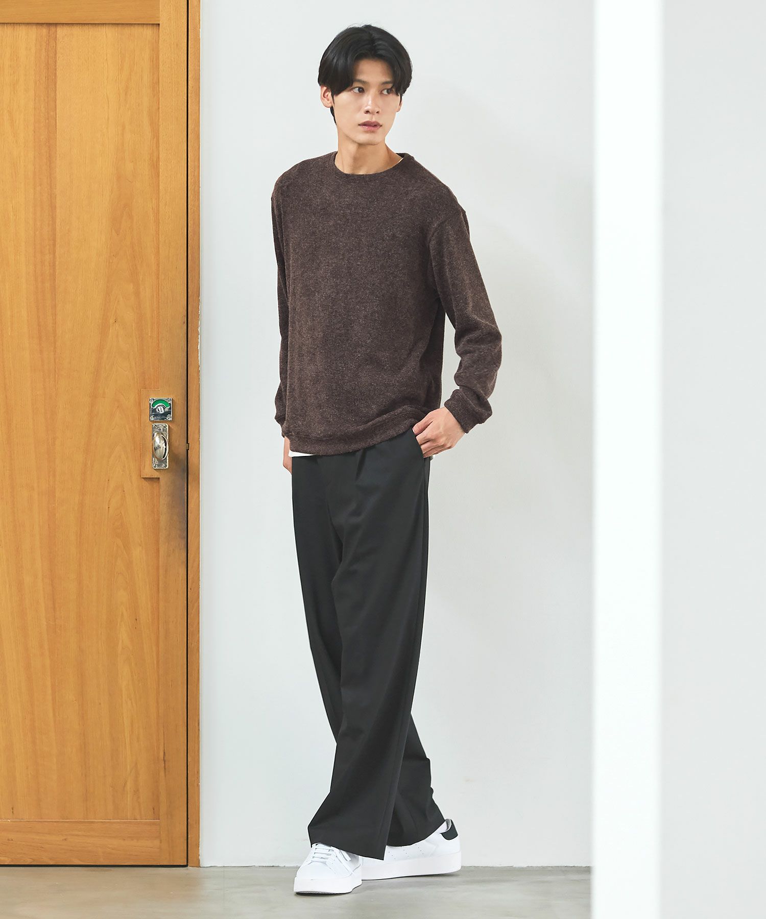 メランジ(杢調)とシャギー感を併せ持った表情のあるクルーネックニットとの着用例。これくらいの表情感ならオフィスカジュアルとしても成立するのではないでしょうか。ウォーム感もあって、温かみのある着こなし。