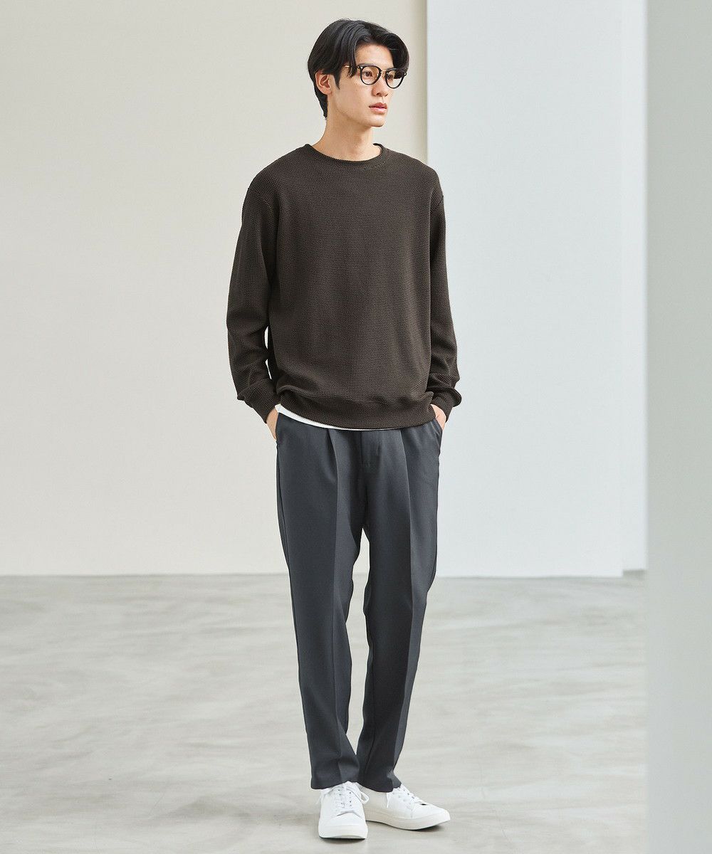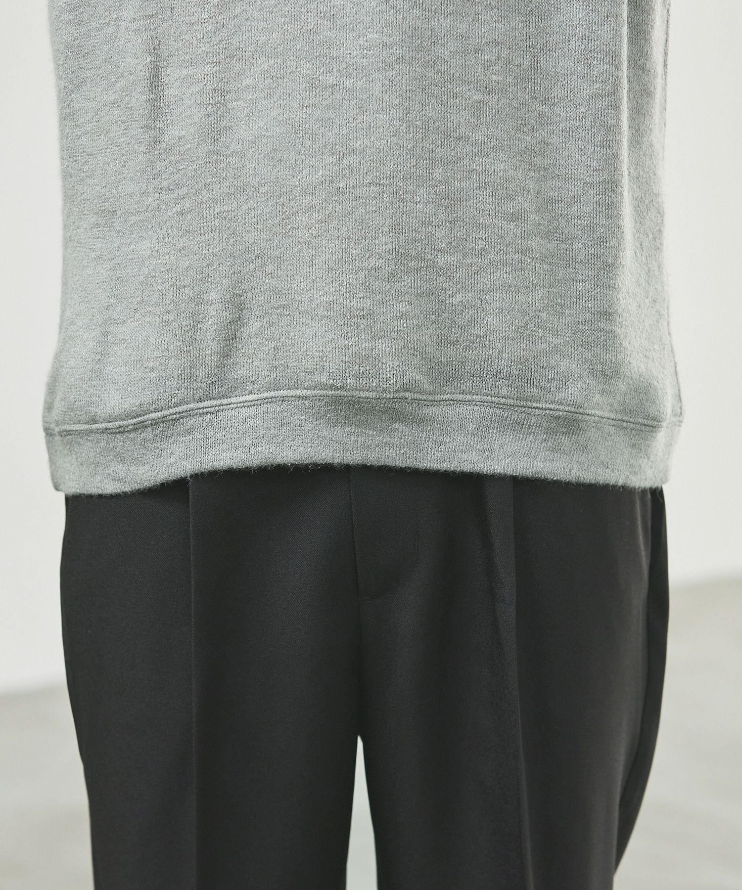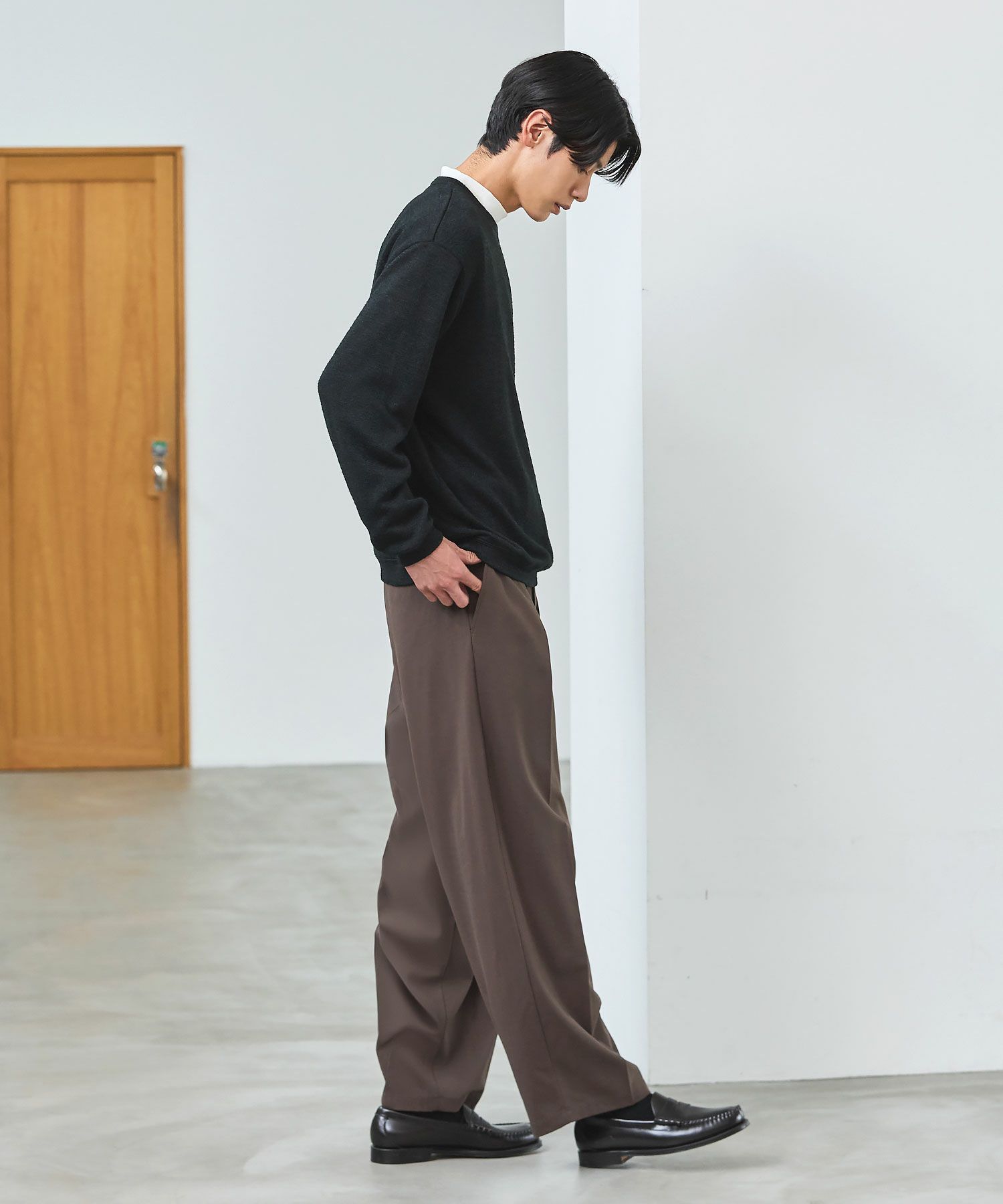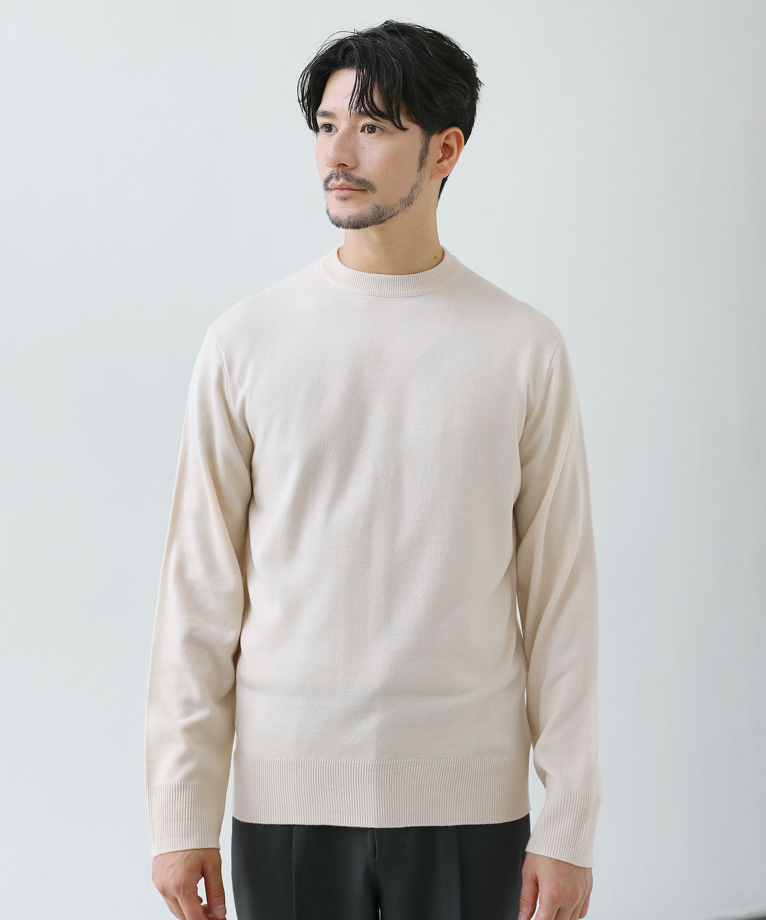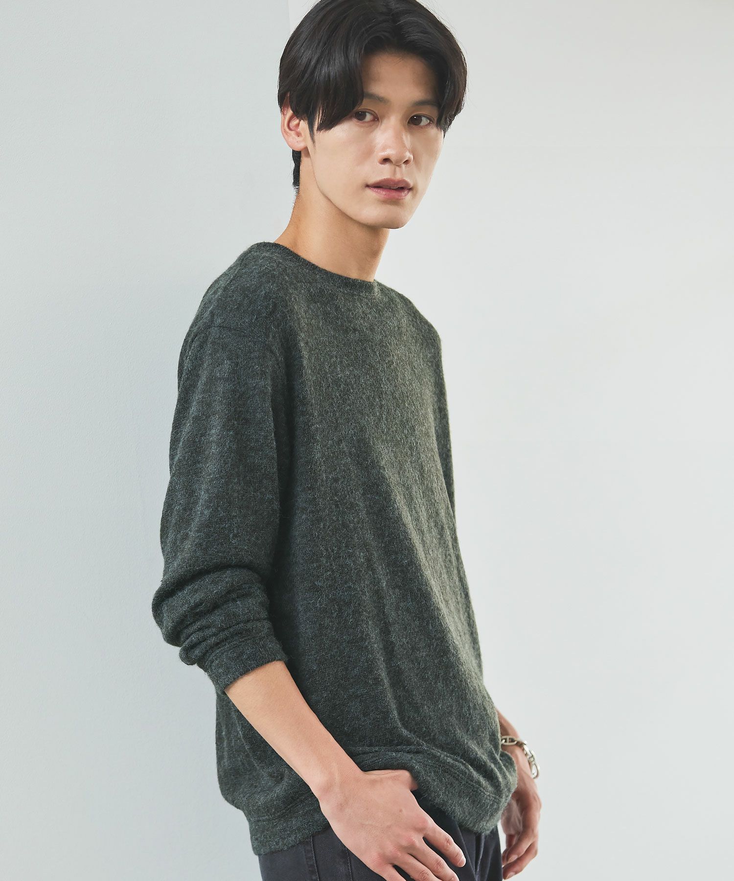 メランジ(杢調)とシャギー感を併せ持った表情のあるクルーネックニットとの着用例。これくらいの表情感ならオフィスカジュアルとしても成立するのではないでしょうか。ウォーム感もあって、温かみのある着こなし。