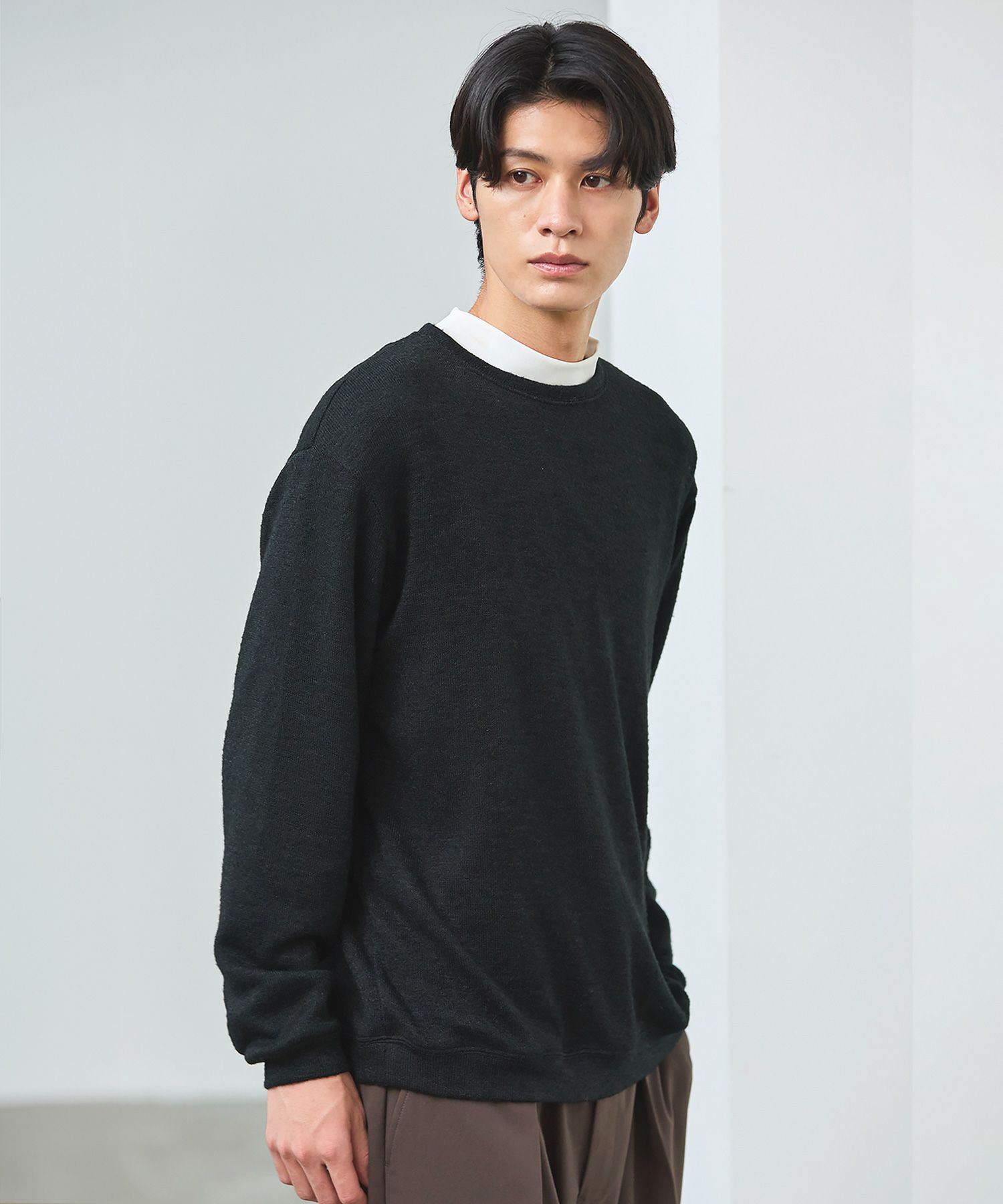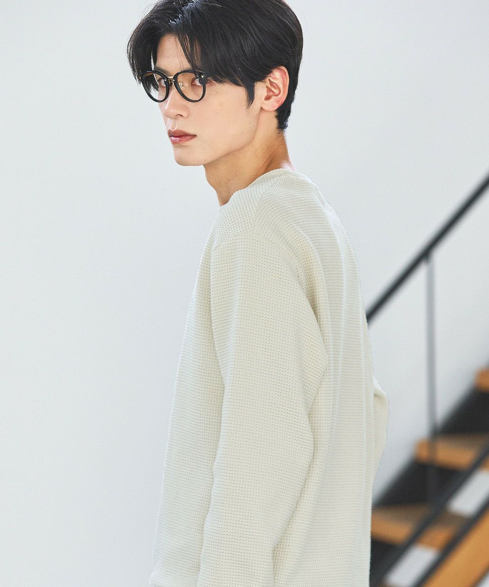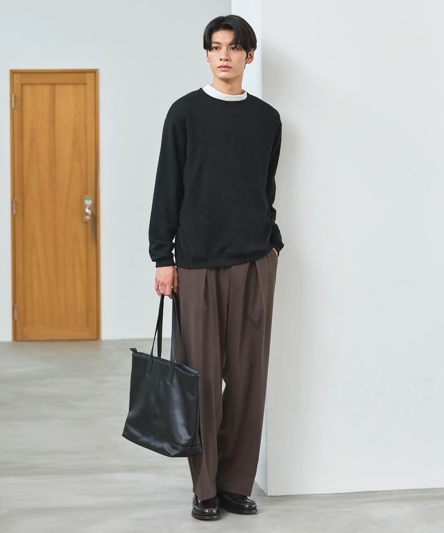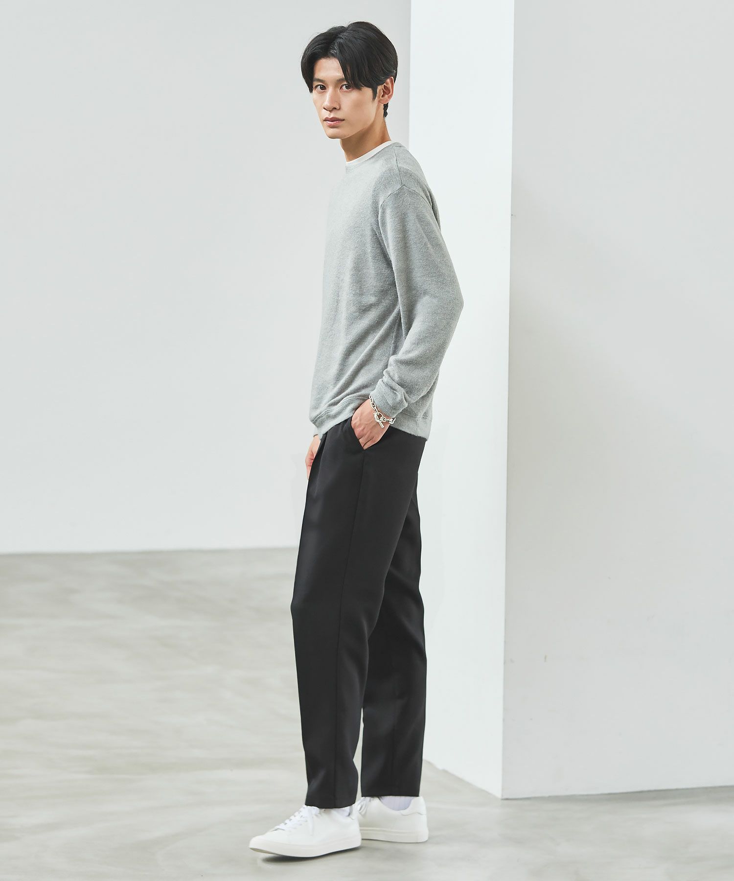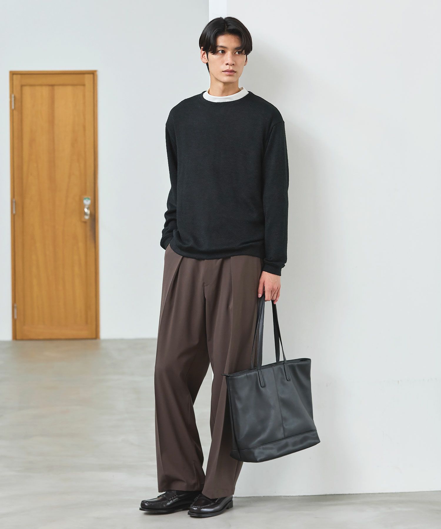 メランジ(杢調)とシャギー感を併せ持った表情のあるクルーネックニットとの着用例。これくらいの表情感ならオフィスカジュアルとしても成立するのではないでしょうか。ウォーム感もあって、温かみのある着こなし。