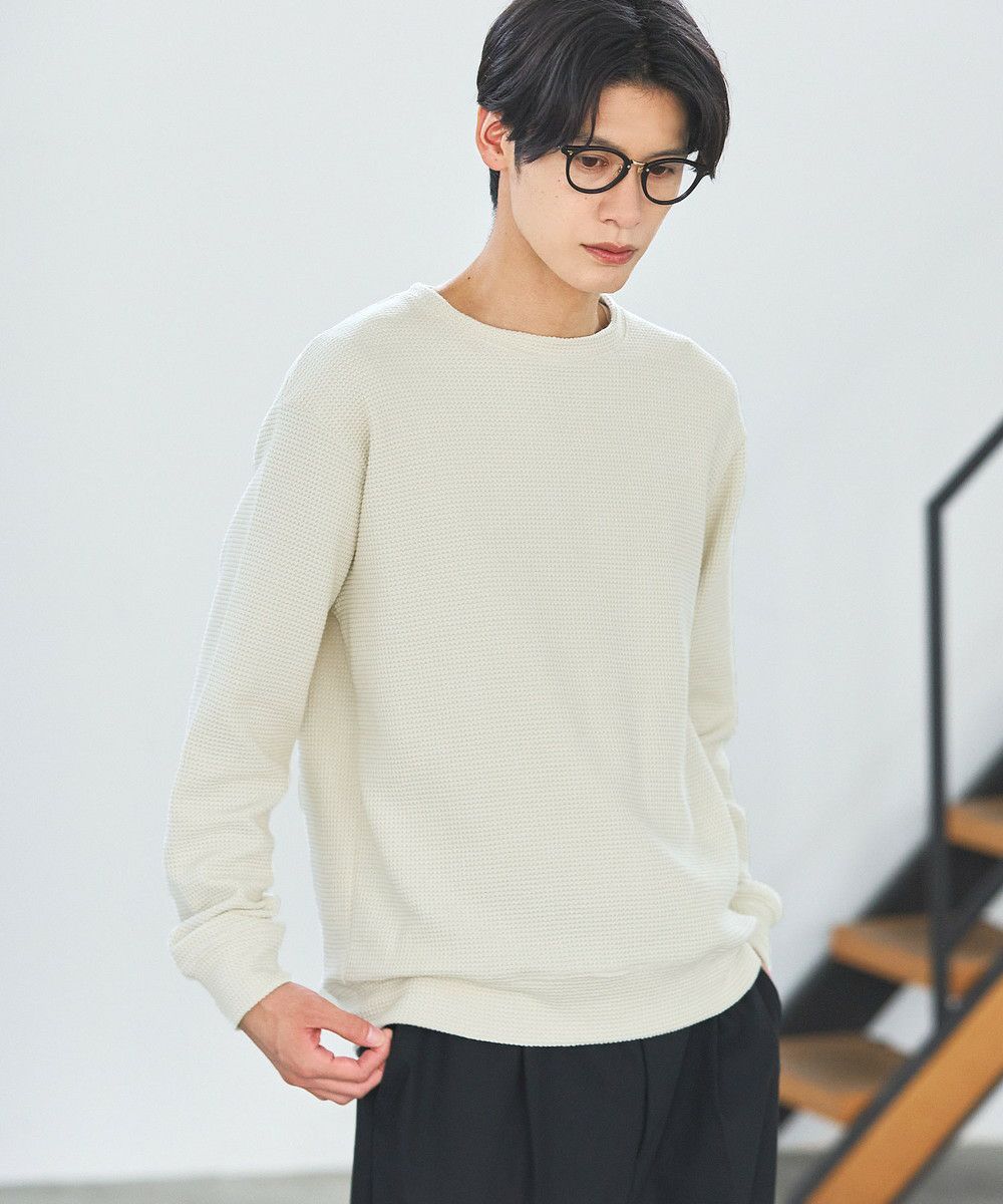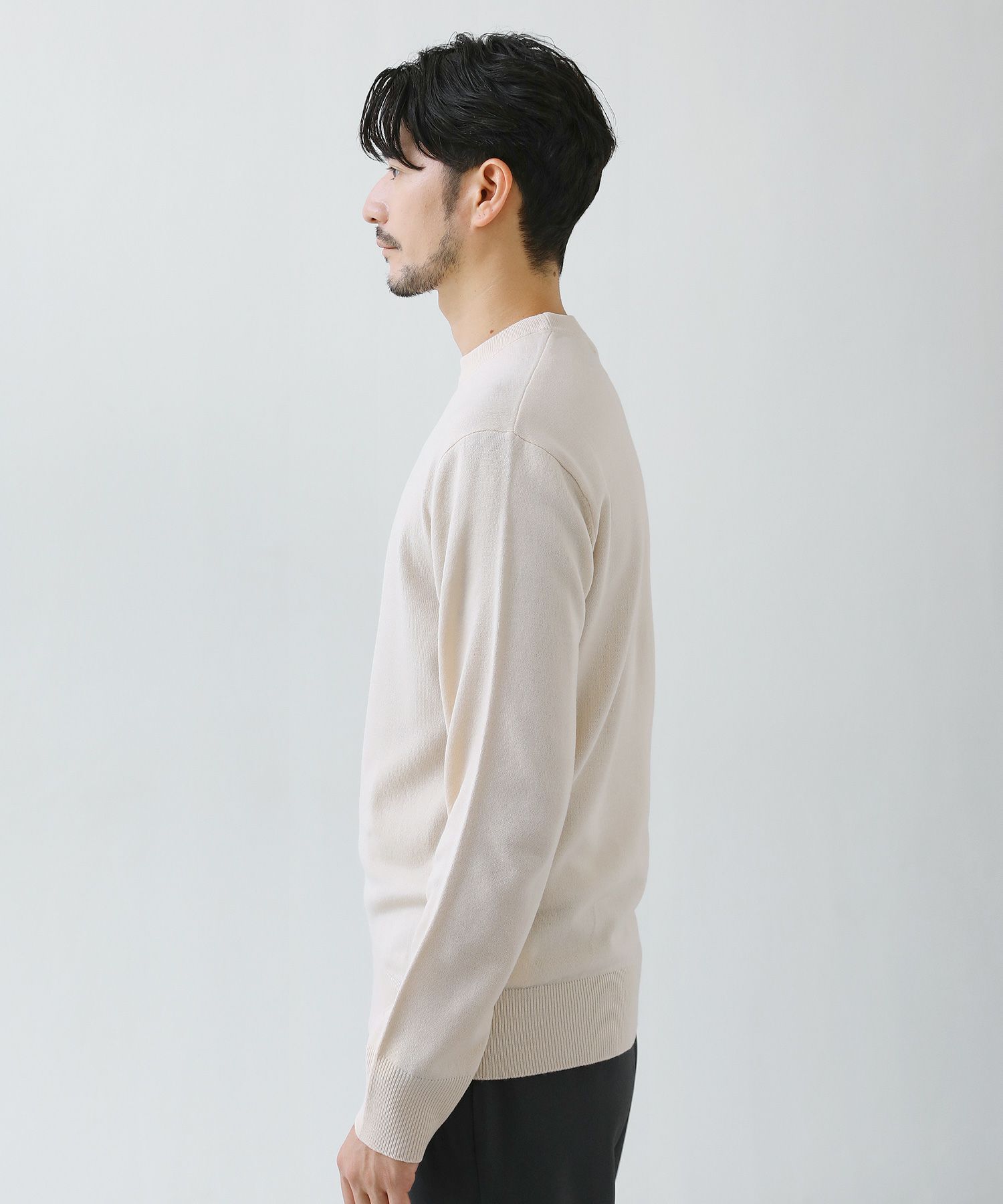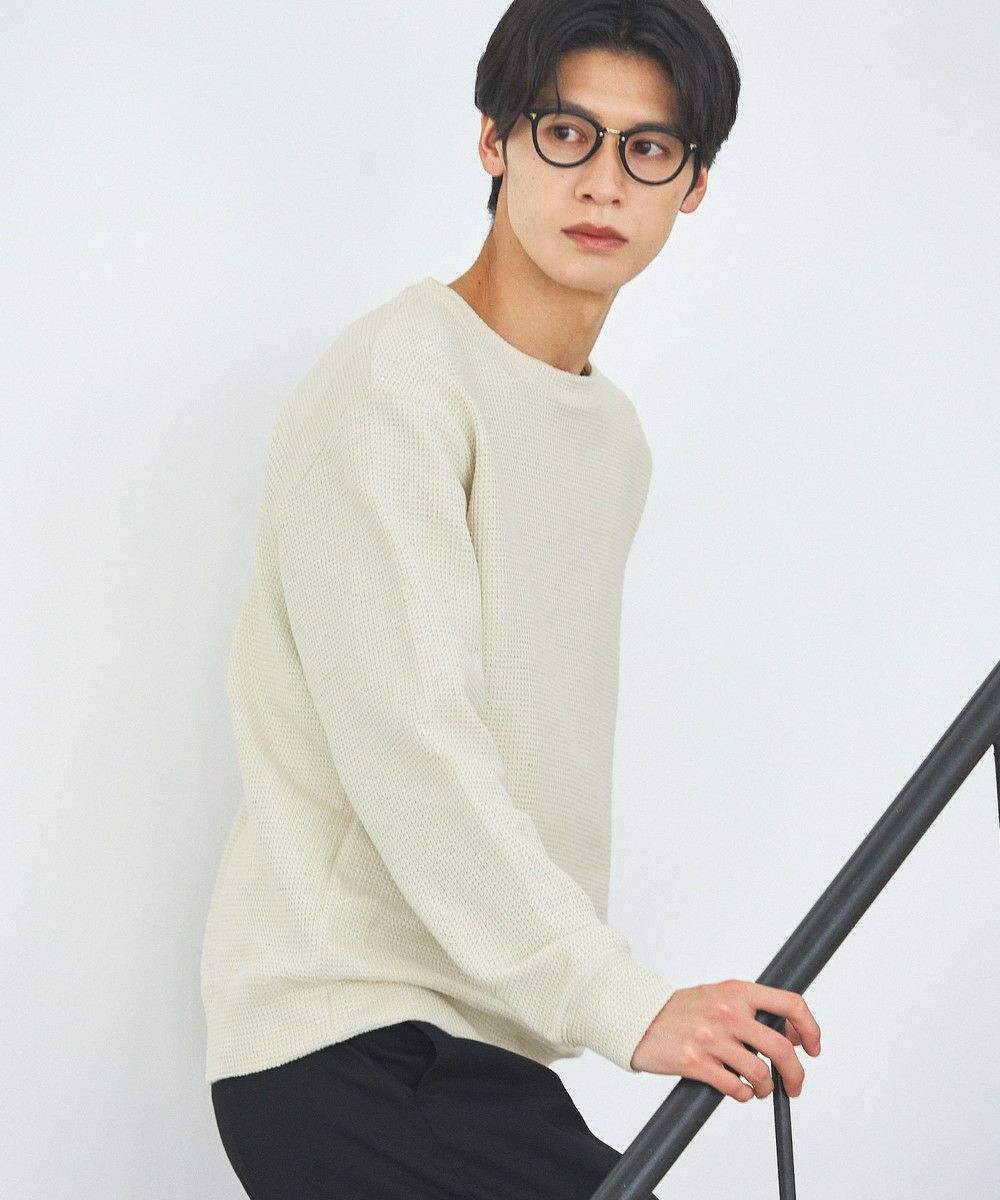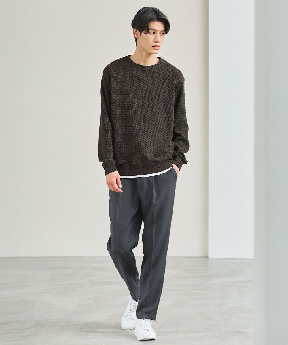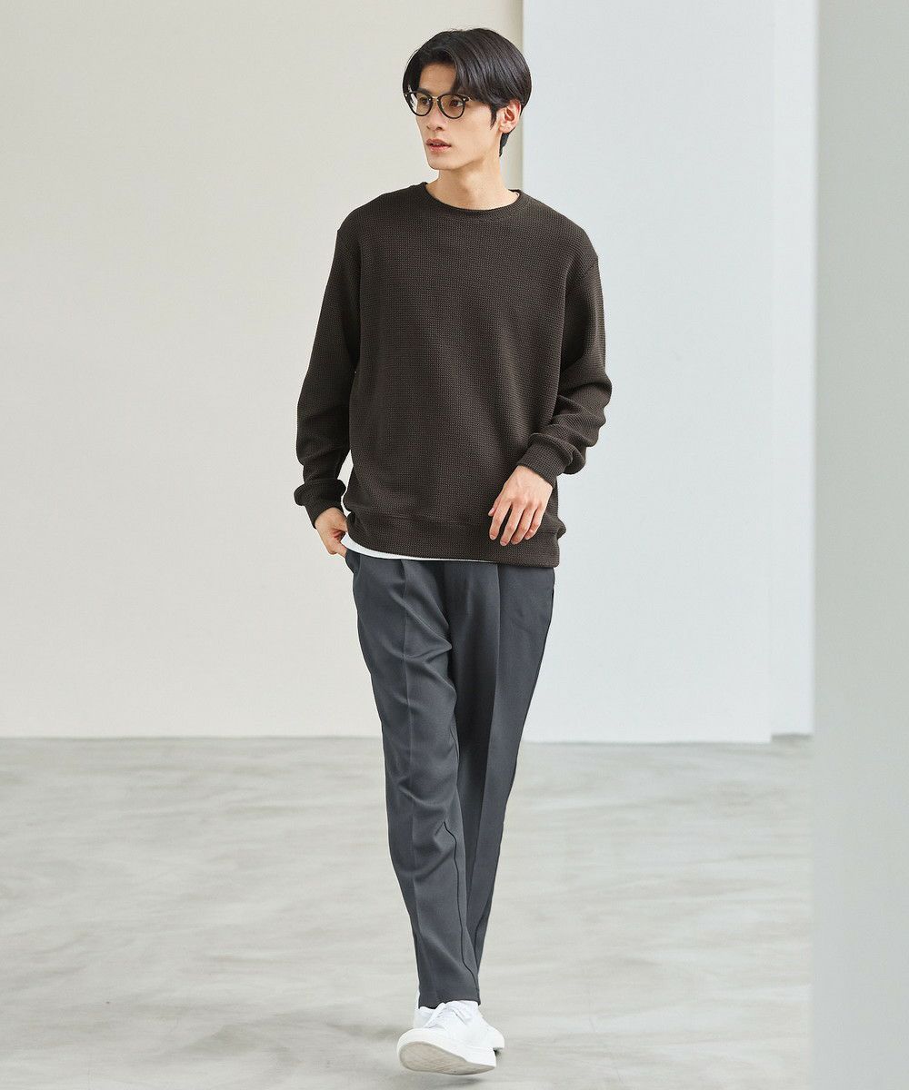 メランジ(杢調)とシャギー感を併せ持った表情のあるクルーネックニットとの着用例。これくらいの表情感ならオフィスカジュアルとしても成立するのではないでしょうか。ウォーム感もあって、温かみのある着こなし。