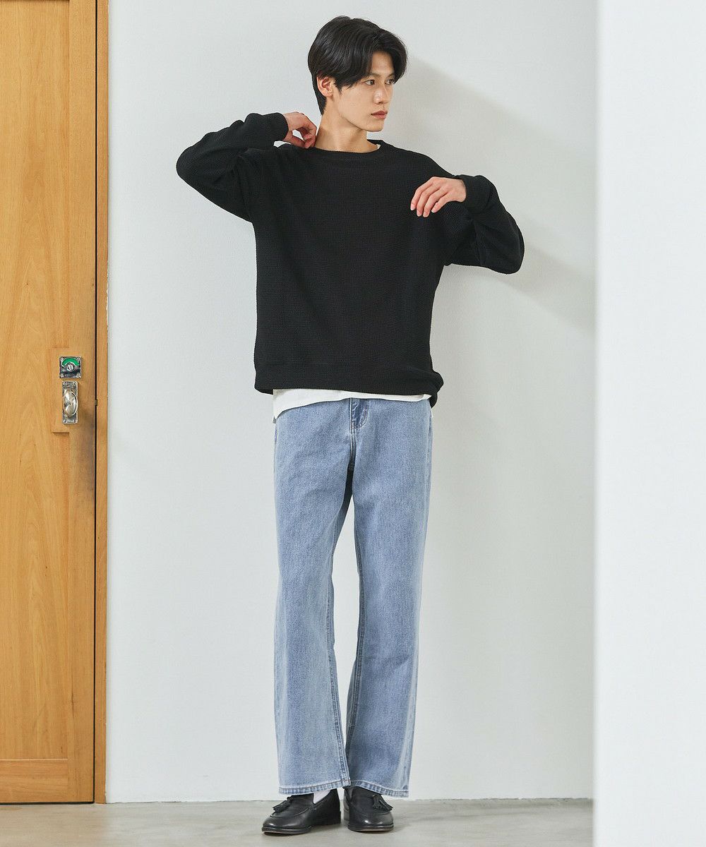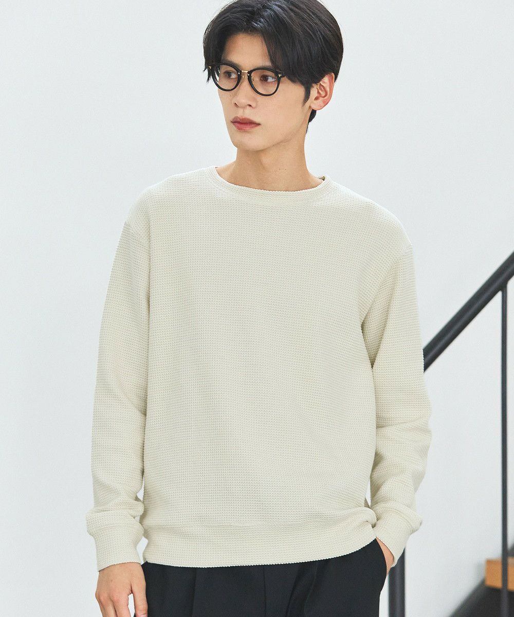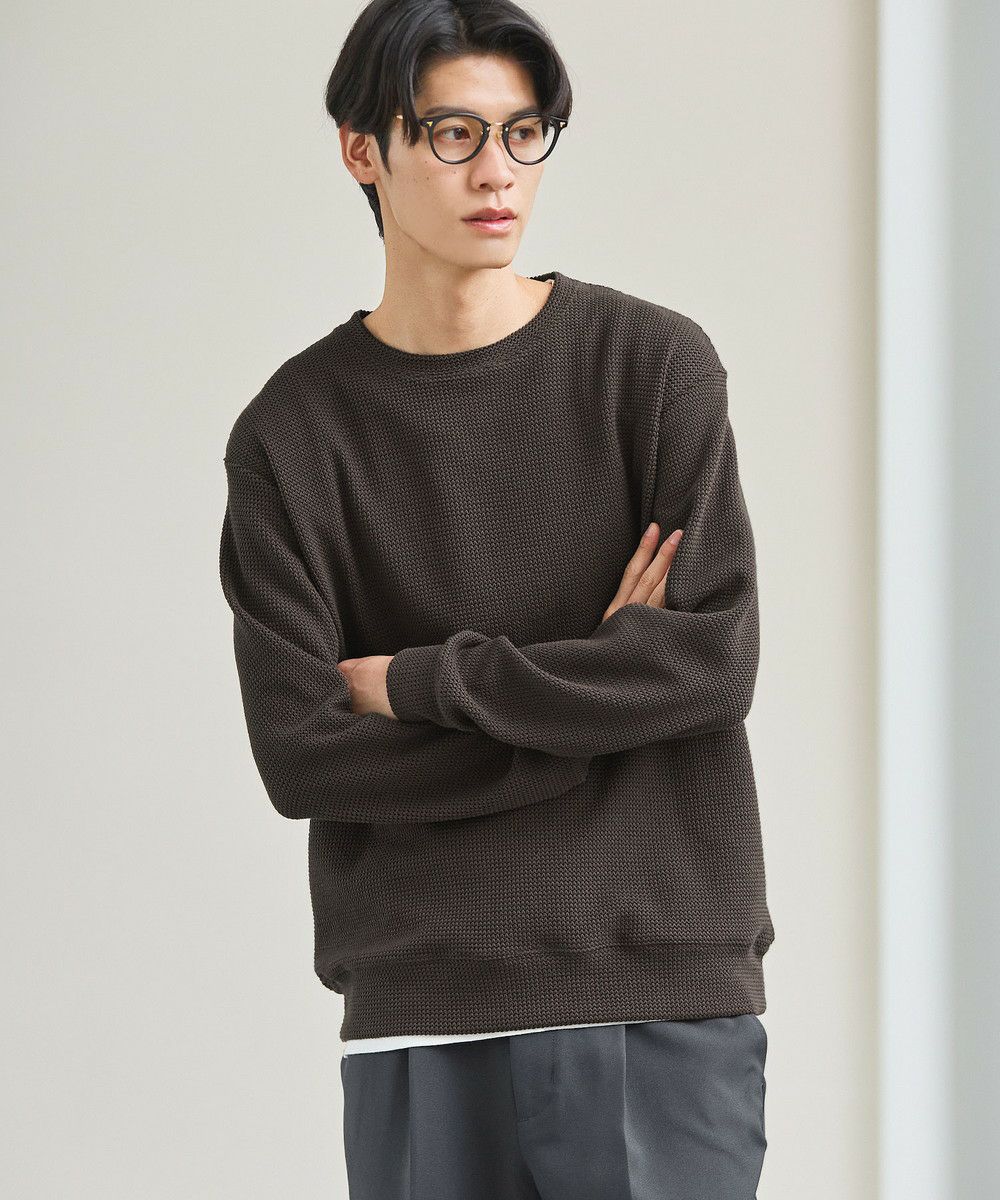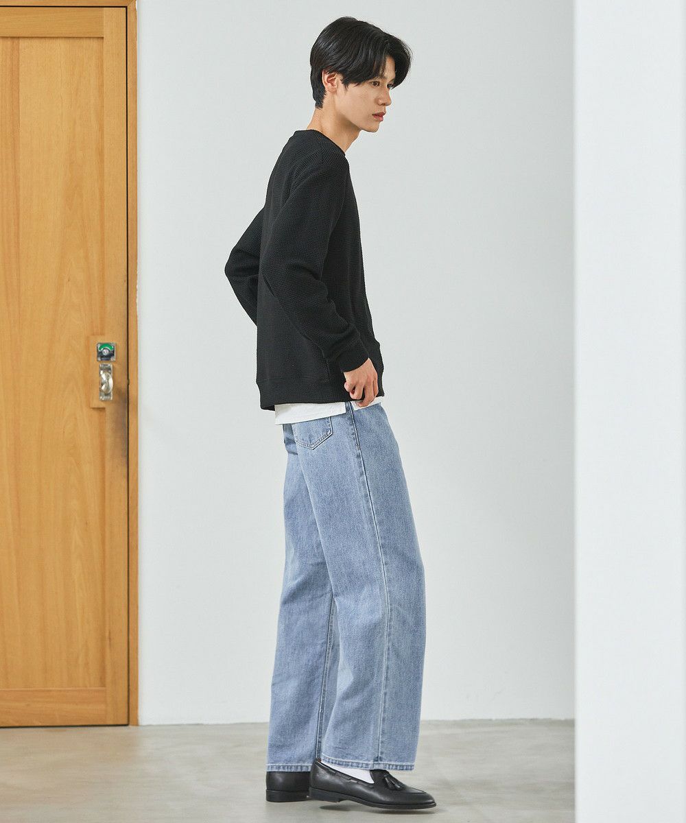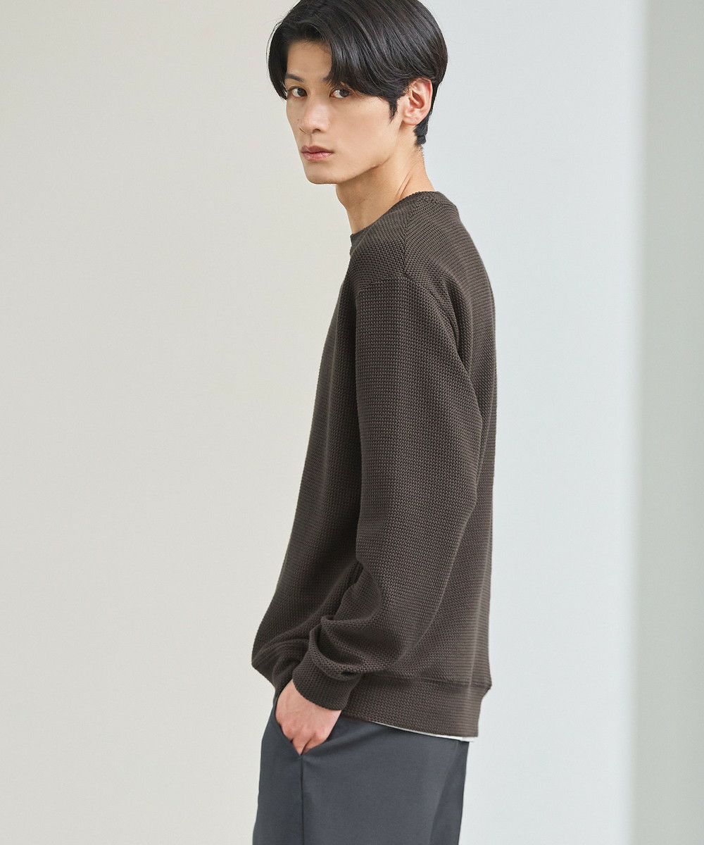メランジ(杢調)とシャギー感を併せ持った表情のあるクルーネックニットとの着用例。これくらいの表情感ならオフィスカジュアルとしても成立するのではないでしょうか。ウォーム感もあって、温かみのある着こなし。