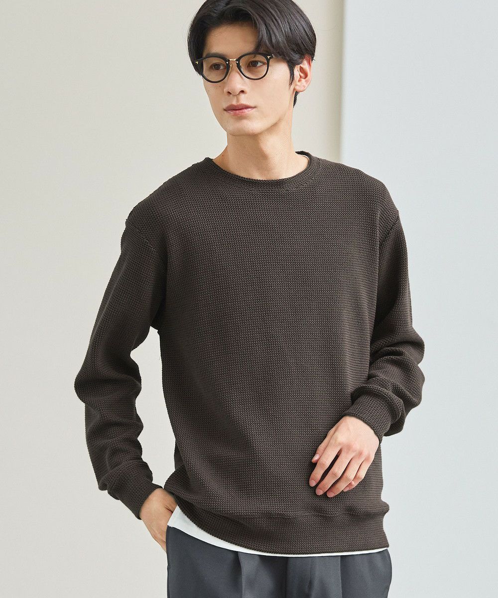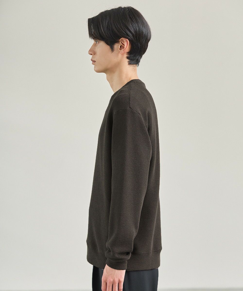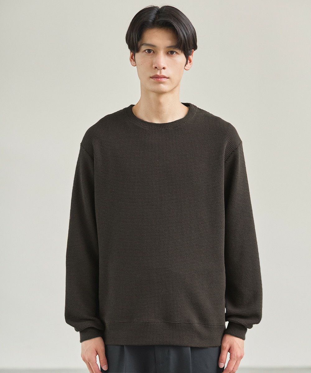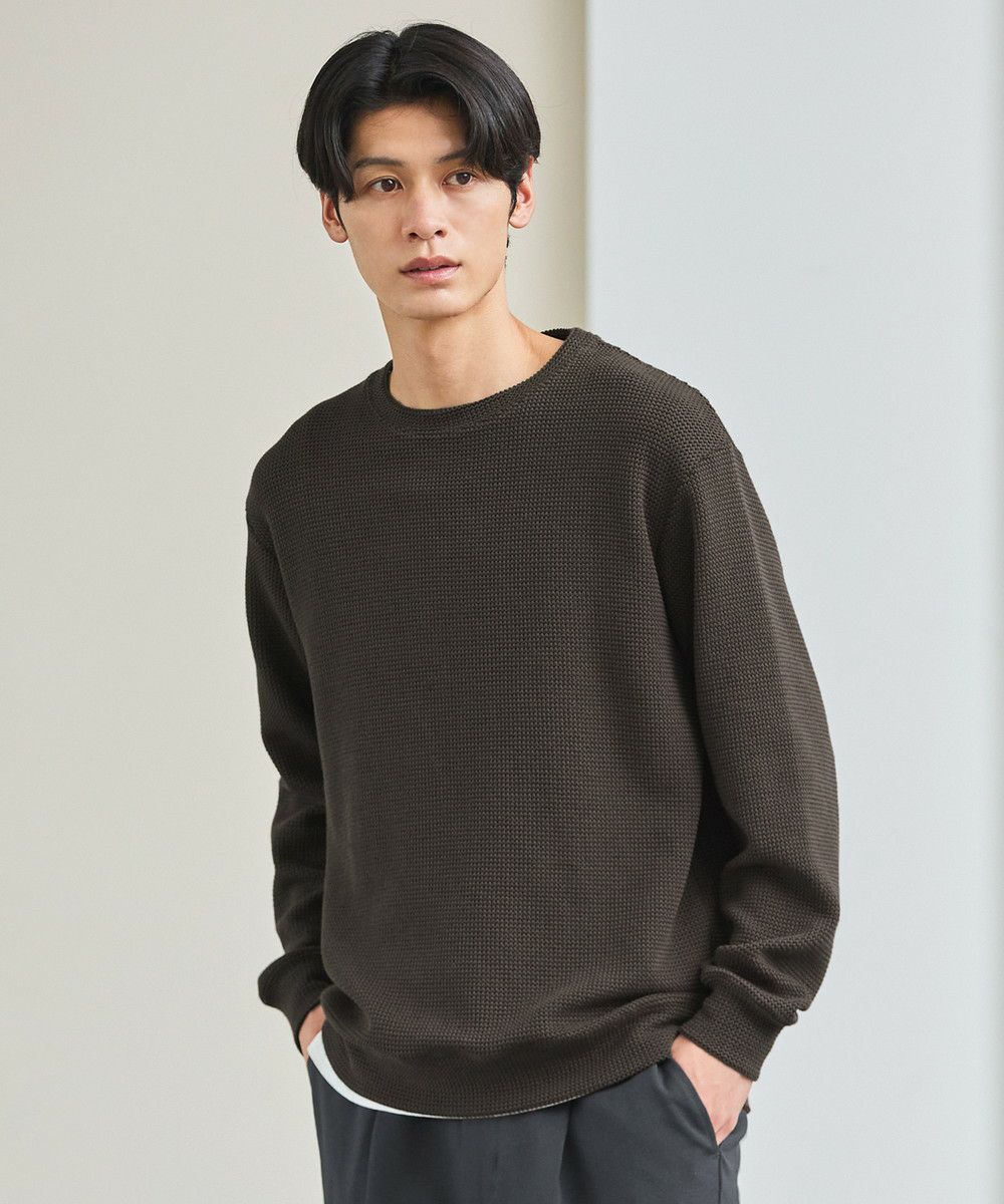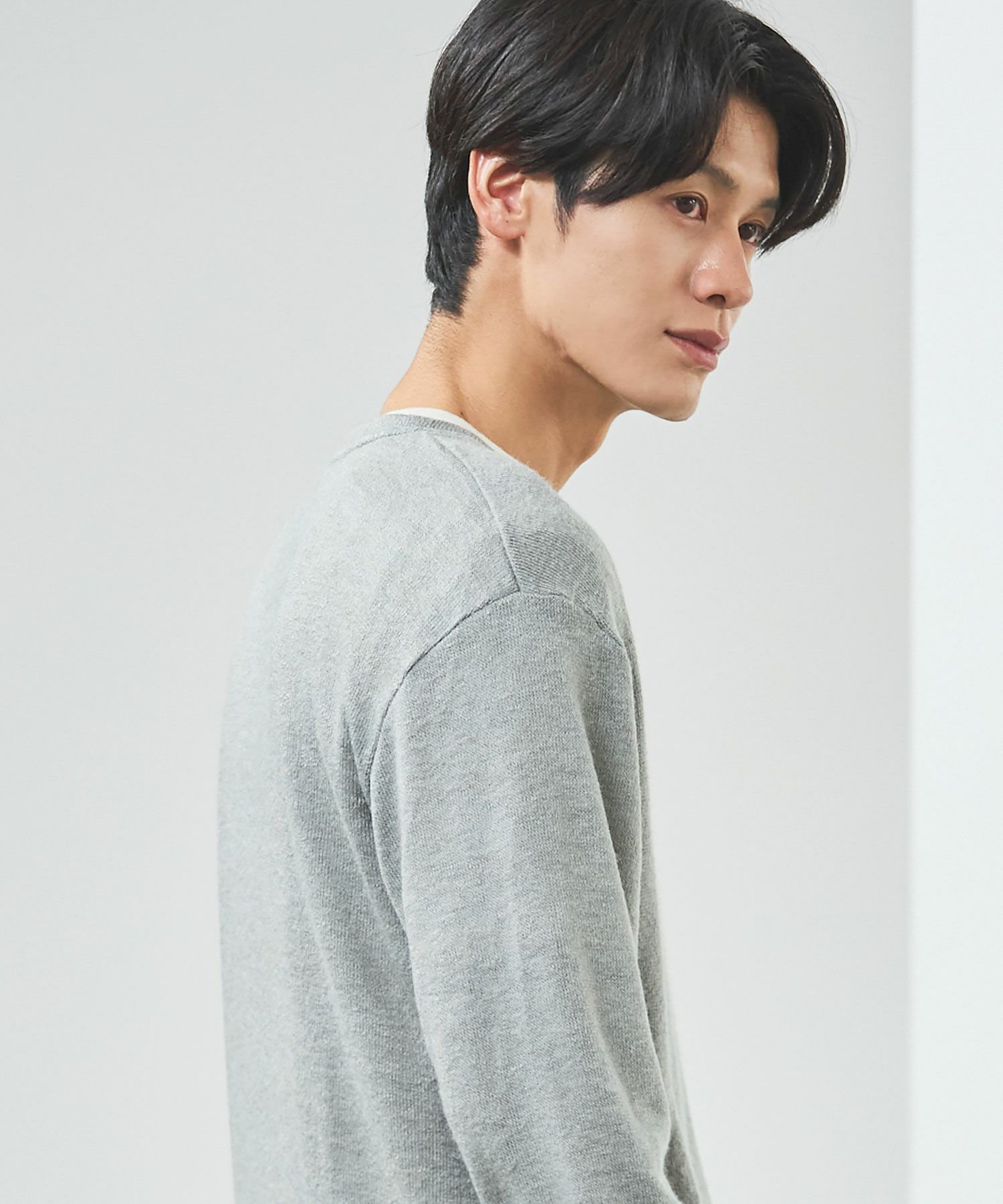 メランジ(杢調)とシャギー感を併せ持った表情のあるクルーネックニットとの着用例。これくらいの表情感ならオフィスカジュアルとしても成立するのではないでしょうか。ウォーム感もあって、温かみのある着こなし。