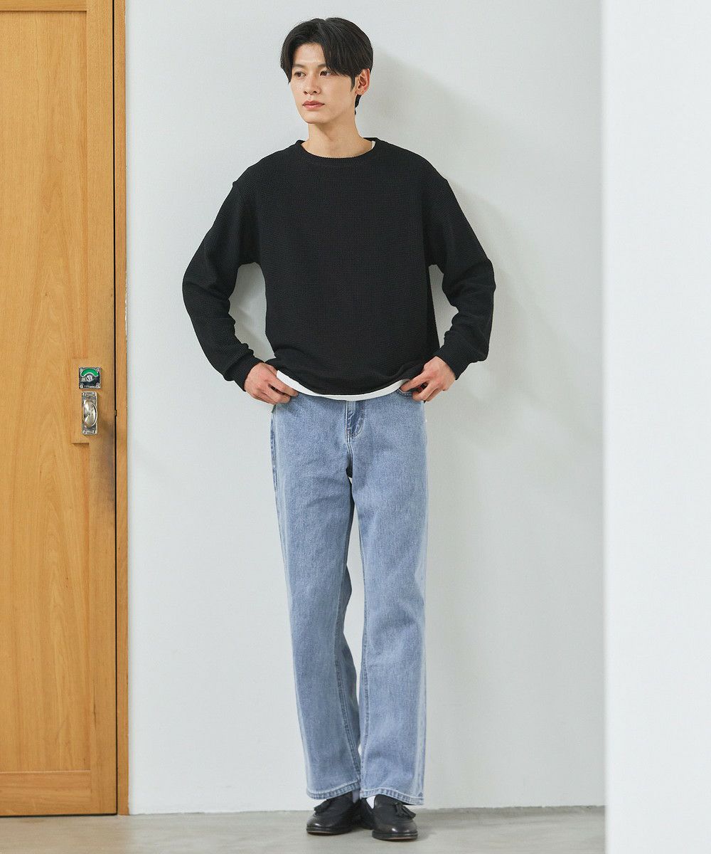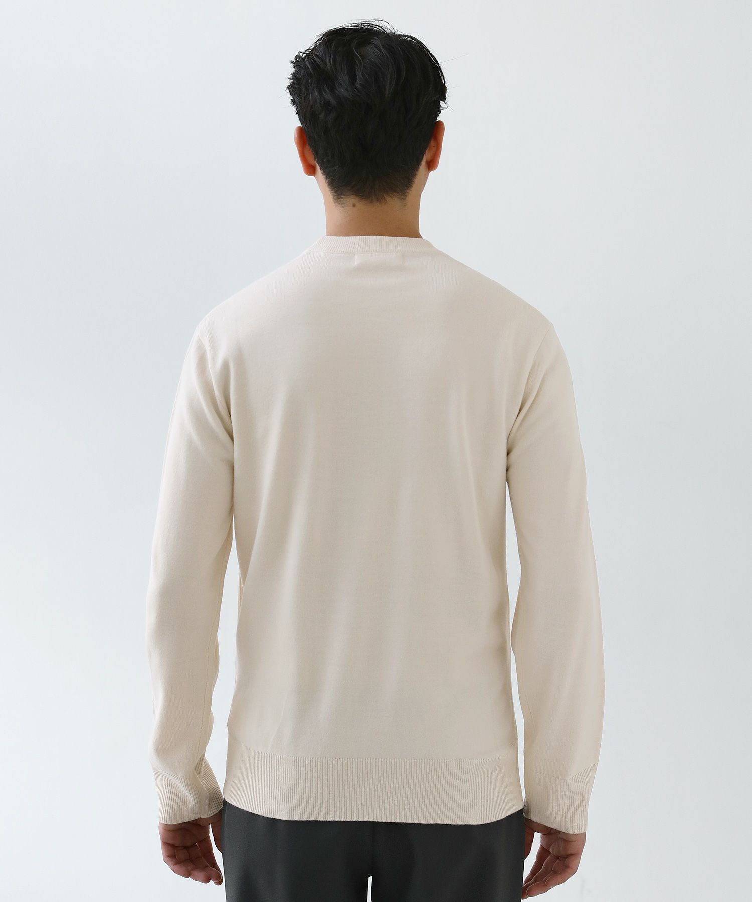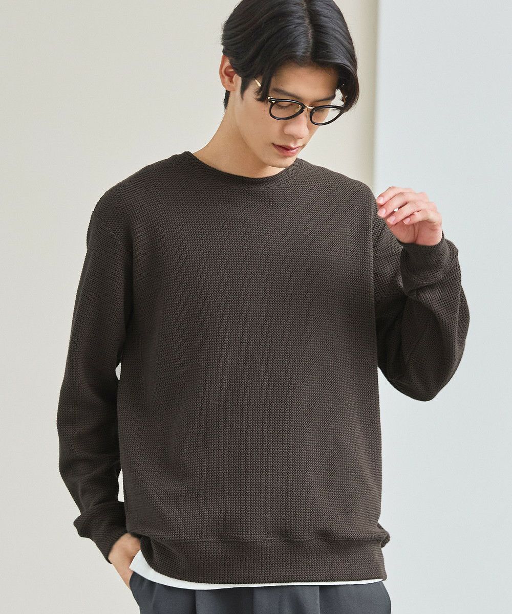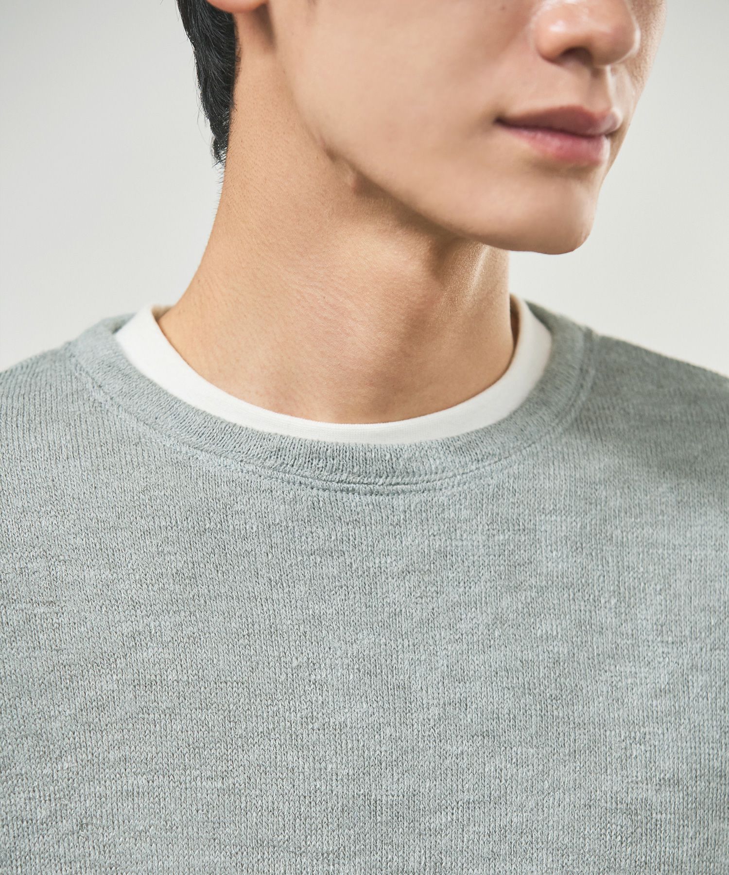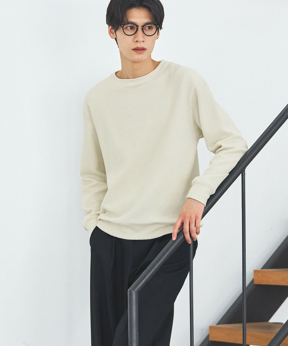 メランジ(杢調)とシャギー感を併せ持った表情のあるクルーネックニットとの着用例。これくらいの表情感ならオフィスカジュアルとしても成立するのではないでしょうか。ウォーム感もあって、温かみのある着こなし。