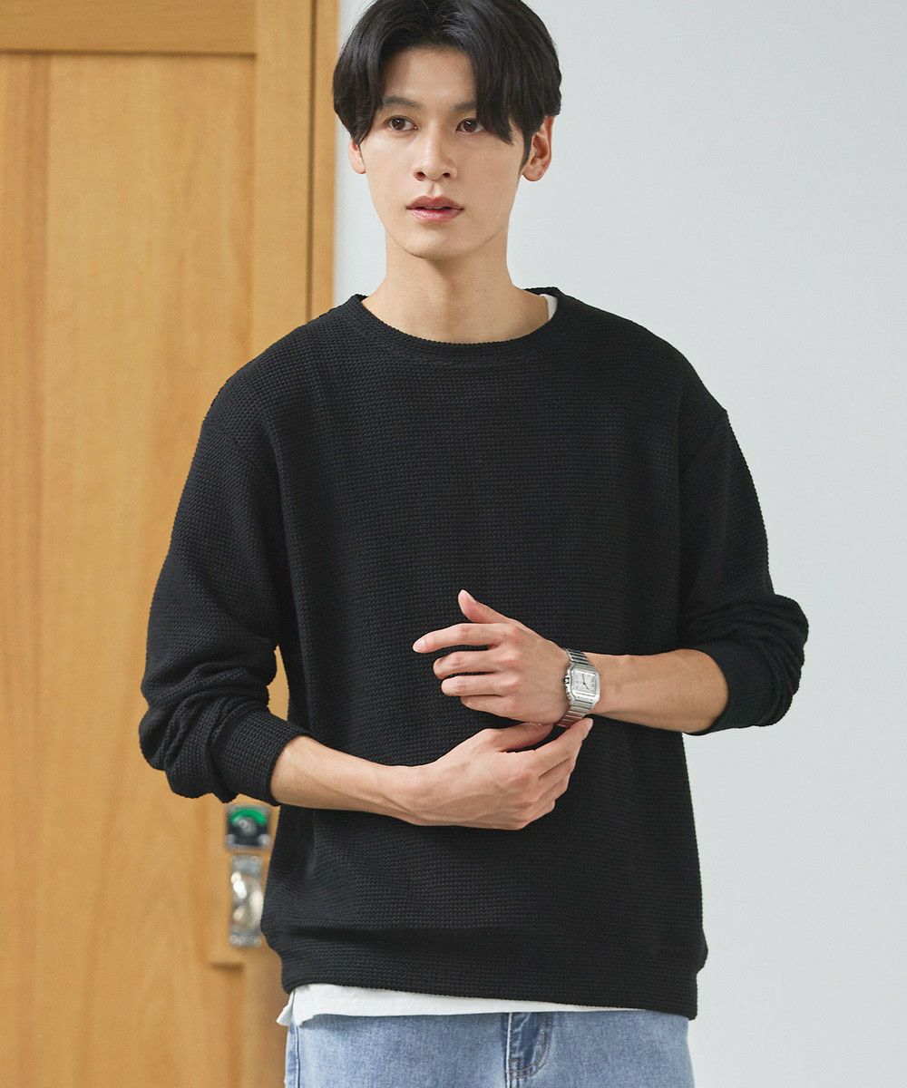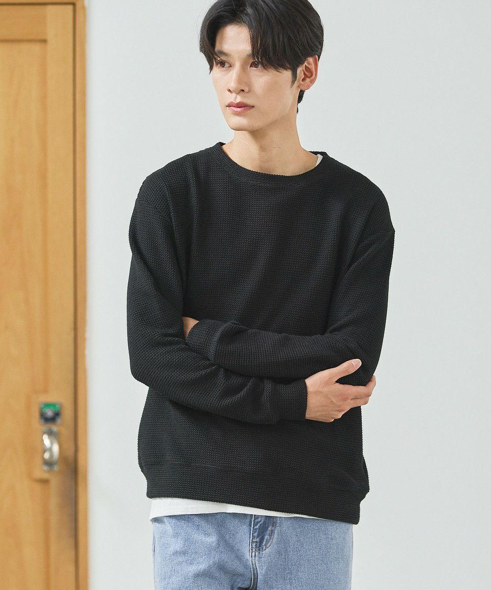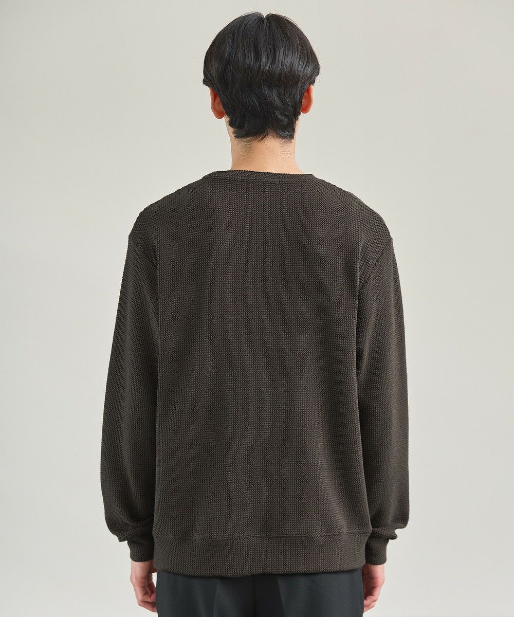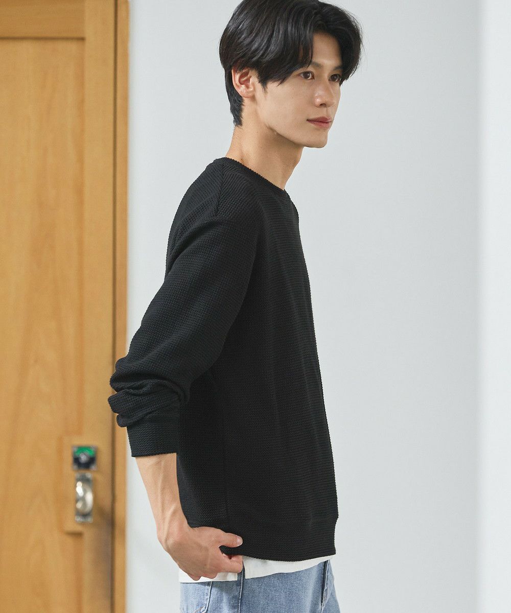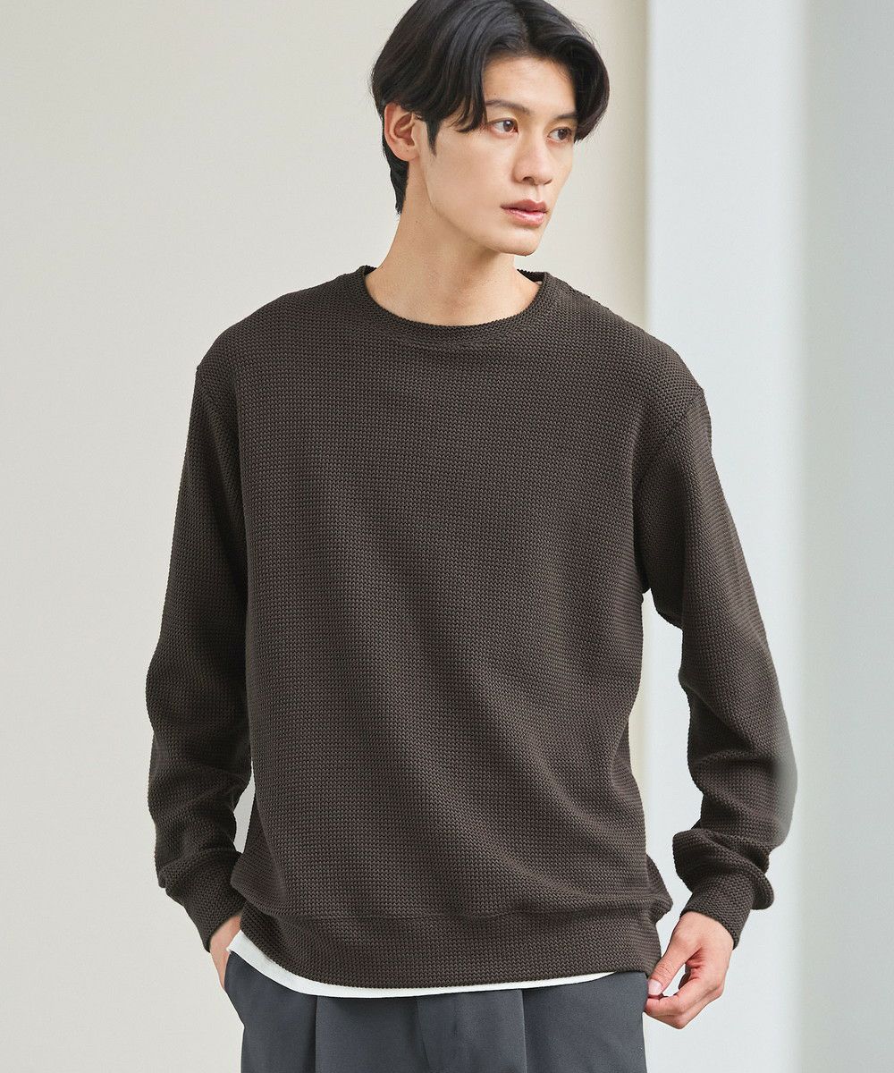 メランジ(杢調)とシャギー感を併せ持った表情のあるクルーネックニットとの着用例。これくらいの表情感ならオフィスカジュアルとしても成立するのではないでしょうか。ウォーム感もあって、温かみのある着こなし。