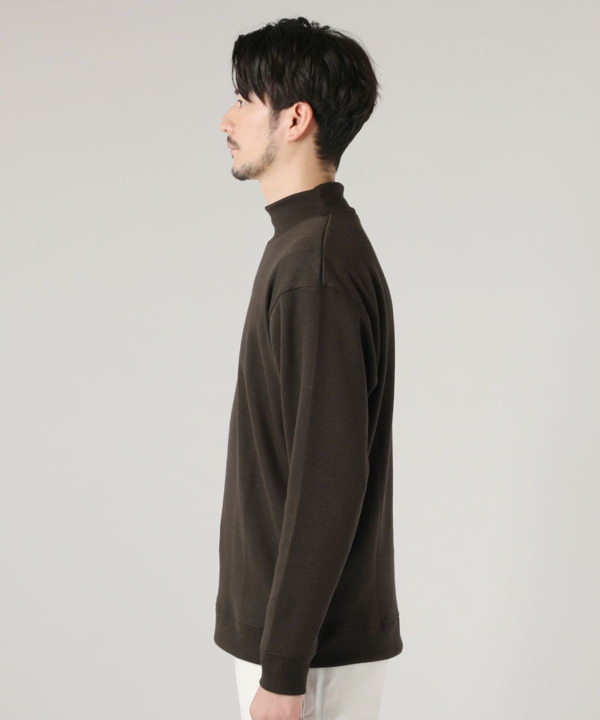 首元は折り返しの必要がないモックネック仕様。タートルネックほどボリューム感が出ず、アウターを重ねた際の首元のバランスをとってくれます。
