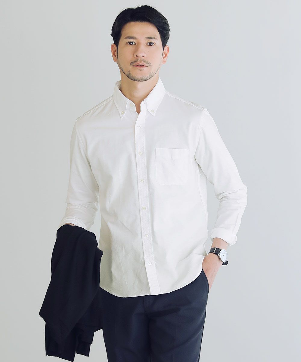 キレイめスタイルに欠かせないアイテム『シャツ』。定番なアイテムだからこそ、妥協のない上質な一着を選んでもらいたい、と考えてご用意したのがこちらのシャツです。キレイめスタイルに最適な美しいスリムシルエットで仕立てたオックスシャツ。高密度で織られた綿100%のオックスフォード地に、丁寧な日本の縫製が合わさって生み出された上質な国産の一着です。