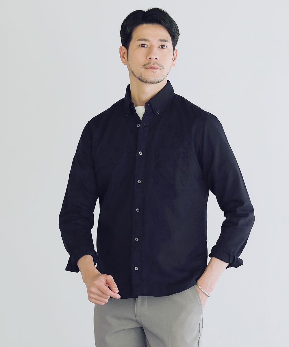 襟はボタンダウンカラーを採用しました。襟先がボタンで留められているボタンダウンならいつでも立体的でキレイな襟の形がつくられ、きちんと感が演出されます。前を開けて羽織り使いをするときにも、襟は美しい形のまま。キレイめコーデにサッと取り入れやすいデザインです。