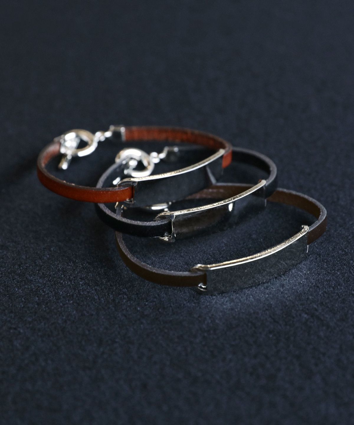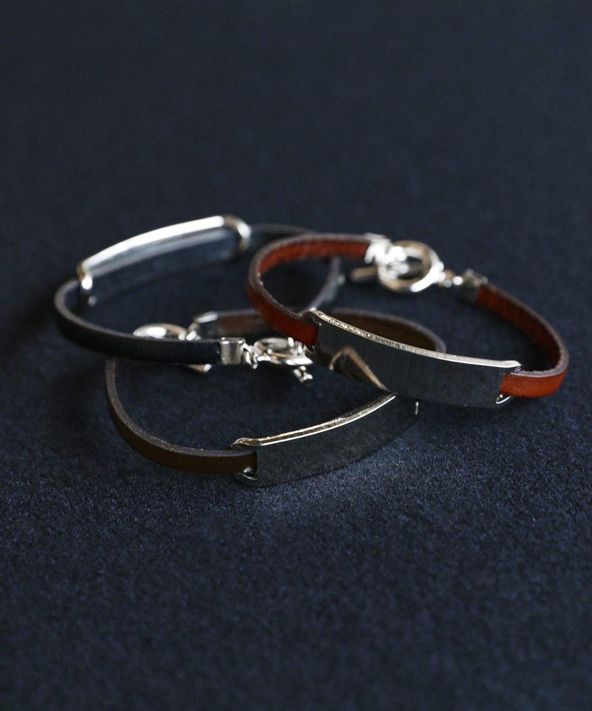 細めのイタリアンレザーに真鍮のプレートを施したブレスレット。マンテルパーツを使用したトレンドライクなデザインと、イタリアンレザーの品のある質感が大人のカジュアルコーデにマッチするアイテムです。信頼できる日本の職人によって、一点ずつ丁寧に作られたアイテムです。