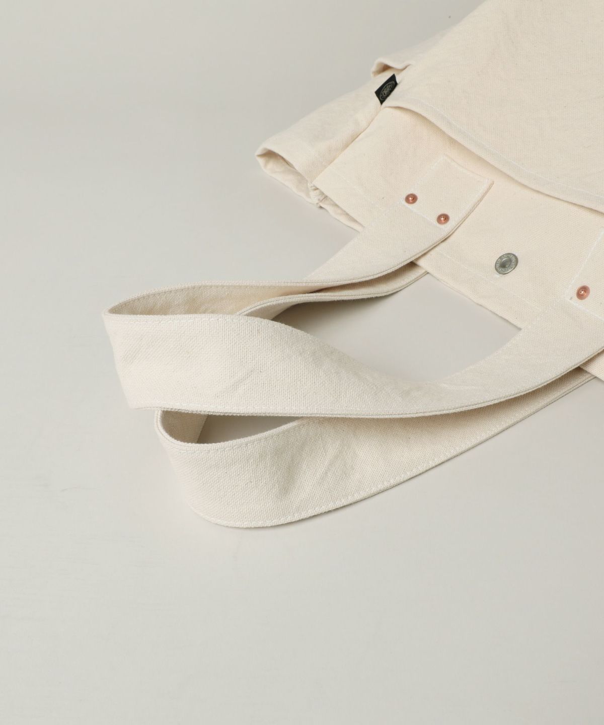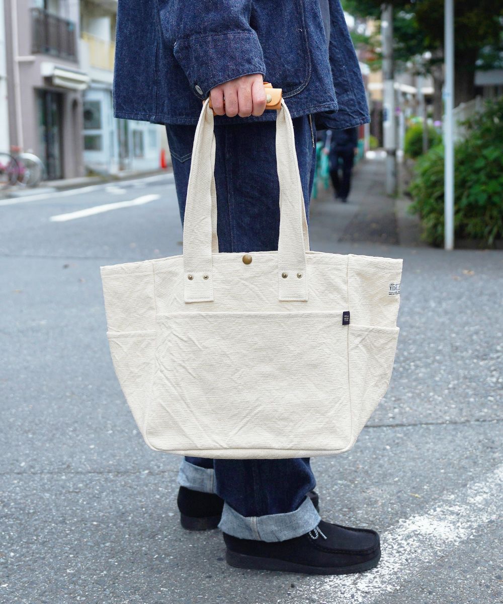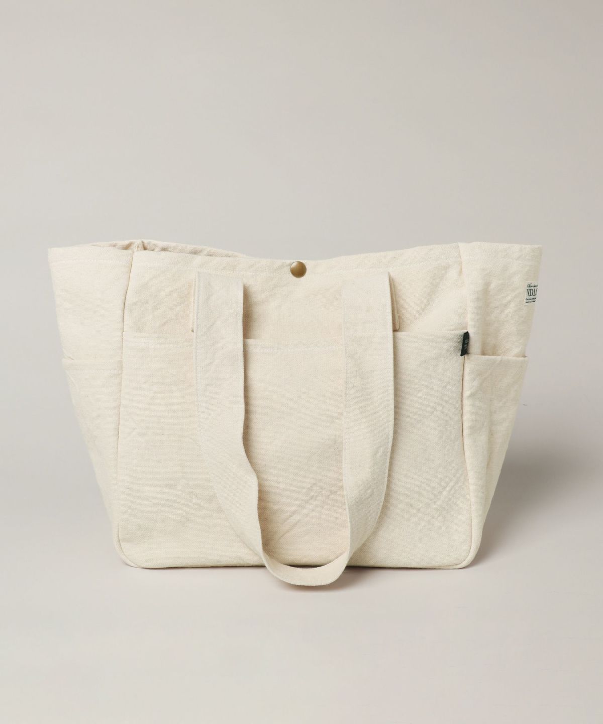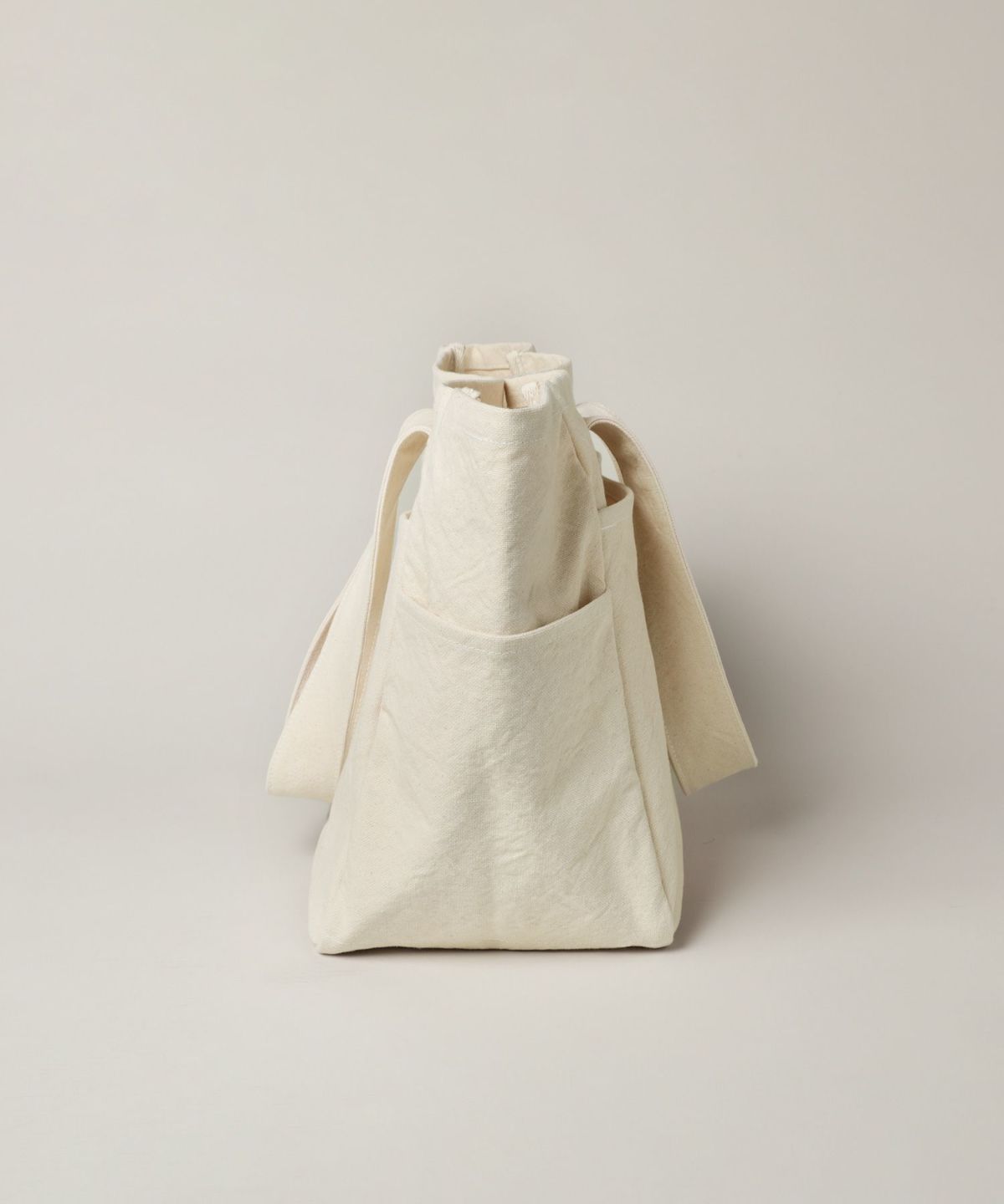 倉敷帆布を使った口が広く、マチも十分に確保したトートバッグ。メイン収納の容量はもちろんのこと、外側にも4つのポケットが付いて荷物の整理がしやすい仕様に。