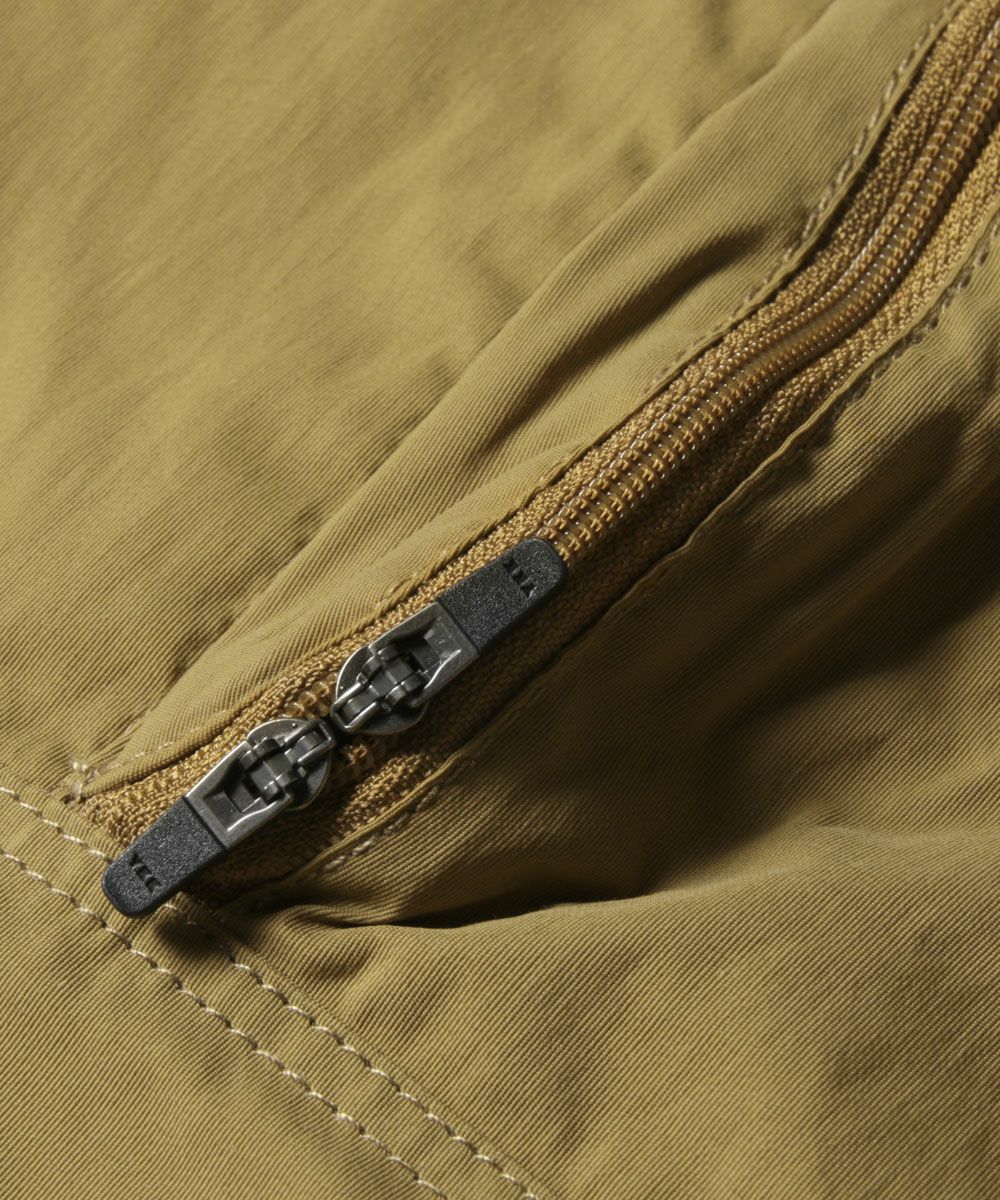 素材にはコットン60%とナイロン40%をブレンドした60/40クロスを使用。60/40クロスはアメリカのアウトドアブランドが1960年代に開発した素材で、湿気を吸うとコットンが膨張して水分の侵入を防ぎ、コットンより通気性が良くナイロンよりも磨耗に強いという特徴を備えています。更にフッ素樹脂をコーティングすることで優れた撥水・撥油性と防汚機能を生み出すテフロン加工を施しているので汚れも付きづらく手入れも簡単。生地本来の質感や柔軟性を損なわない、非常に機能的な生地に仕上がっています。