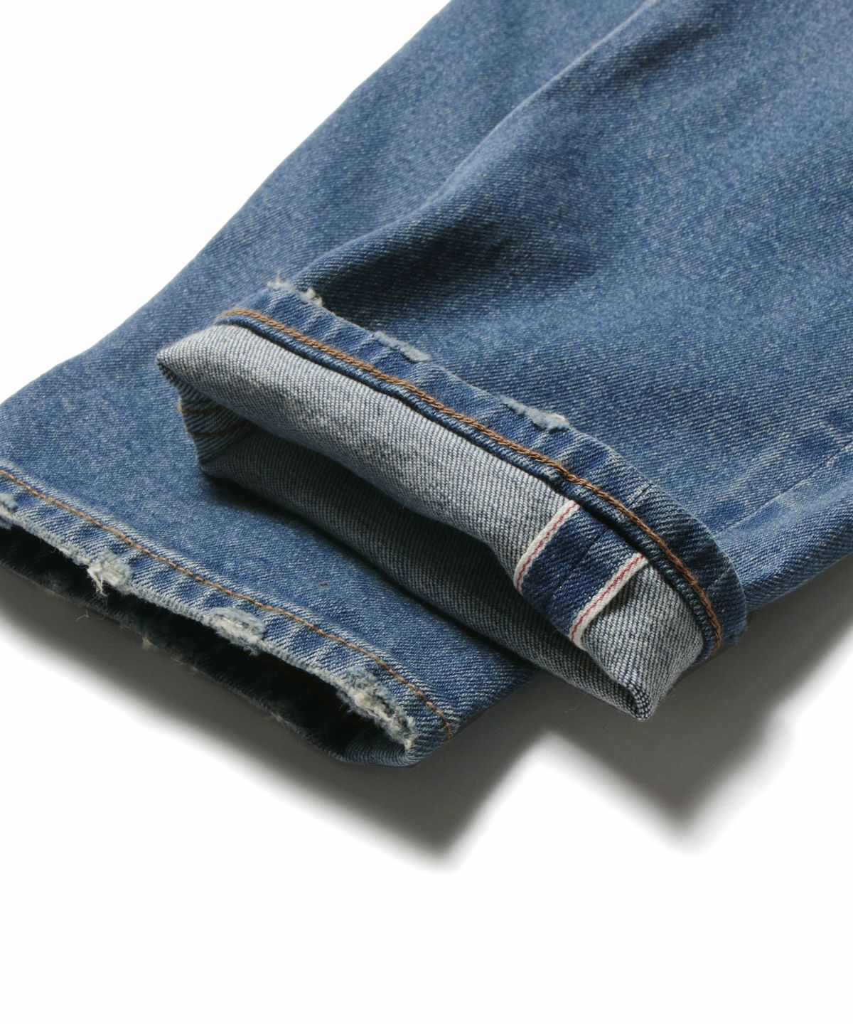 セルヴィッチとは、旧式力織機で織られるヴィンテージデニムのことで、高い技術によって生産されています。裾やポケットに施されたダメージや生地の色落ち、赤糸を使用したほつれ止めなど、独自の加工感が魅力的です。