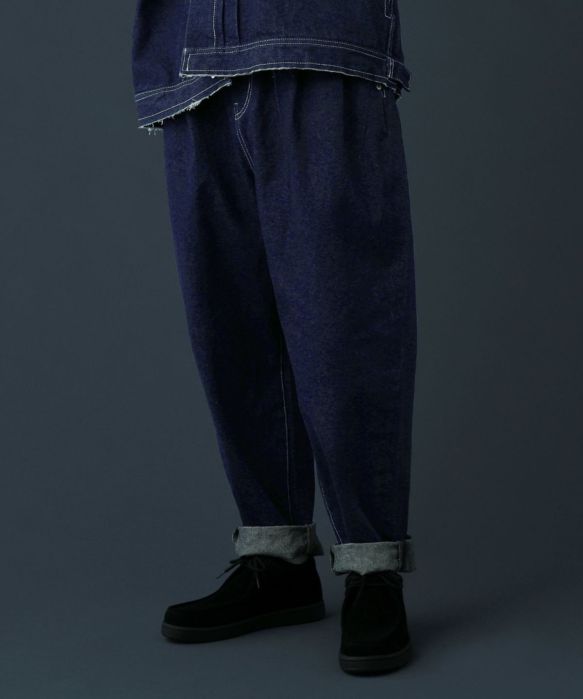 ゆったりとしたシルエットに、フロントの2タックと裾に向かって細身になるテーパードラインがメリハリプラス。後ろゴムのウエストで穿きやすく、程よいリラックス感を手軽に生み出してくれます。