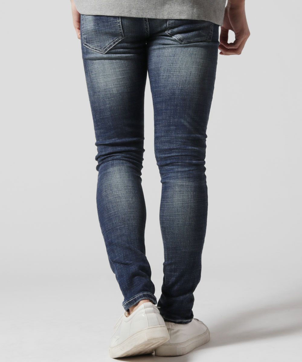 太さをあえて不揃いにした糸を使用するスラブ素材を使用。生地表面に独特の凹凸感を生み出します。随所に施されたウォッシュ加工やダメージ加工がヴィンテージ感を演出しており、穿き込むうちに風合いを増していきます。また、ストレッチ性が高いため履き心地も良いです。