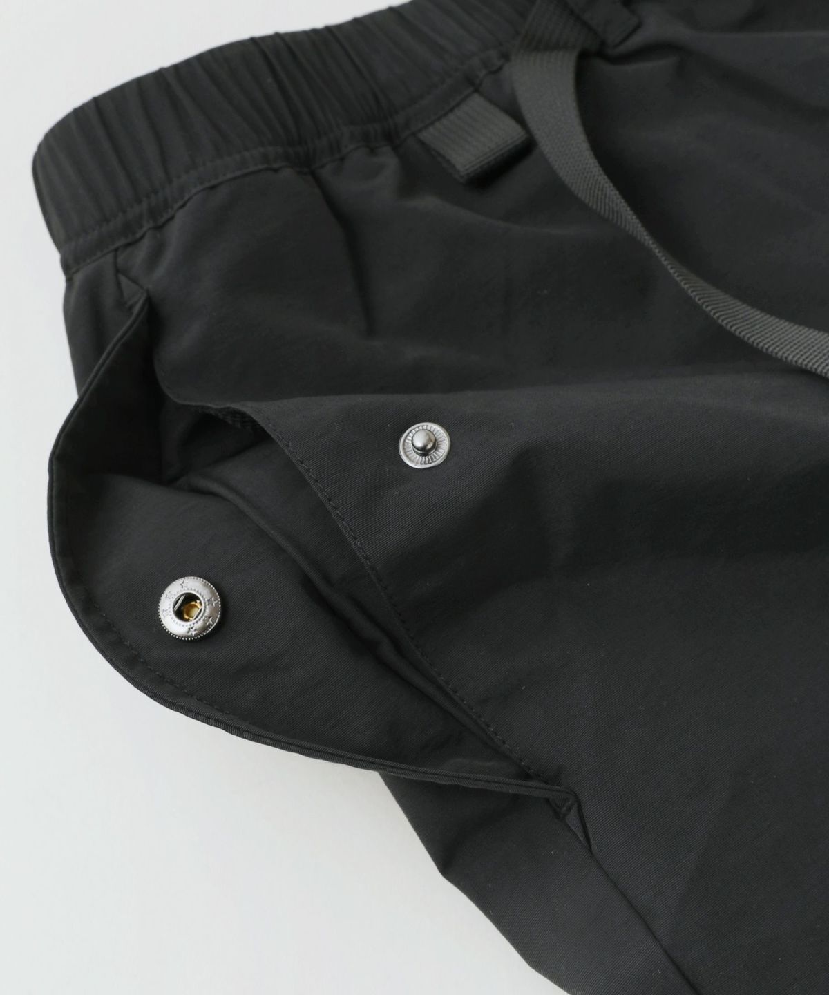 裏面は総メッシュ生地になっており、汗をかいたときなどに生地が肌に張り付いてしまうのを防いでくれます。ポケットにはスナップボタン付のフラップやポケット口のファスナーを取り付け、中に入れたものが落ちてしまわないようなつくりにしました。ウエストはゴムウエストなだけでなく、細かな調節を可能にするグログランテープベルトも付けています。随所に機能面を考慮したディテールが光るパンツです。裾にドローコードも付けているので、絞ってシルエットを変化させての着回しもお楽しみいただけます。