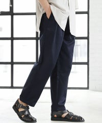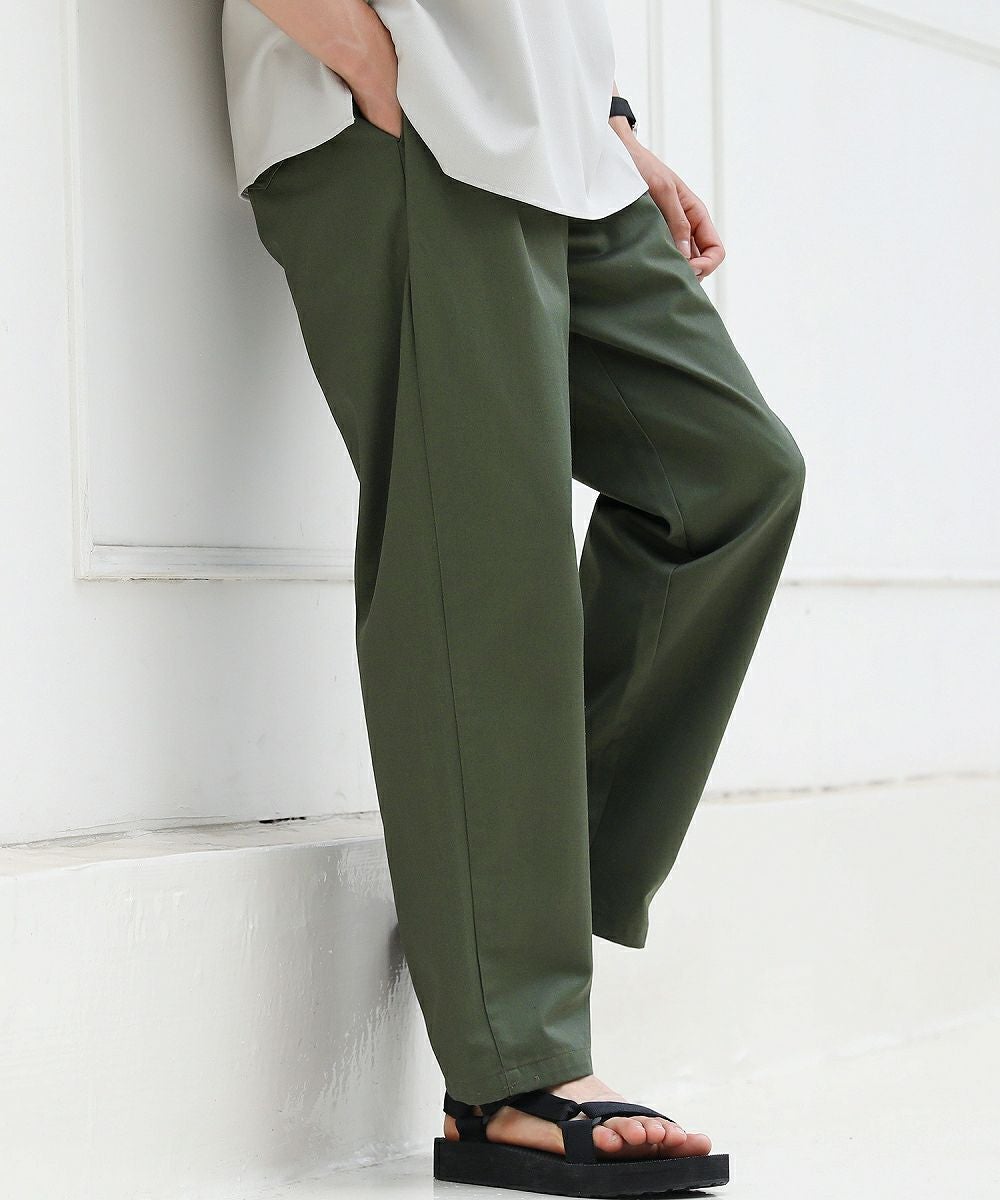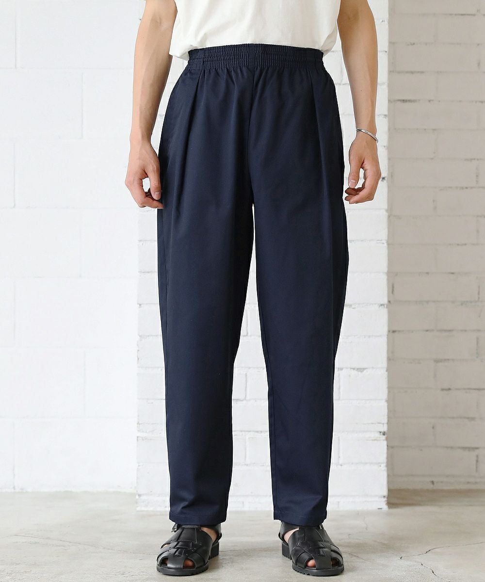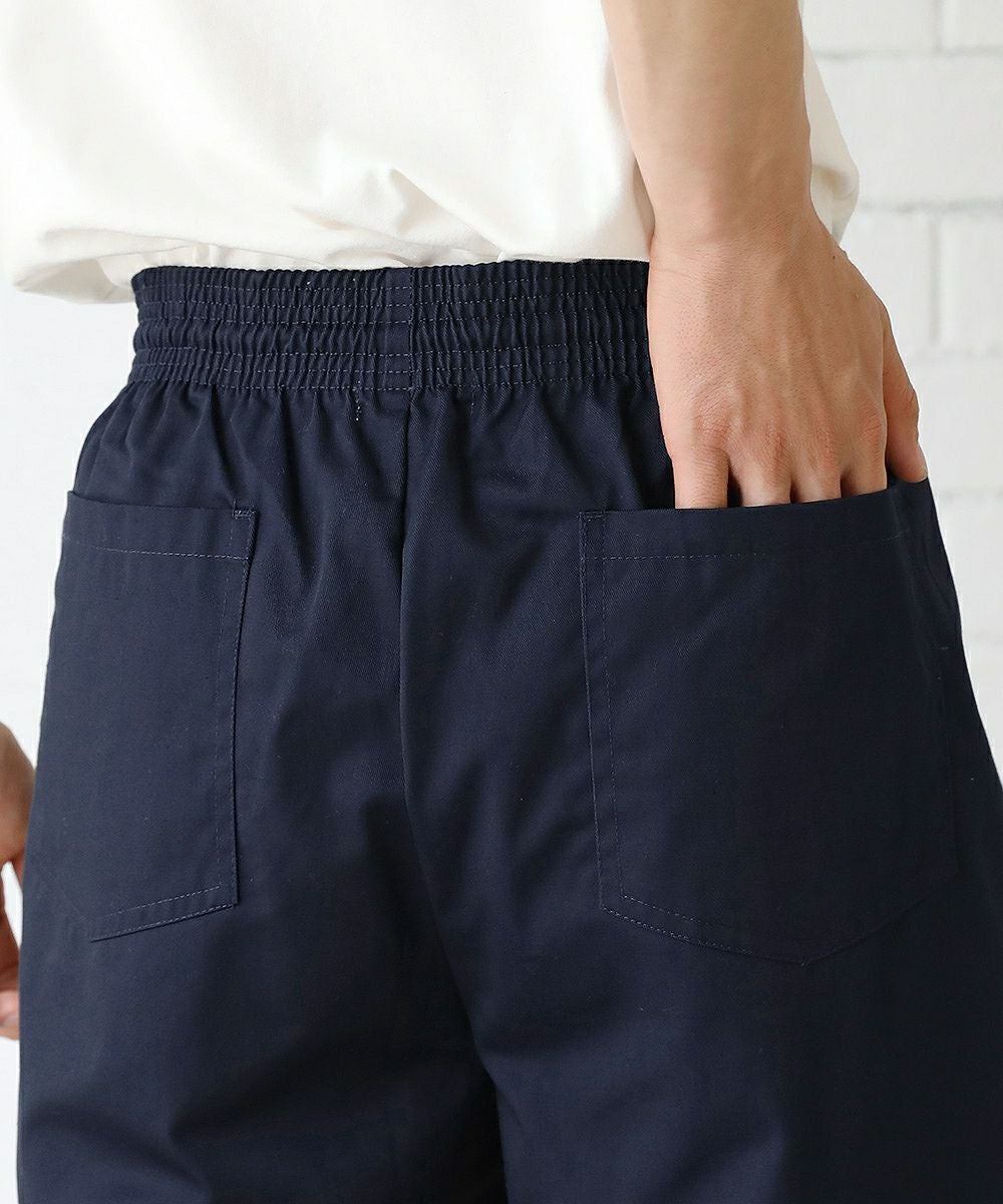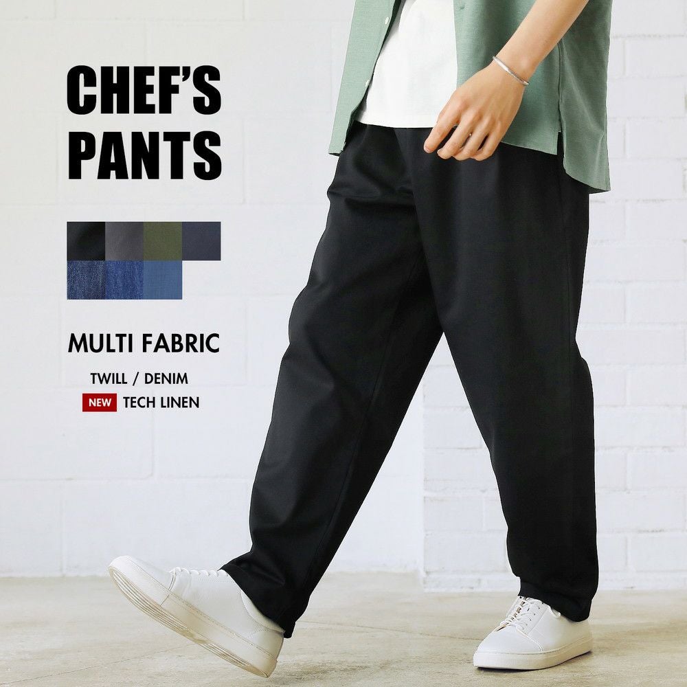 スタイルに左右されることなく穿くことができるゆったりシルエットのパンツ。シェフが厨房で着用していたワークパンツをベースにデザインしています。動きやすいようにシルエットにはしっかりとゆとりを持たせていますが、ウエスト部分をゴムと調節用の紐を入れたイージー仕様にしているためずり落ちてくる心配はありません。『痩せ型な人も筋肉質な人も穿けるボトムス』。体型問わず、幅広い方々に穿いていただけるように作られた一本です。