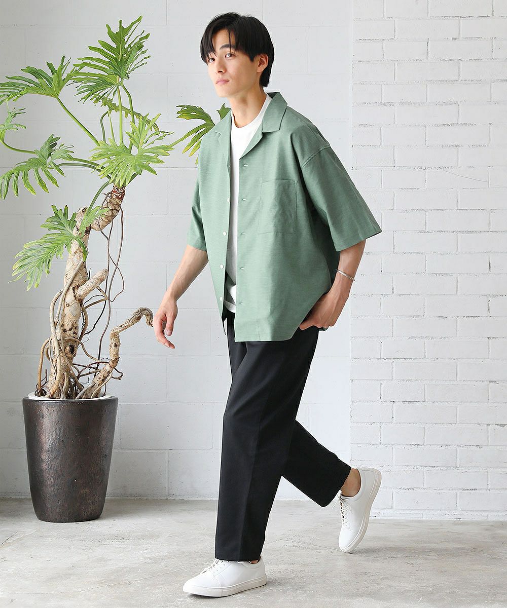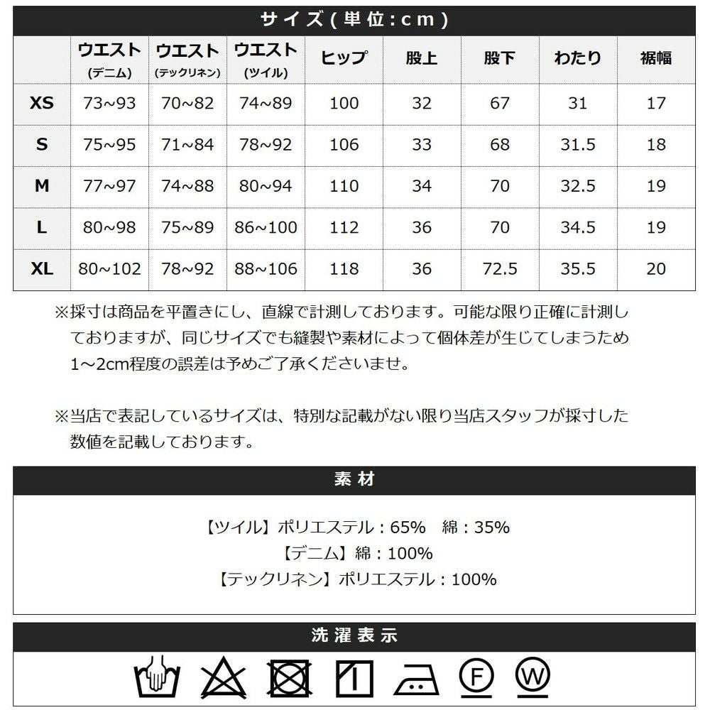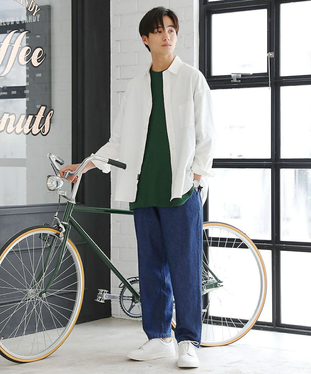 着こなしに応じて選べるように複数の生地でご用意いたしました。ポリエステルと綿を混紡した丈夫な『ツイル生地』。綿100%の柔らかめな『デニム生地』の2種類。 さらに2023年夏からはもう1種類、新素材『テックリネン生地』が仲間入り。ポリエステル100%でありながら麻の生地のような涼し気な風合いを再現しています。本当の麻のようなごわつき感はなく、肌触りの良いさらりとした質感です。 同じシルエットであっても生地が異なるだけで見え方も大きく変化します。生地違いで複数着揃えていただくのもおすすめです。