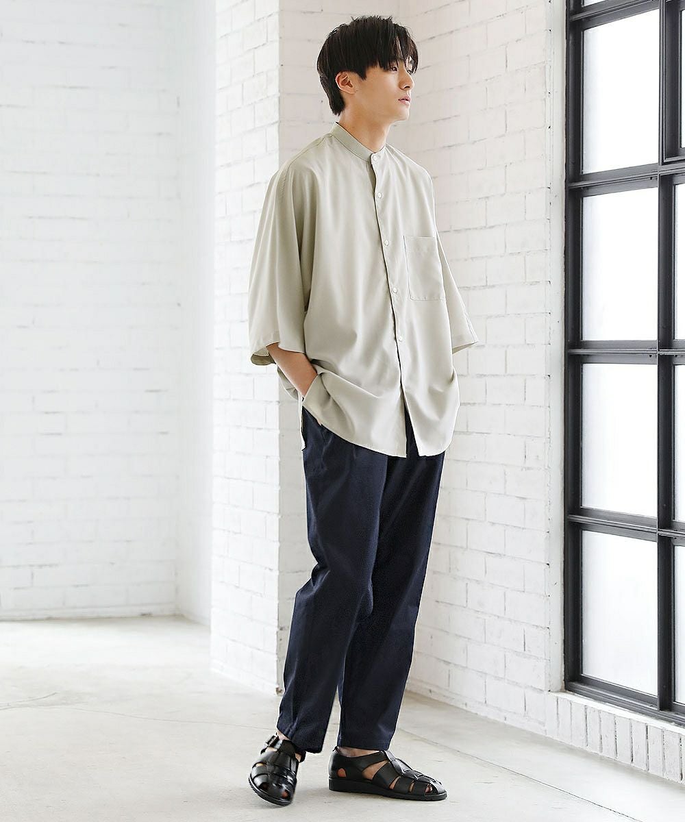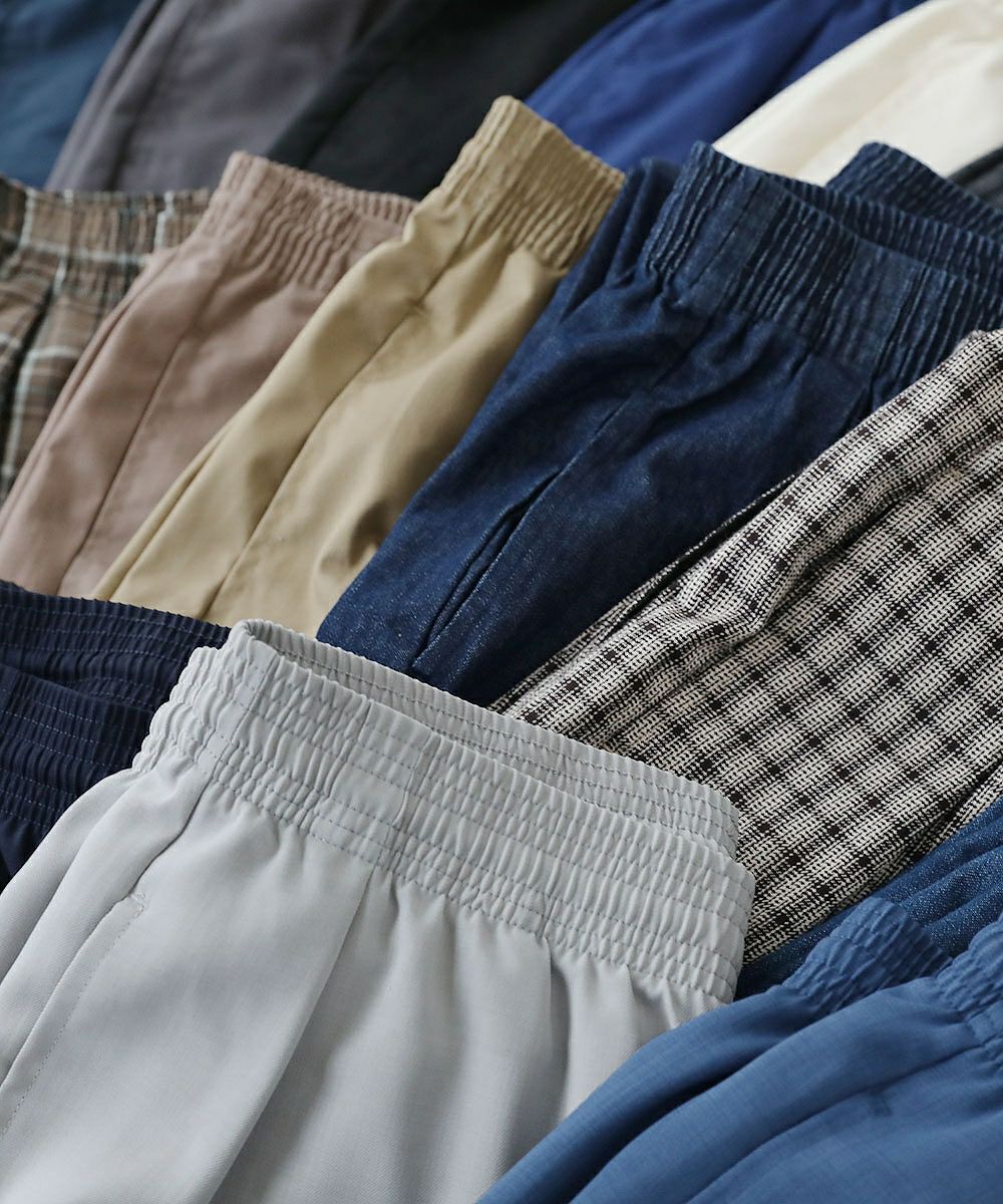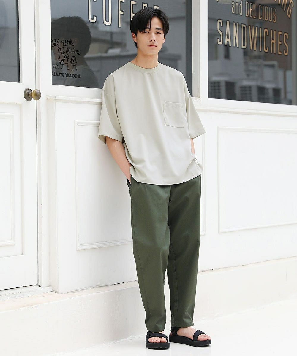 着こなしに応じて選べるように複数の生地でご用意いたしました。ポリエステルと綿を混紡した丈夫な『ツイル生地』。綿100%の柔らかめな『デニム生地』の2種類。 さらに2023年夏からはもう1種類、新素材『テックリネン生地』が仲間入り。ポリエステル100%でありながら麻の生地のような涼し気な風合いを再現しています。本当の麻のようなごわつき感はなく、肌触りの良いさらりとした質感です。 同じシルエットであっても生地が異なるだけで見え方も大きく変化します。生地違いで複数着揃えていただくのもおすすめです。