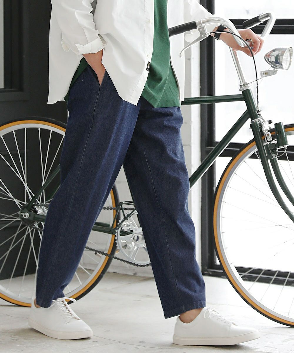一番の魅力は、窮屈感のない穿き心地にあります。腰から裾まで充分ゆとりを持たせたシルエットで締め付け感がなく、自転車に乗るのもラクラクです。さらにウエストは全周ゴムを入れて、脱ぎ穿きの楽なイージー仕様に。内側の紐で締め加減の細かな調節も可能です。思わず毎日でも穿きたくなるようなストレスフリーな穿き心地となっております。